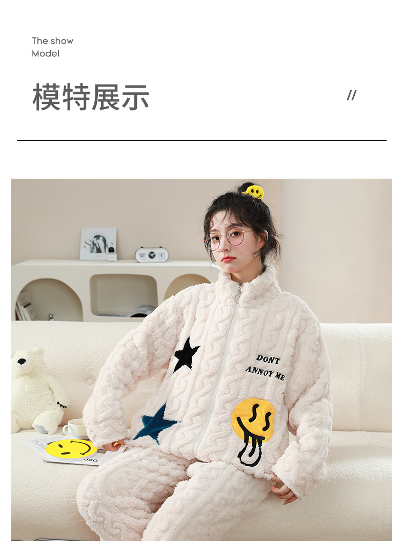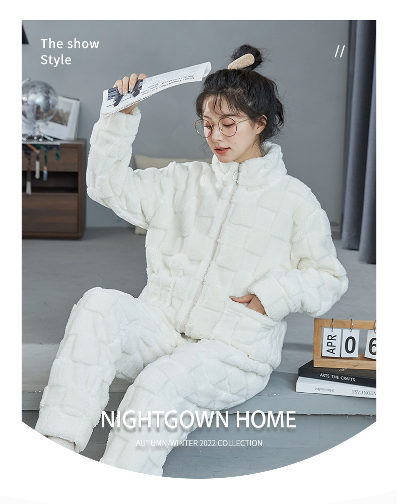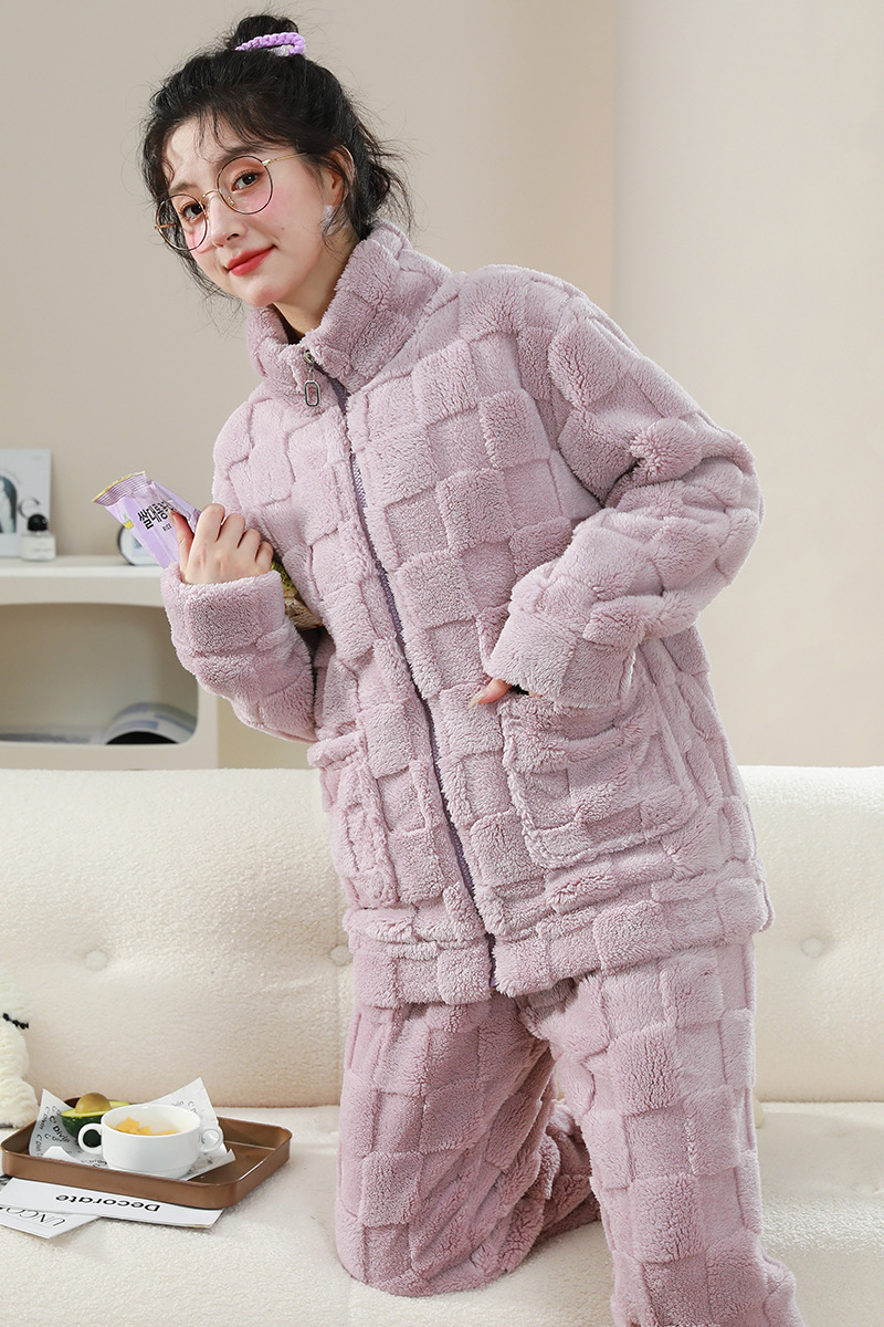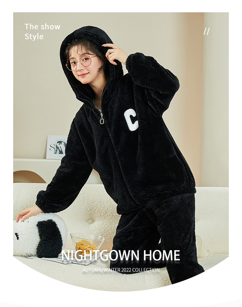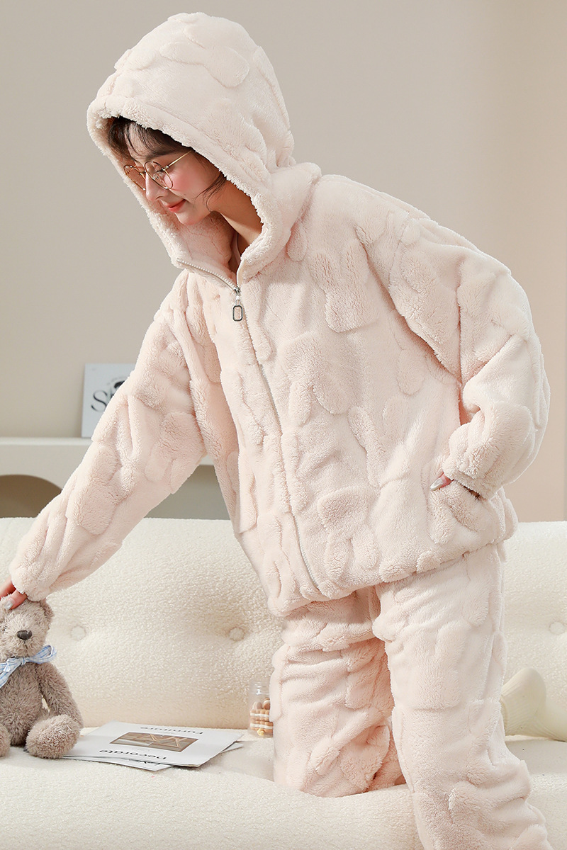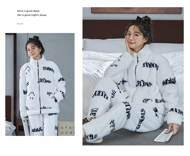 【拉链珊瑚绒家居服套装】可外穿睡衣秋冬季法兰绒加厚立领连帽