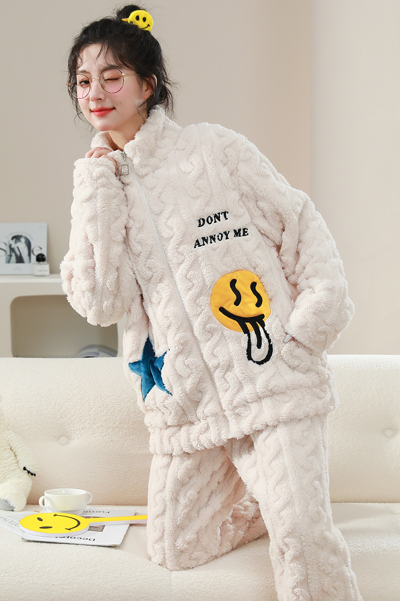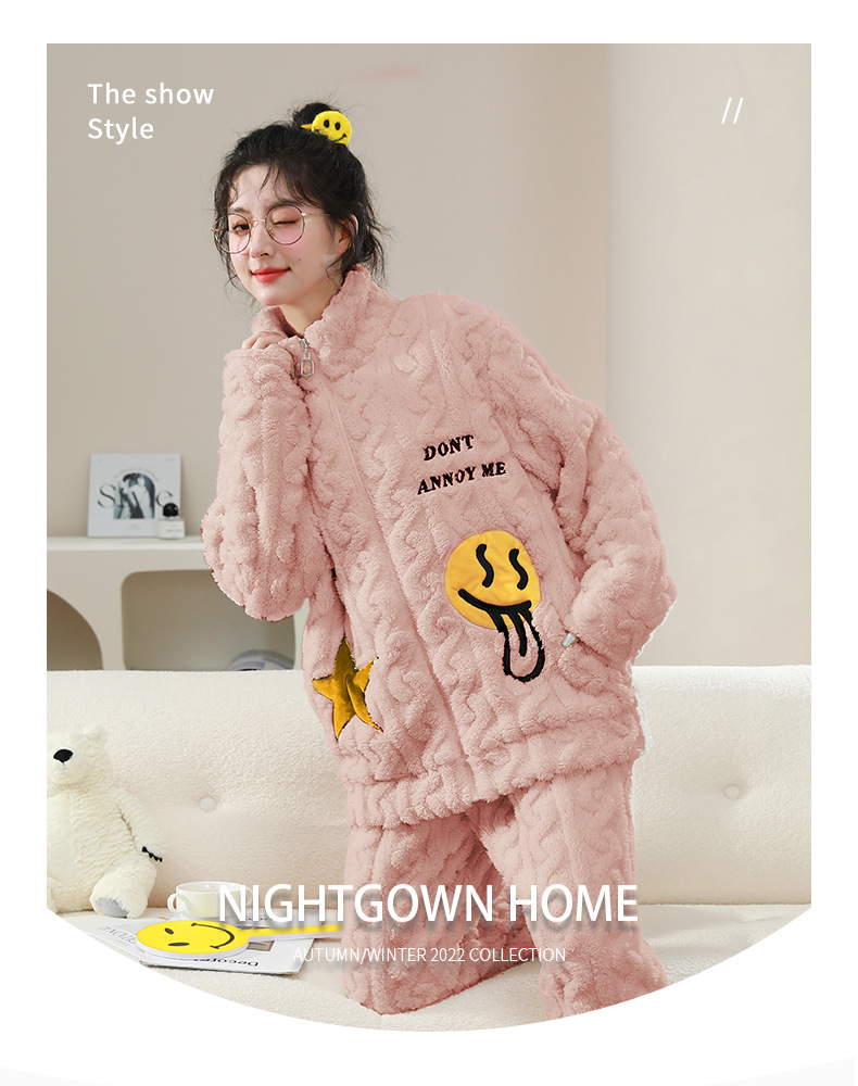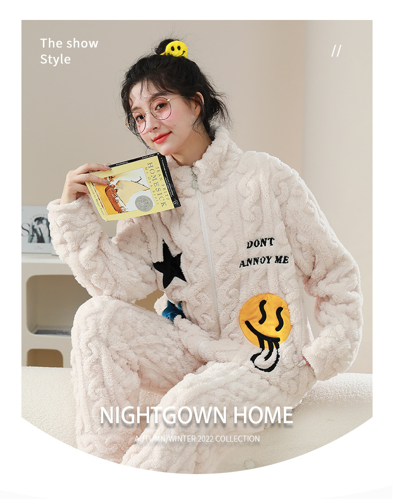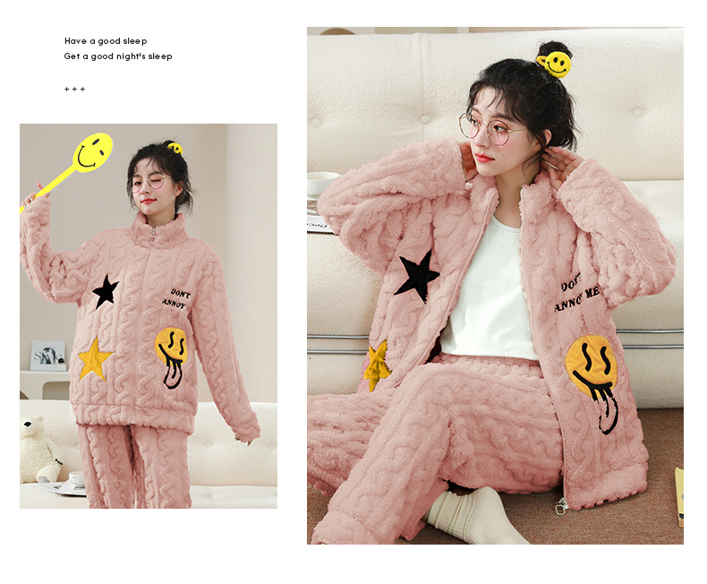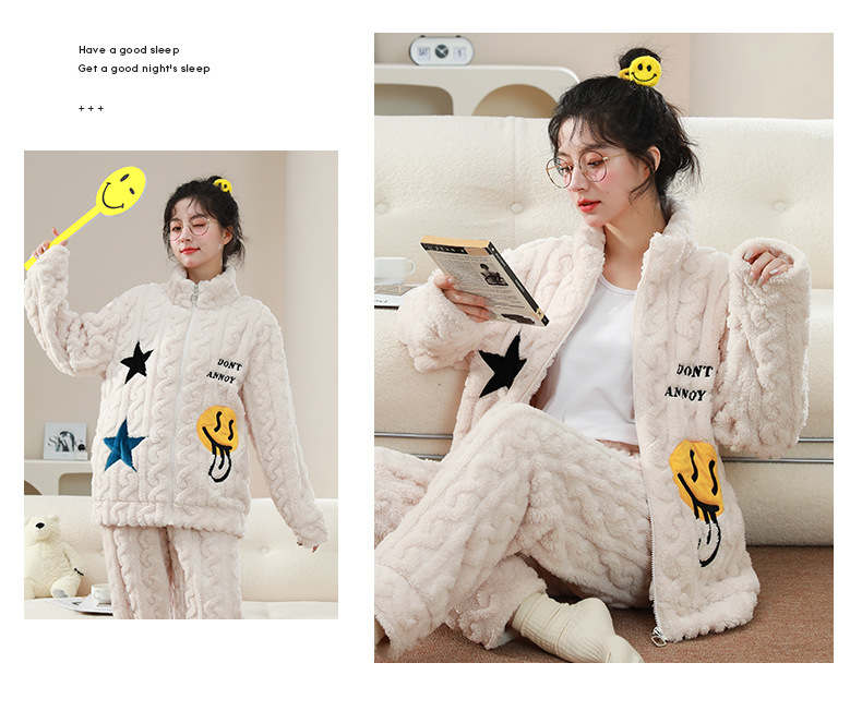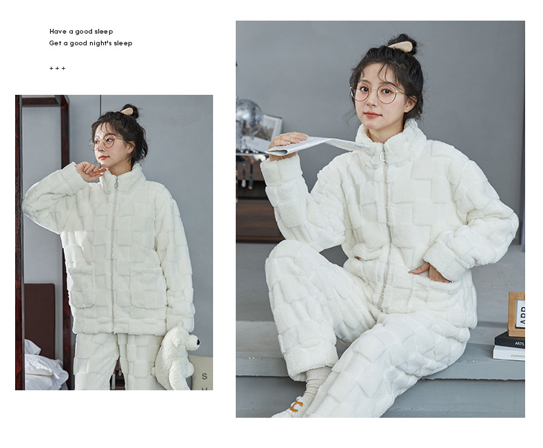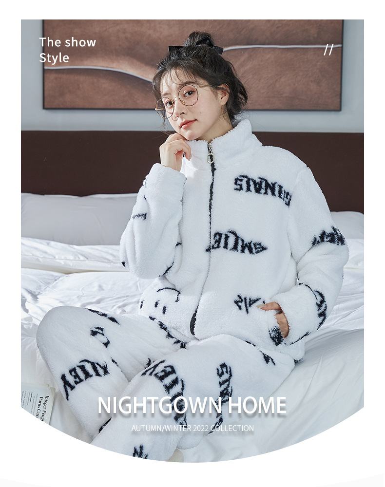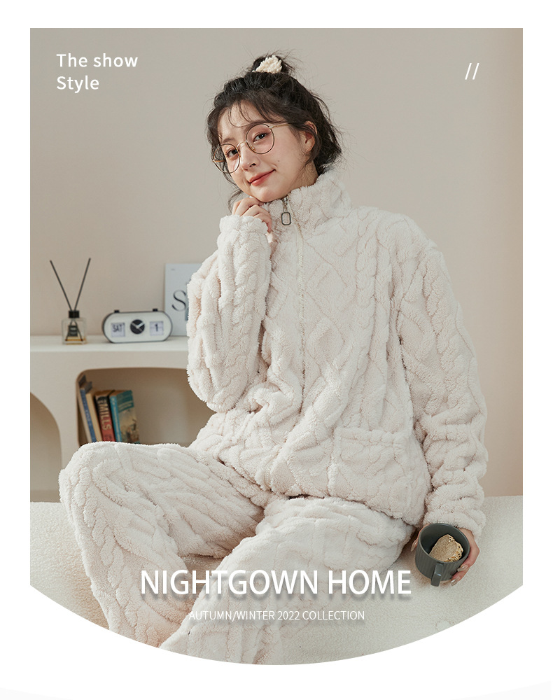 【拉链珊瑚绒家居服套装】可外穿睡衣秋冬季法兰绒加厚立领连帽