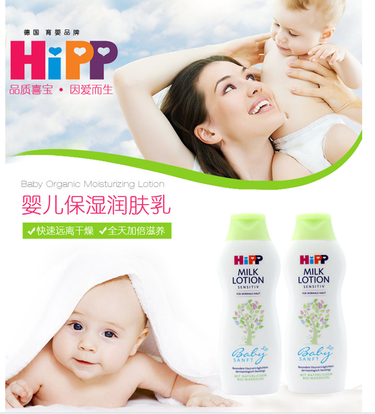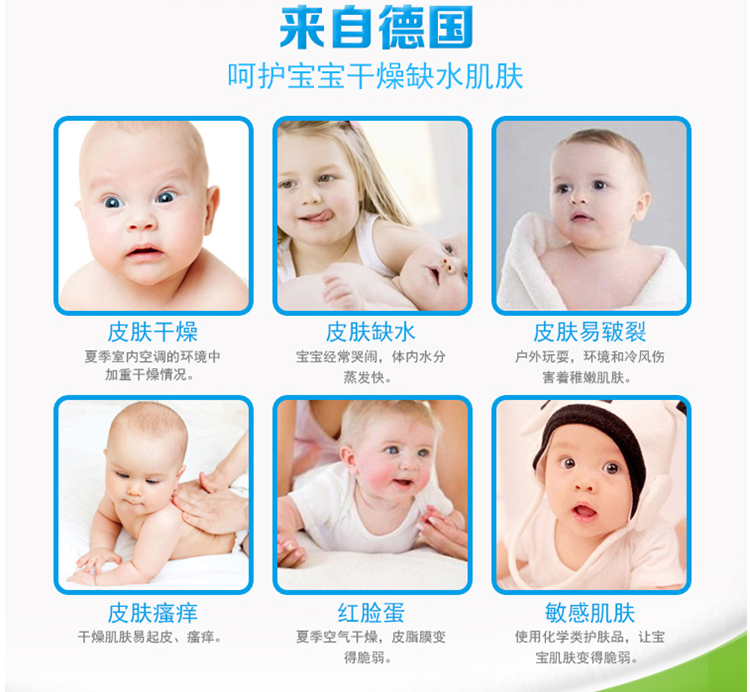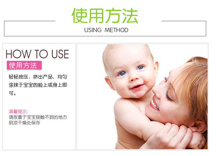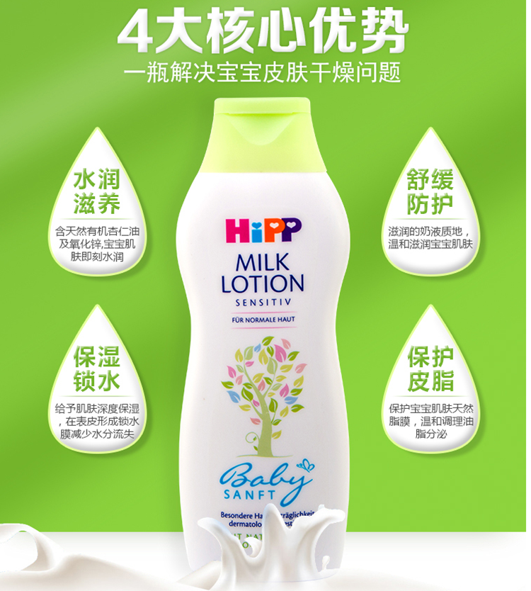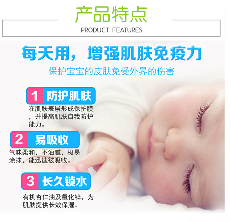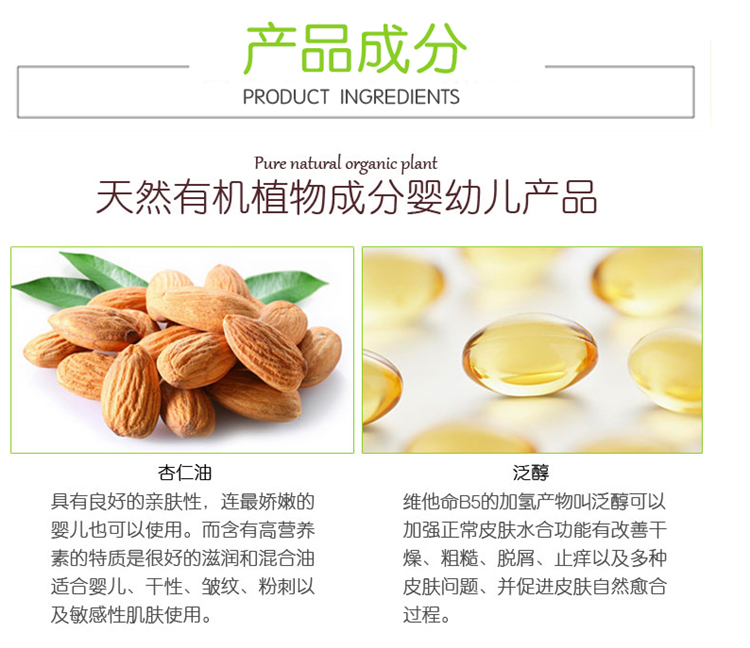 特为婴儿幼嫩、敏感肌肤研制。添加天然有机杏仁油,温和滋养呵护宝宝的肌肤,为肌肤提供充足的水分,有效避免干燥,
