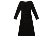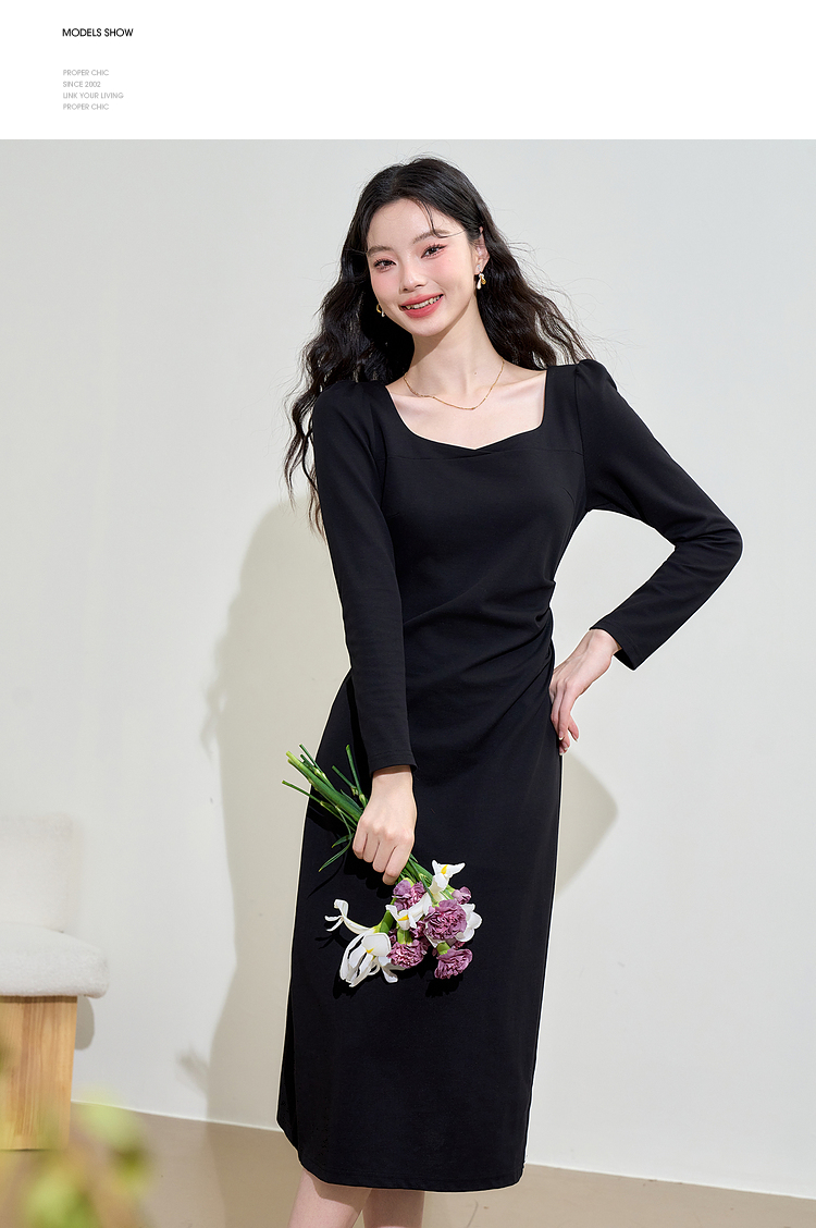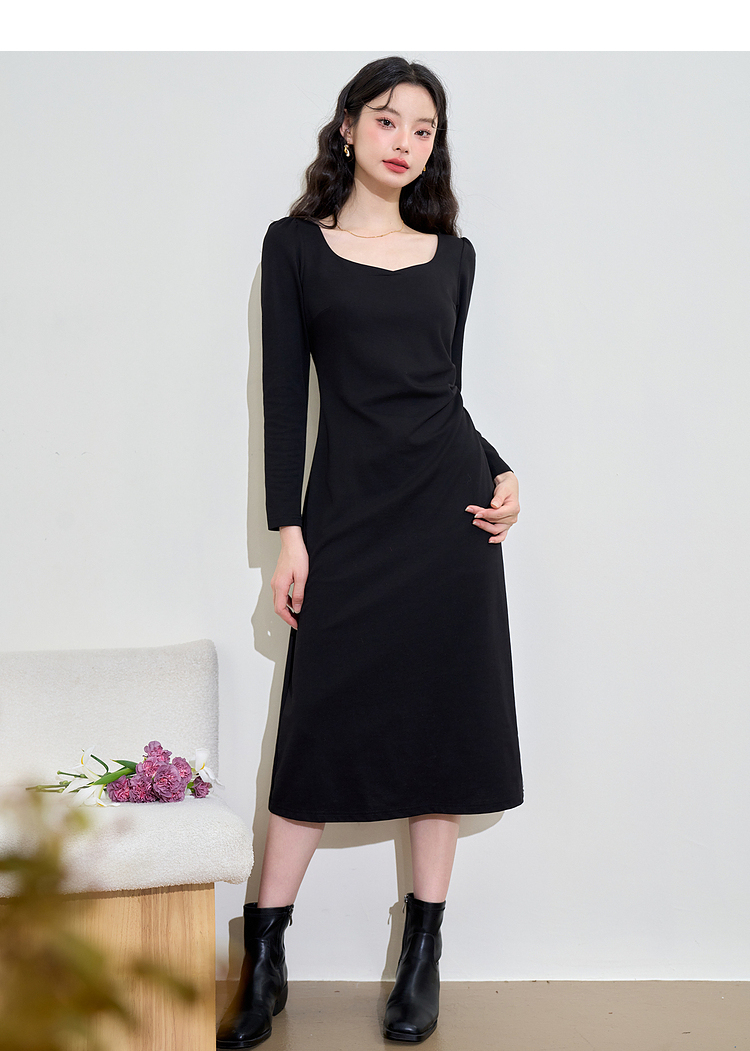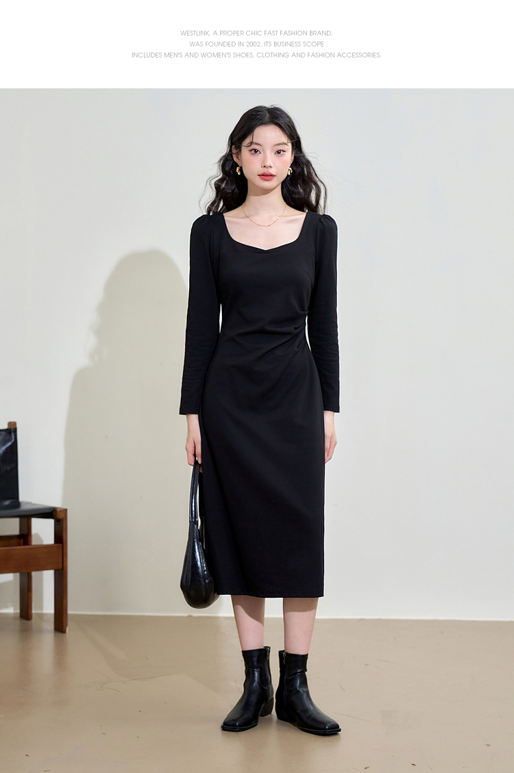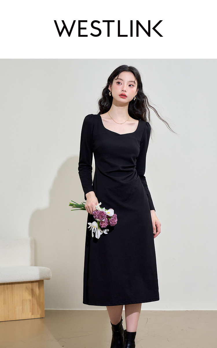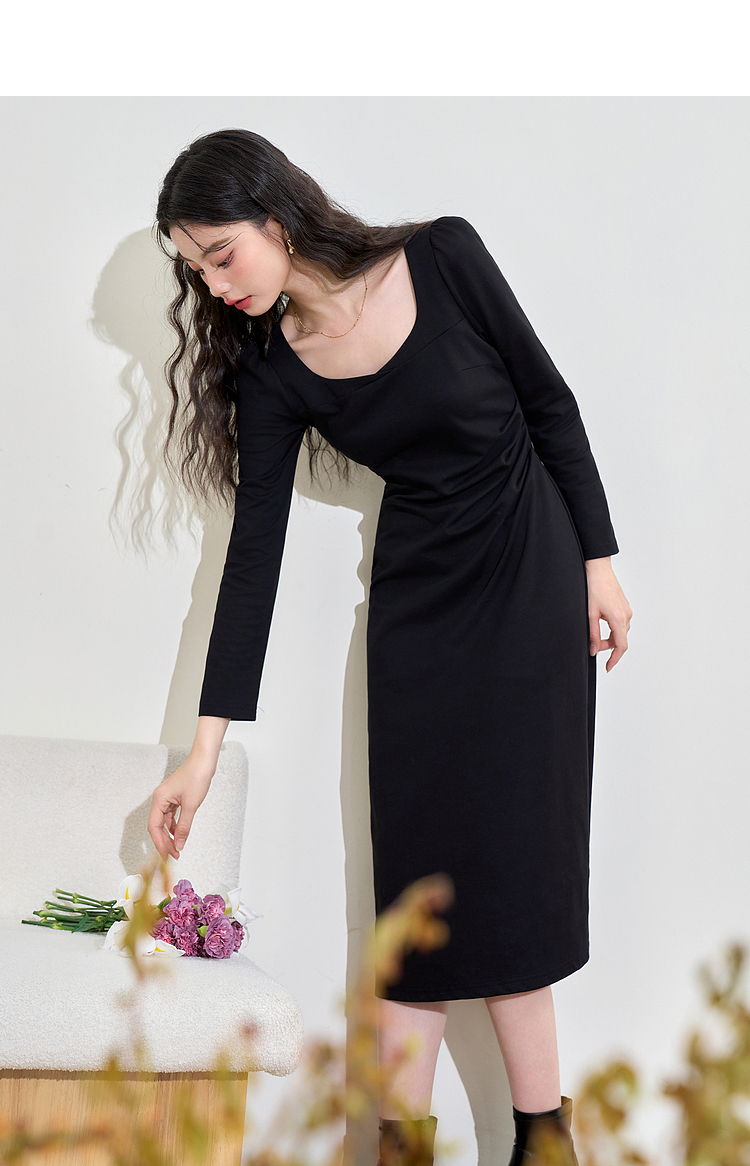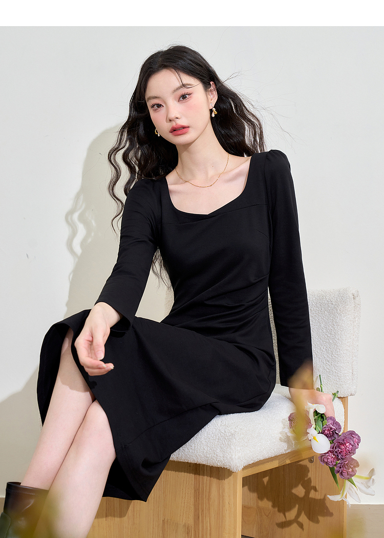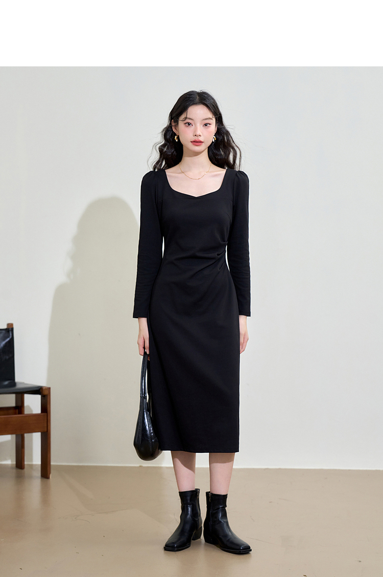 气质优雅高级感长袖连衣裙女早春交叉领重工打褶收腰长裙V3442250