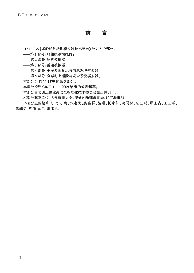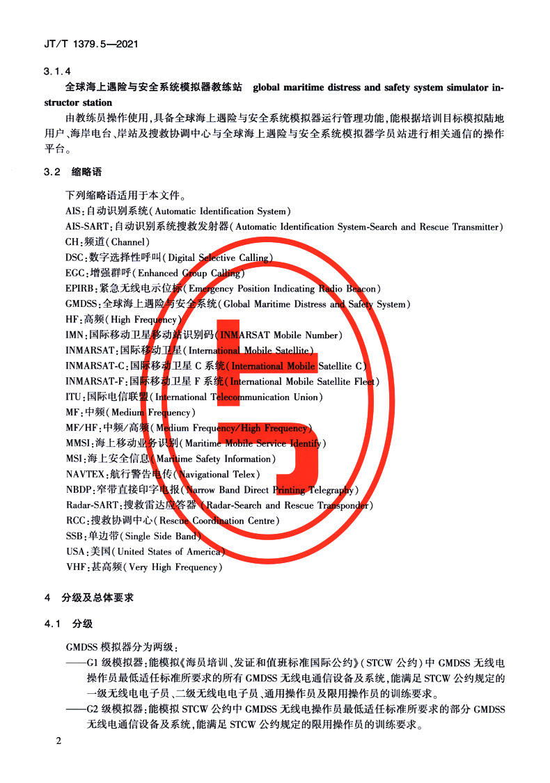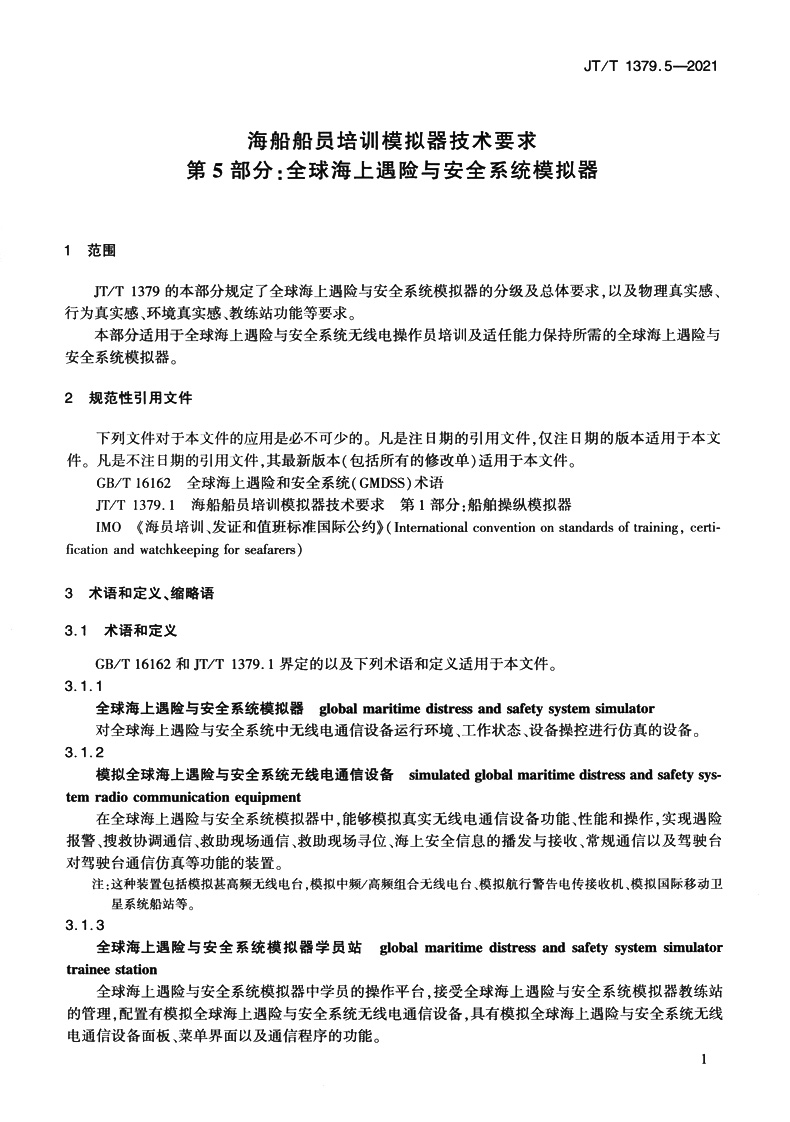 书名:海船船员培训模拟器技术要求 第5部分:全球海上遇险与安全系统(GMDSS)模拟器 (JT/T 1379.5—2021)