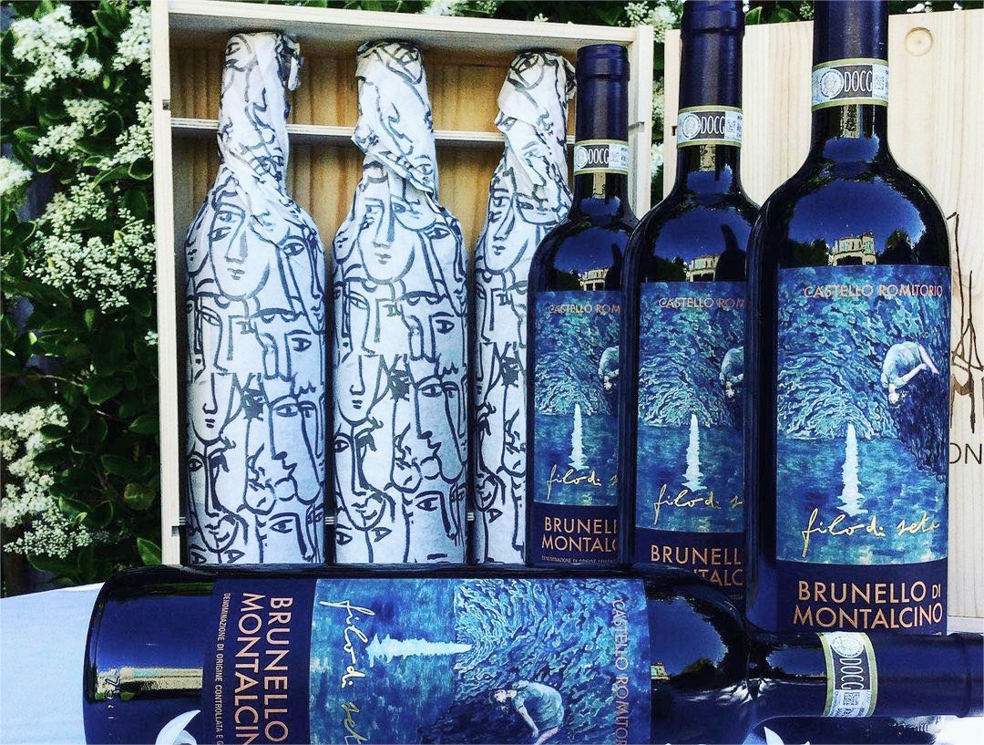 酒庄所在的城堡叫罗密托利奥,但被翻译成隐士,这个名字,是为了纪念这里的早期居民。这个城堡可以追溯到古罗马时期,19世纪被修复为贵族庄园,再到1984年被艺术家桑德罗奇亚(Sandro Chia)买下,酒庄各个角落都是艺术品。他作品里的人物,总是在积极寻找幸福,而喝酒,是醉容易让人感到幸福的,也许这就是他幽默的隐喻。就像丝线蓝标的图案,绝望的少女,深渊中的一线光亮,难怪这款酒也被誉为“蒙塔希诺的光明”。