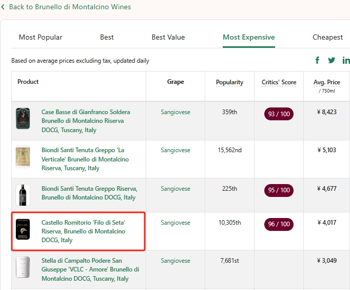 这个产区不大,但大部分是精品,前3大醉贵BdM生产商,分别是碧安帝山迪(Biondi Santi,三弟)、索德拉酒庄(Soldera,大龙),以及隐士酒庄。隐士是BdM新皇,创于1984年,醉高端款丝线单一园珍藏,只在特殊年份酿造,2016年获得意大利酒评家Raffaele Vecchione 100满分,目前国际未税均价达到了4000+。