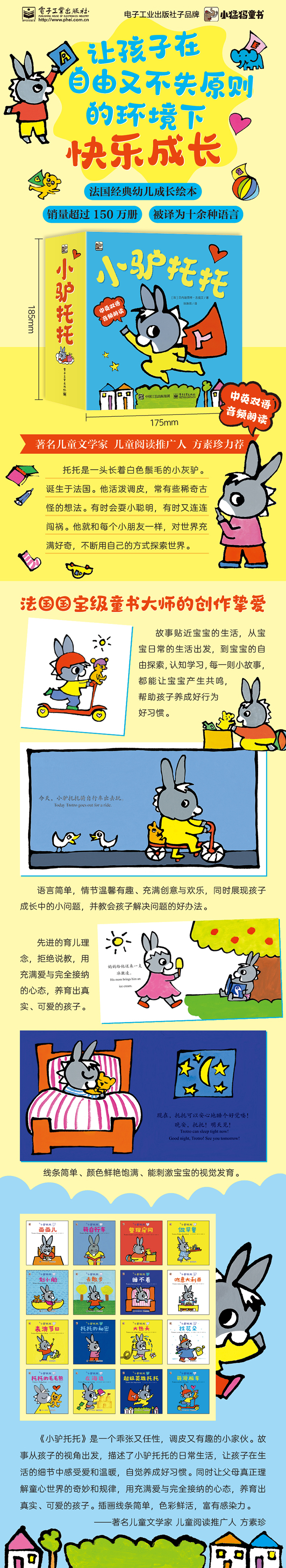 托托是一头长着白色鬃毛的小灰驴。他活泼调皮,常有些稀奇古怪的想法。有时会耍小聪明,有时又连连闯祸。他和每个小朋友一样,对世界充满好奇,不断用自己的方式探索世界。《小驴托托》共16册,故事贴近宝宝的生活,从宝宝日常的生活出发,包括做早餐、吃披萨、整理玩具、到宝宝的自由探索,认知学习,每一则小故事,都能让宝宝产生共鸣。语言简单,情节温馨有趣、充满创意与欢乐,也寓含着家长对宝宝的教养理念,更提供了一个无限延伸的想像空间,非常适合2-4岁的宝宝亲子共读。