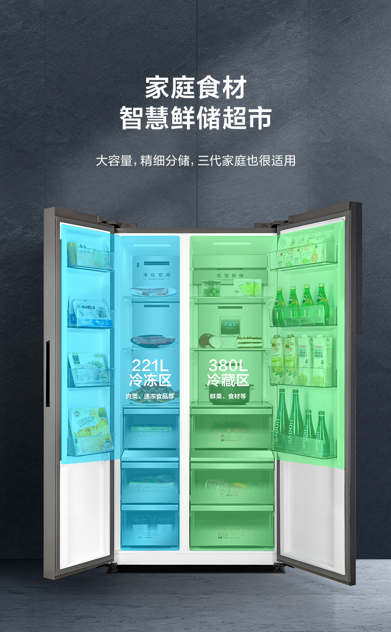 美的601L墨兰灰高端急速净味家用大容量一级智能冰箱
