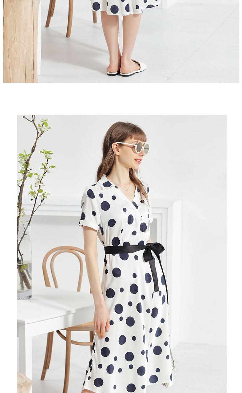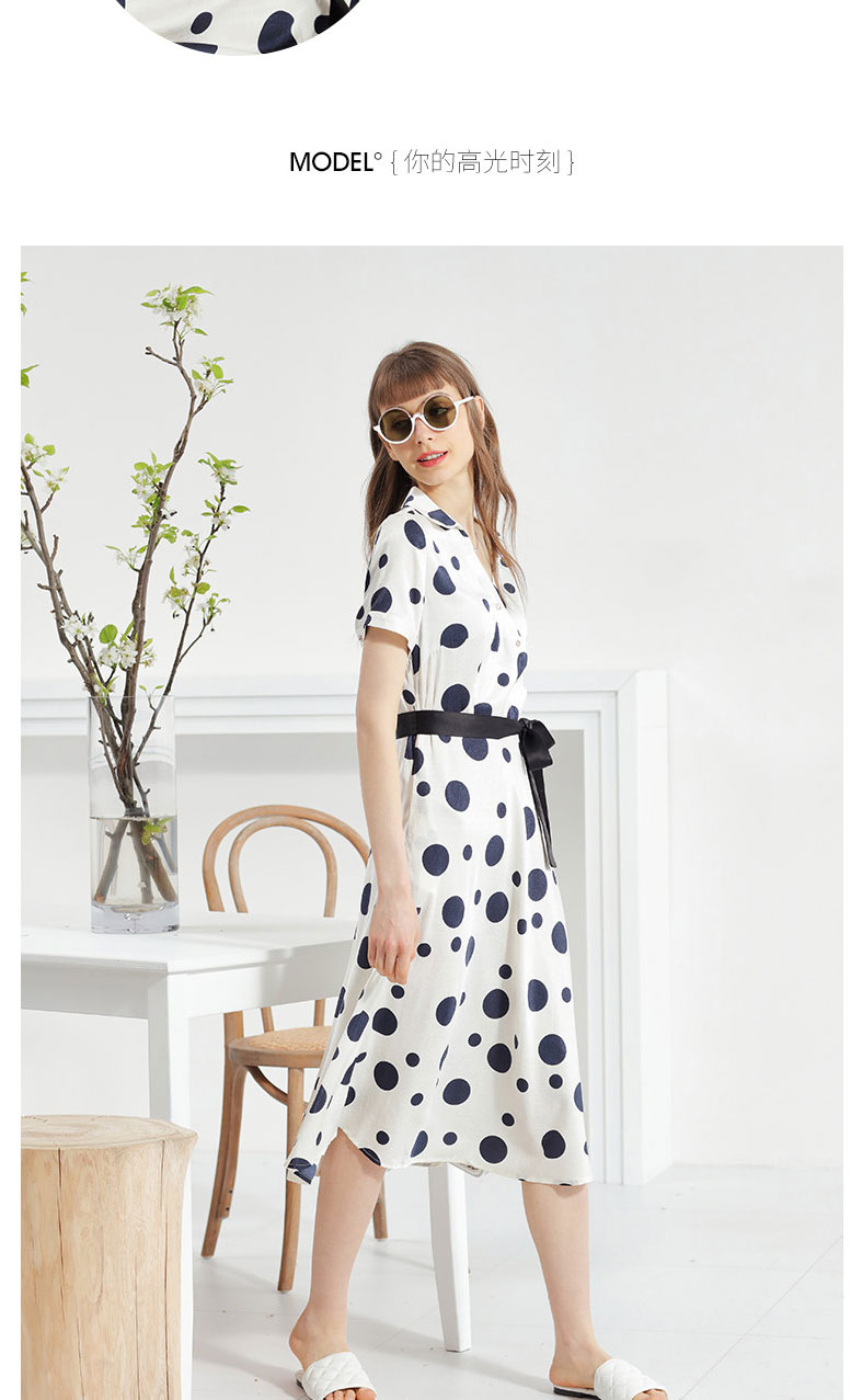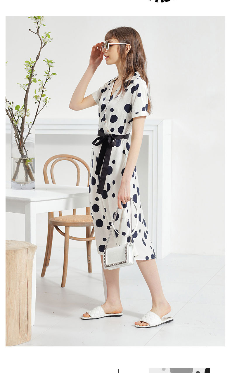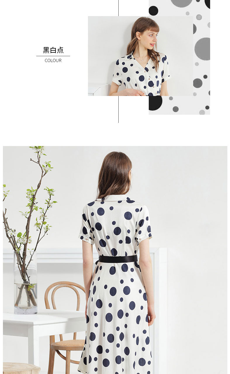 科蒙博卡夏季新品真丝连衣裙女V领黑白波点腰带桑蚕丝长裙KXMT031005A1D