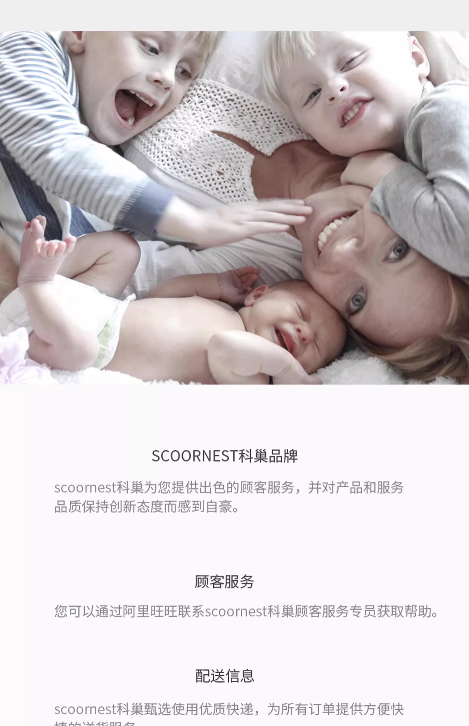 - Scoornest始终秉承给每一位宝宝送去科学的、关心的、创新的成长体验,通过提供商品和服务,使顾客形成守护、发展、巩固这种弥足珍贵的亲情的爱。