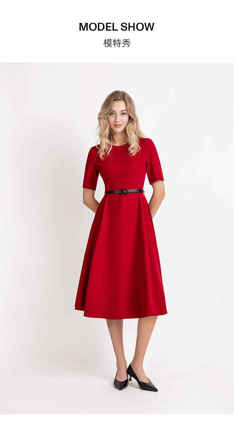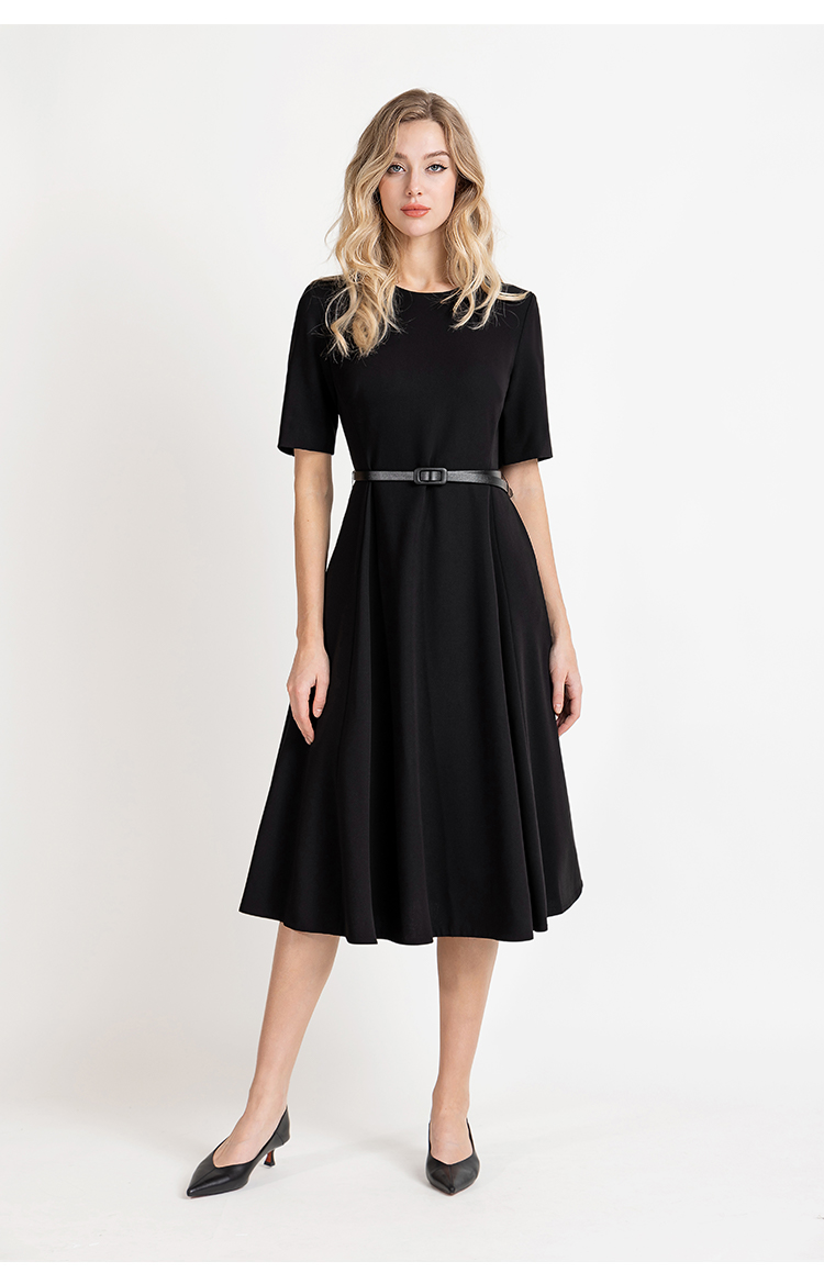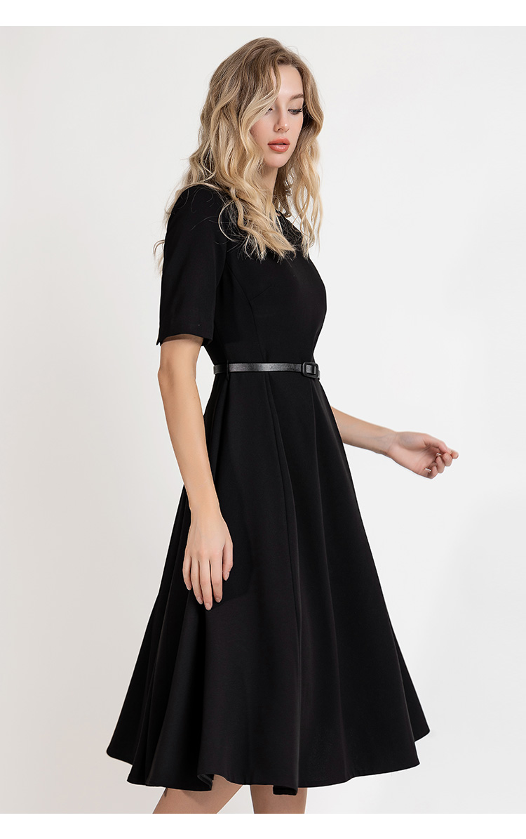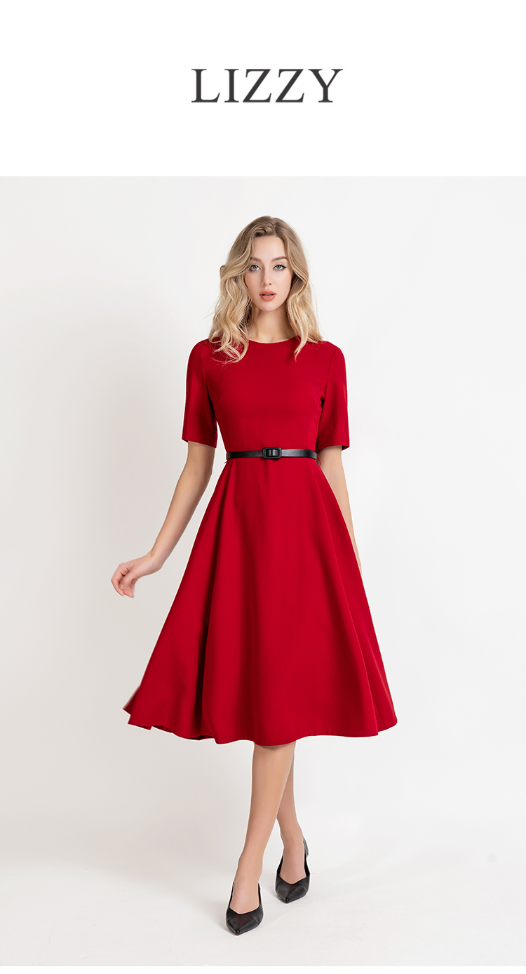 LIZZY 早秋优雅精致通勤赫本风短袖大摆连衣裙{配腰带}8009