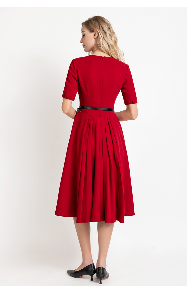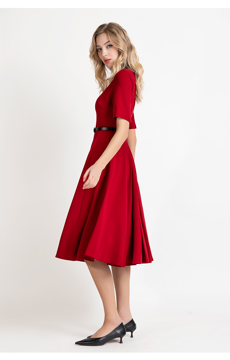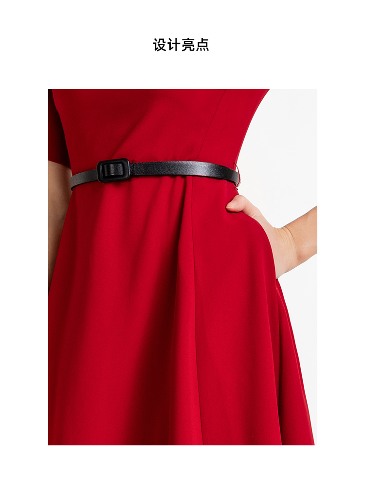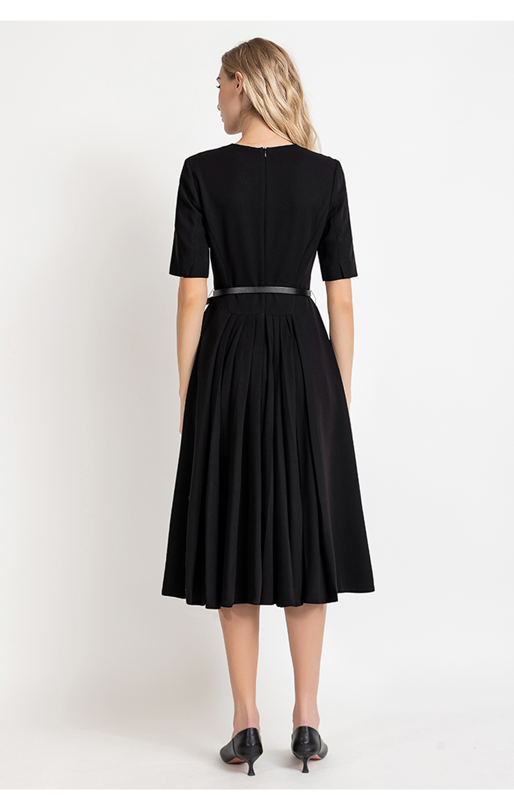 LIZZY 早秋优雅精致通勤赫本风短袖大摆连衣裙{配腰带}8009