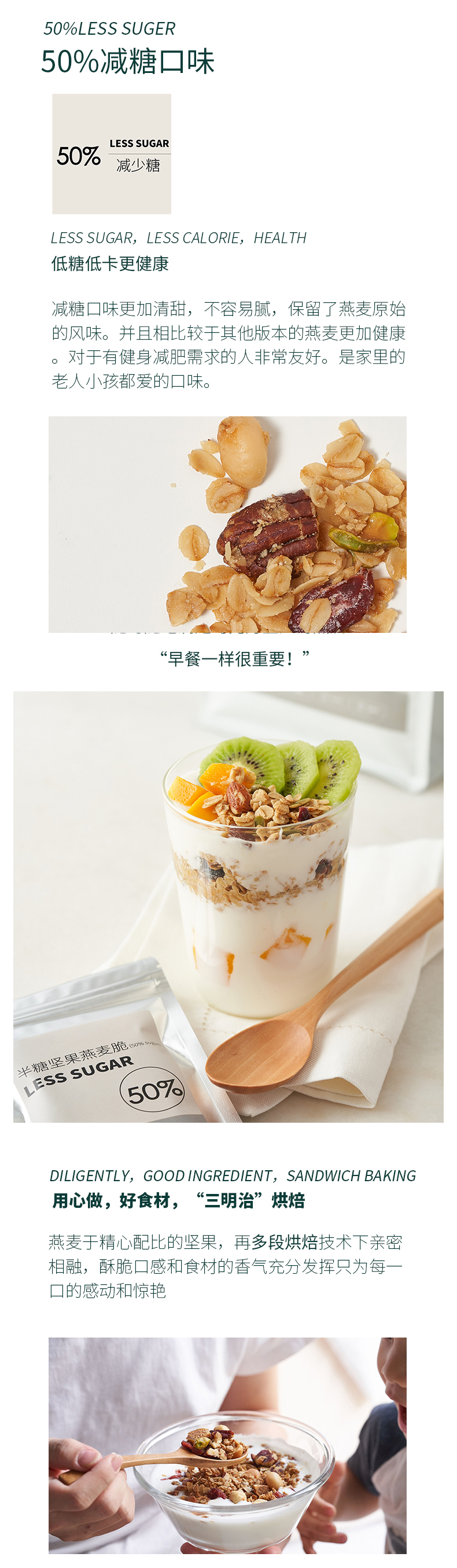 担心热量的朋友可以选半糖版的,黄油和糖量都减半,而且选用了更厚实、纤维感强的燕麦品种,耐嚼,韧性也更好。