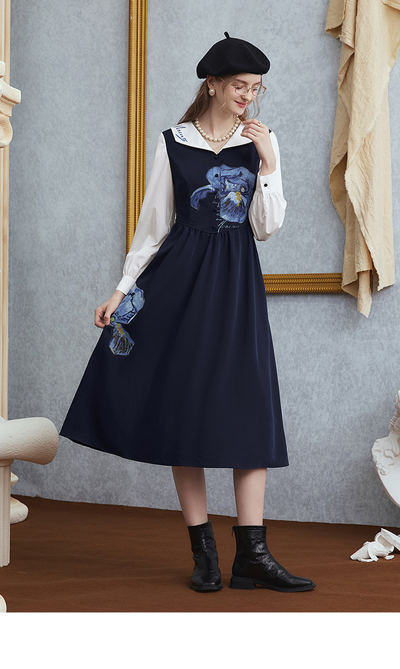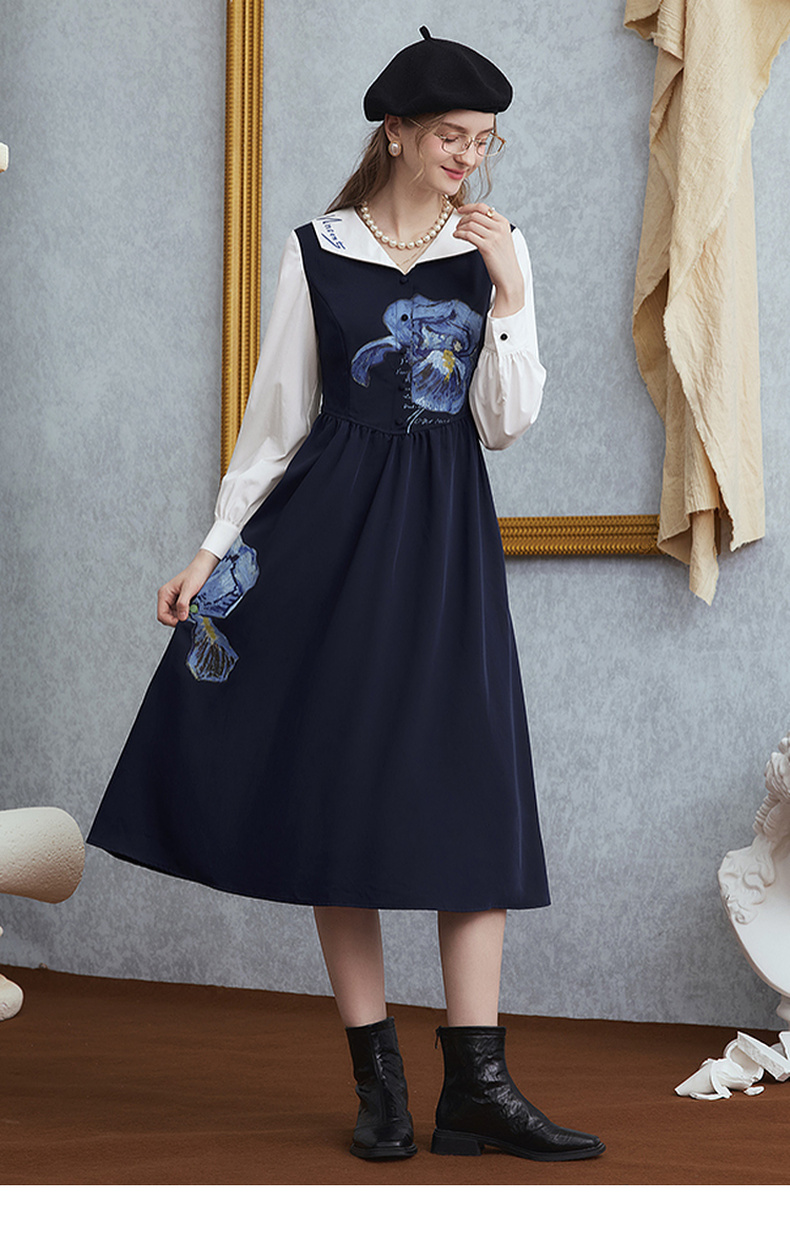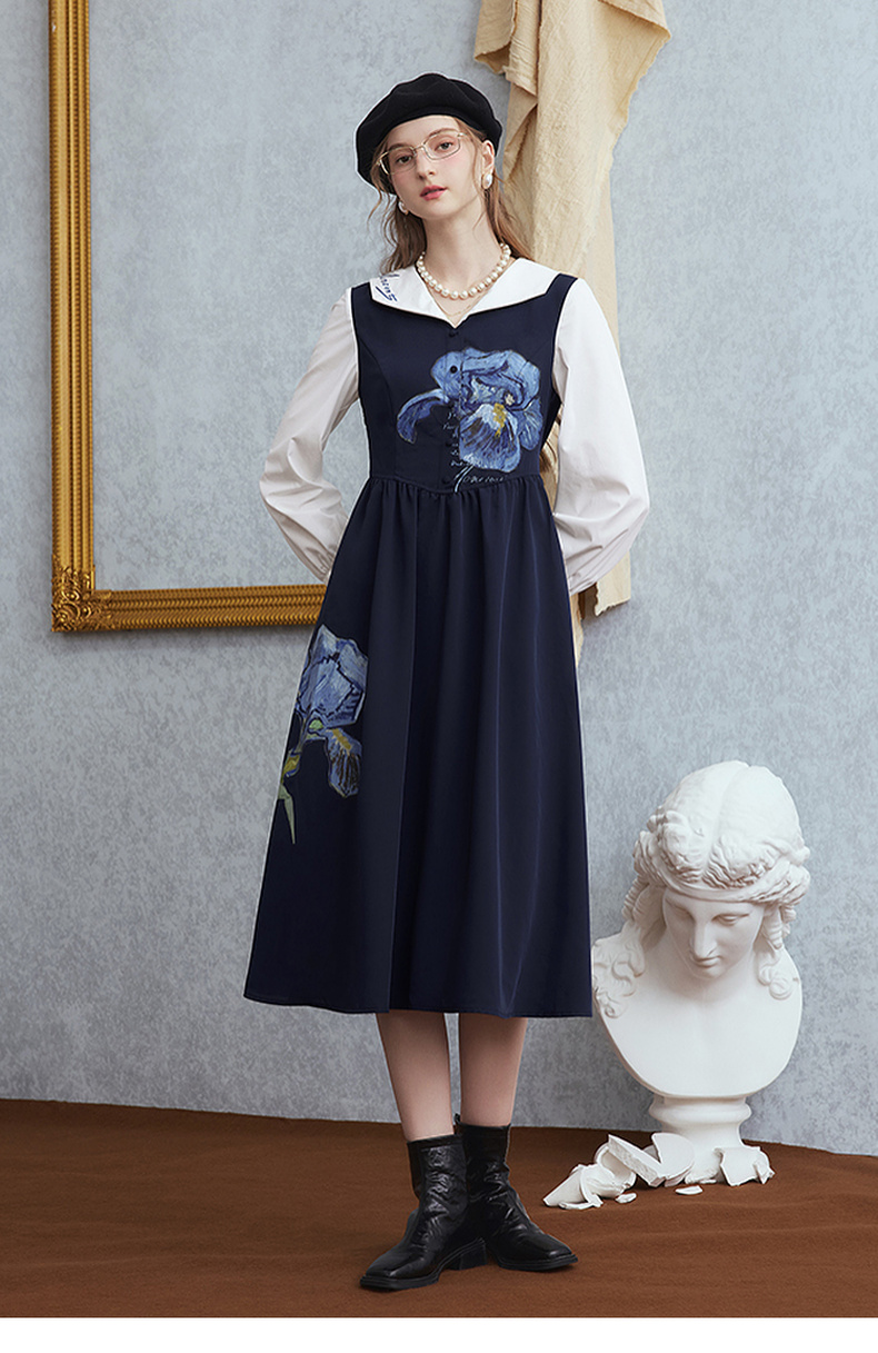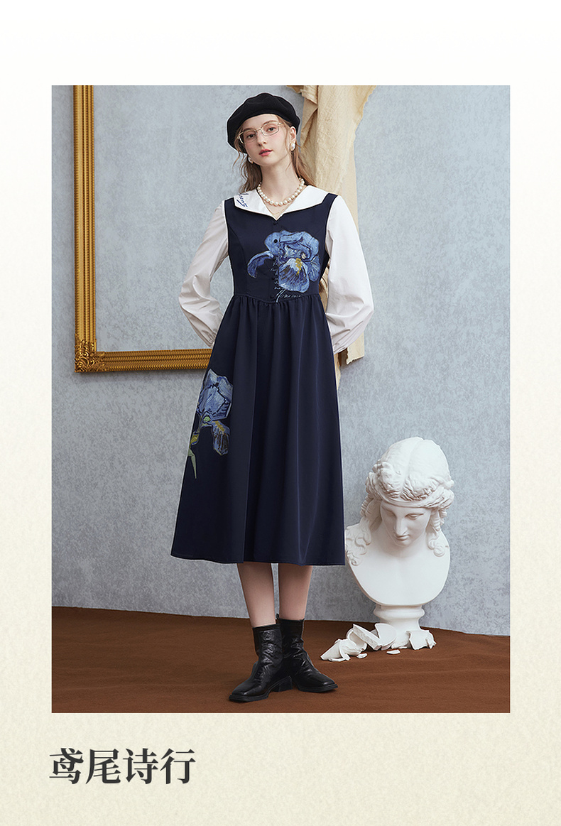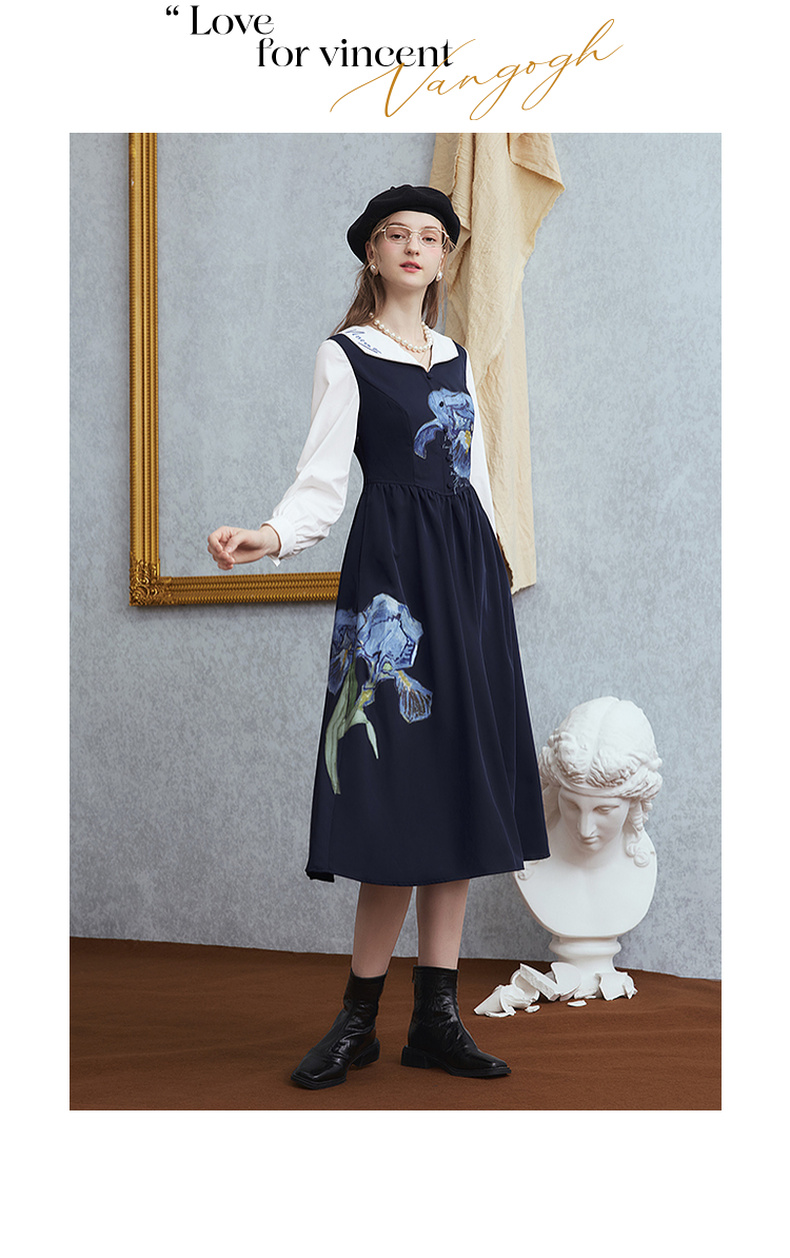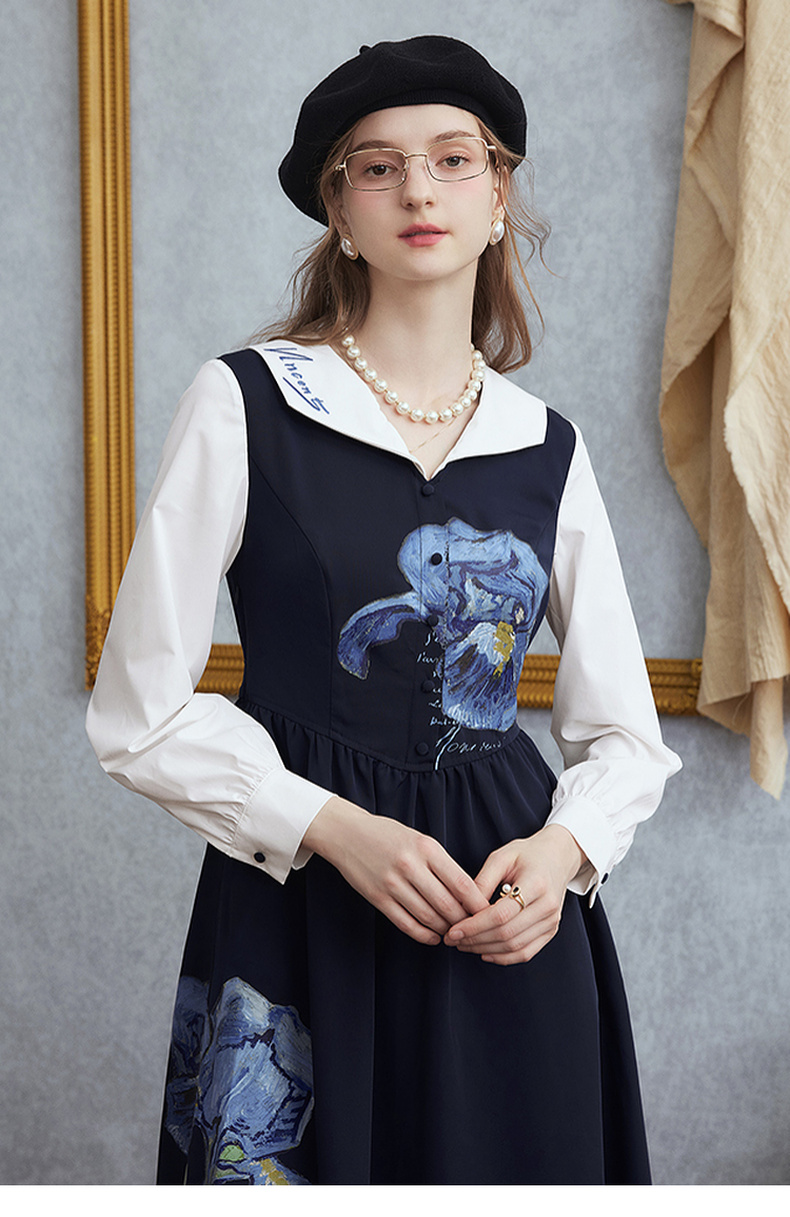两三事梵高文艺鸢尾诗行2025秋新款刺绣翻领拼色印花假两件连衣裙