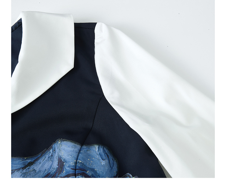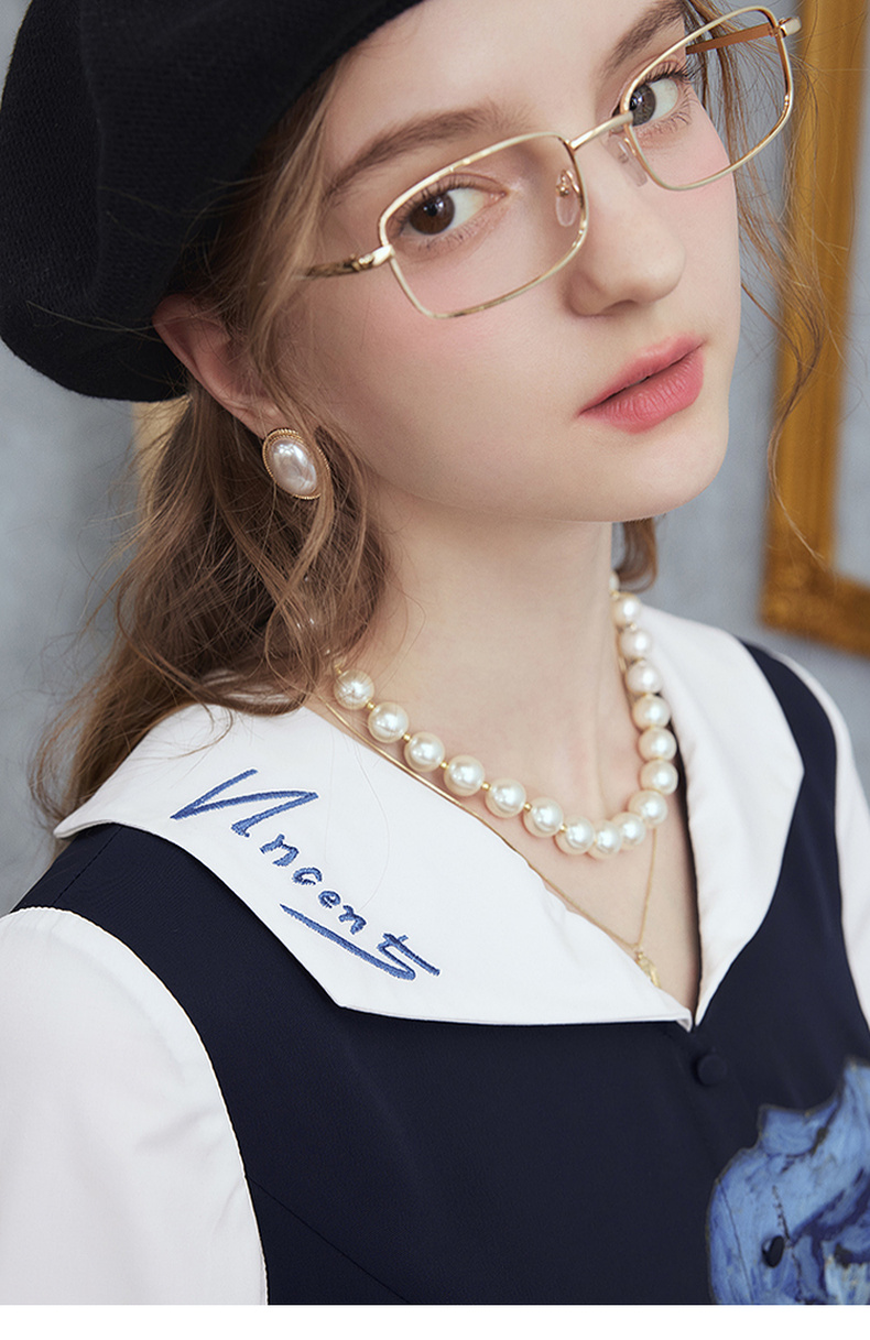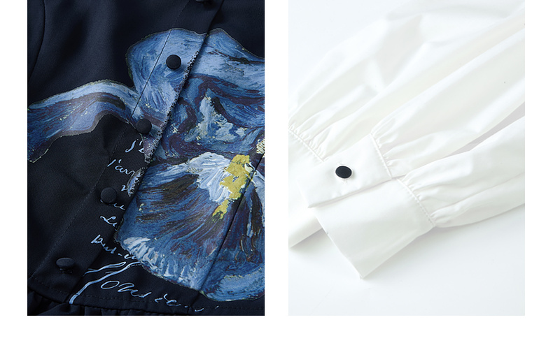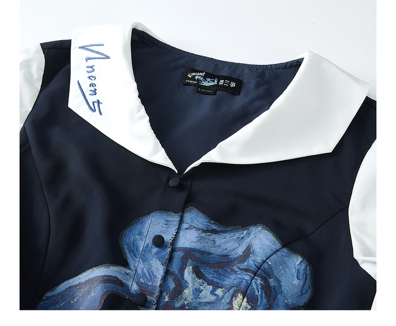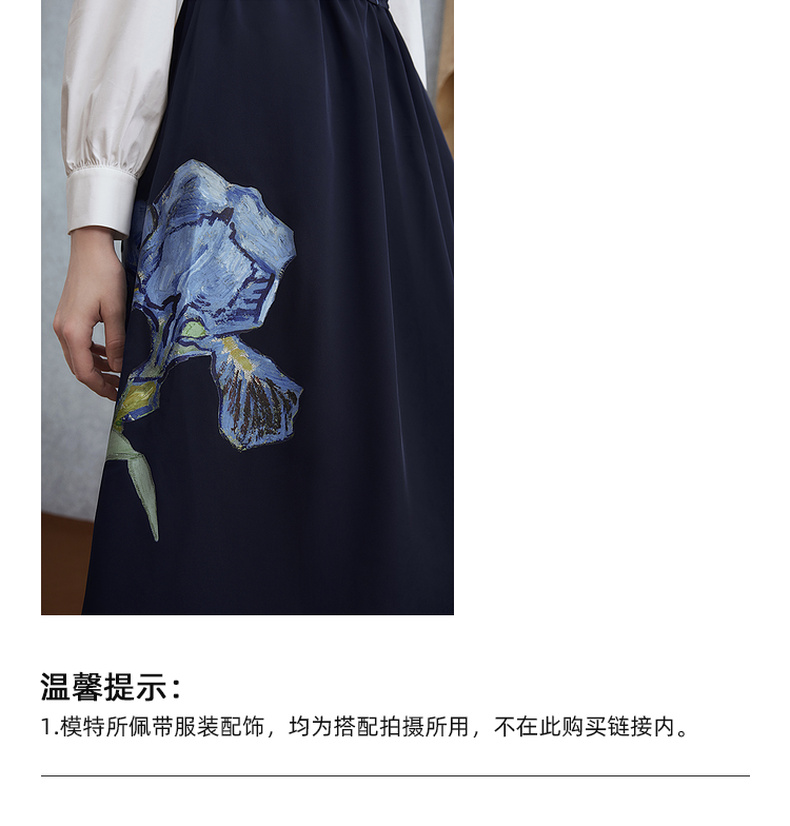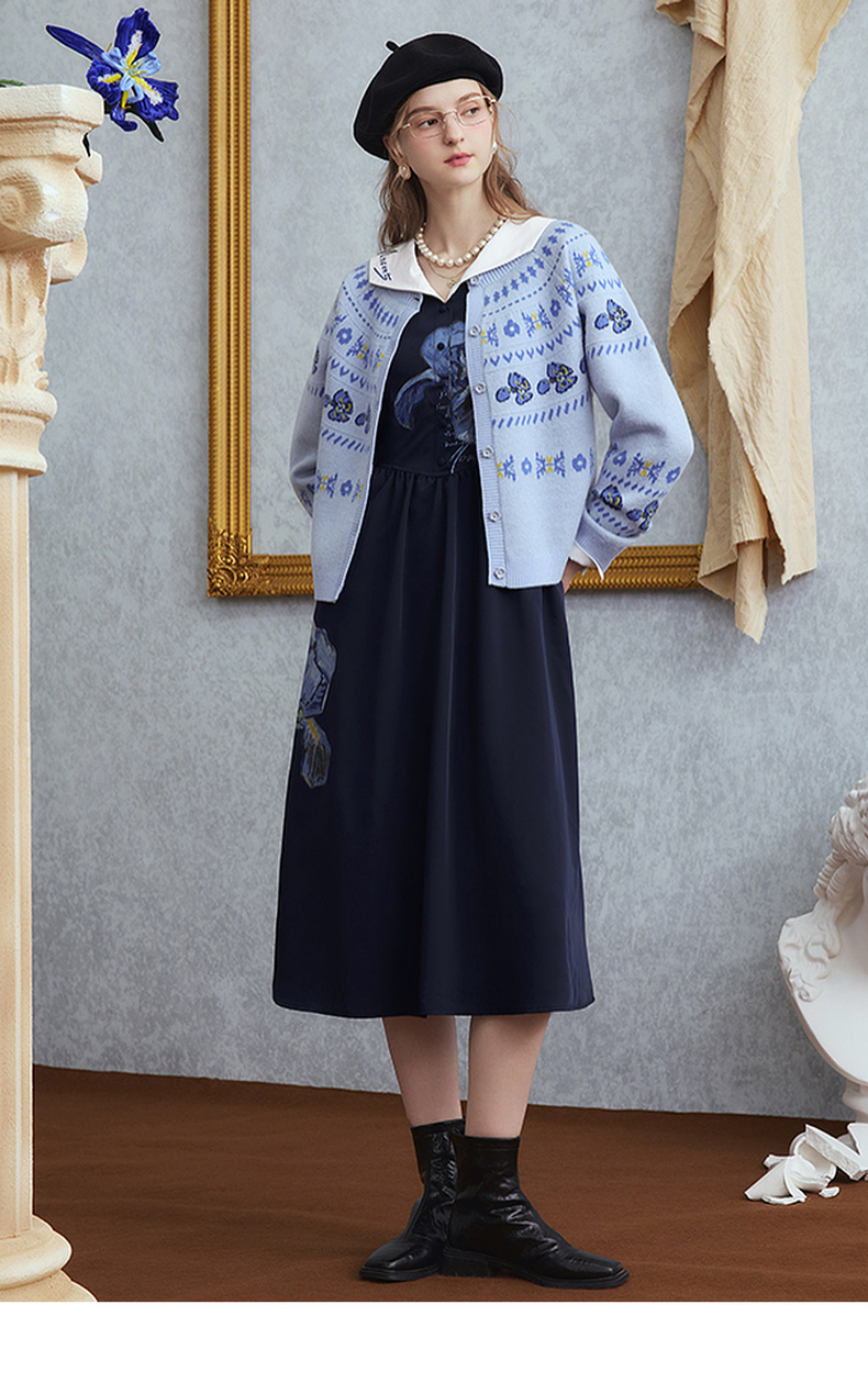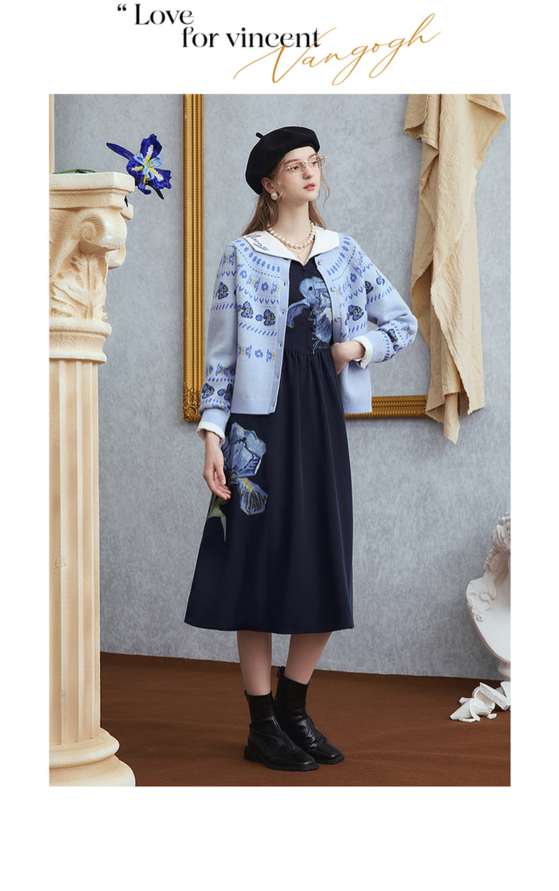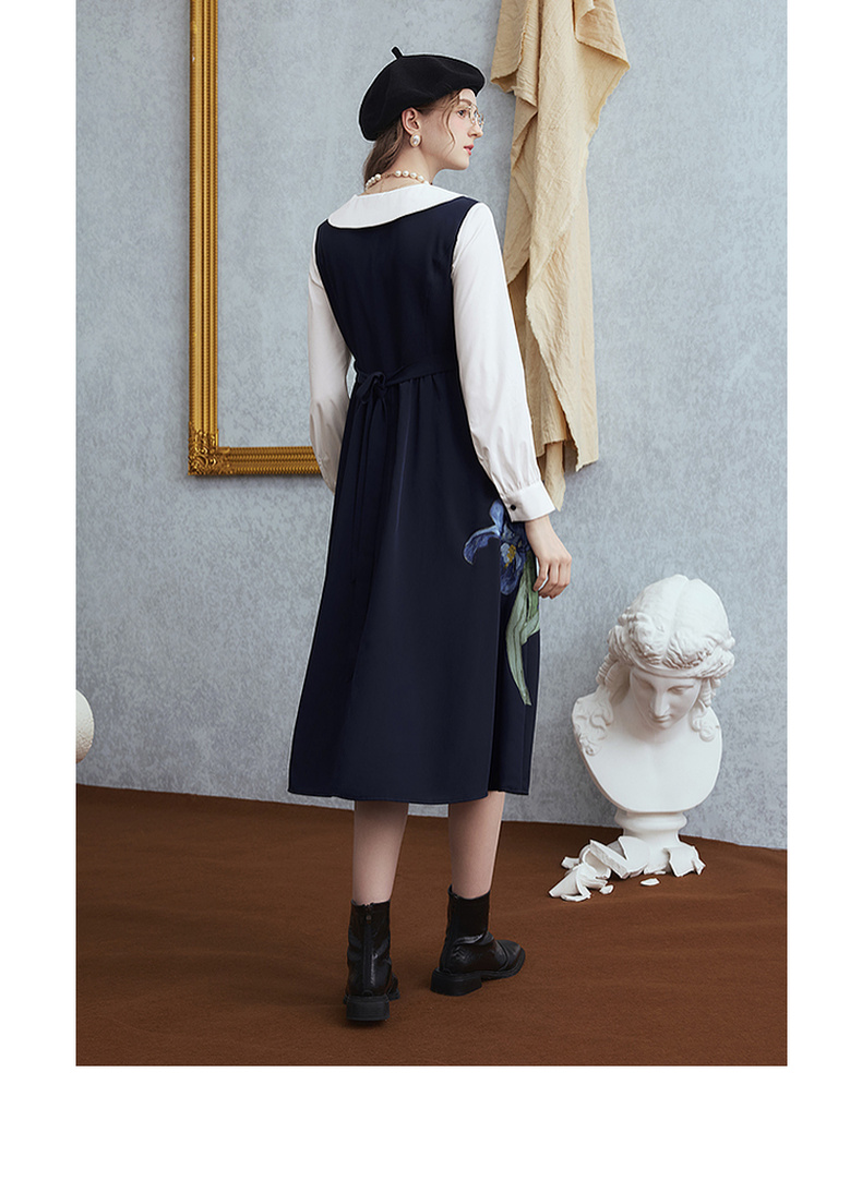 两三事梵高文艺鸢尾诗行2025秋新款刺绣翻领拼色印花假两件连衣裙