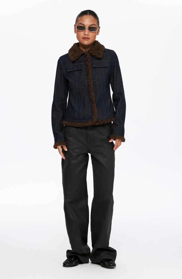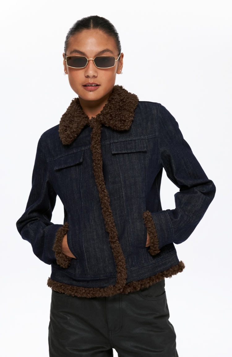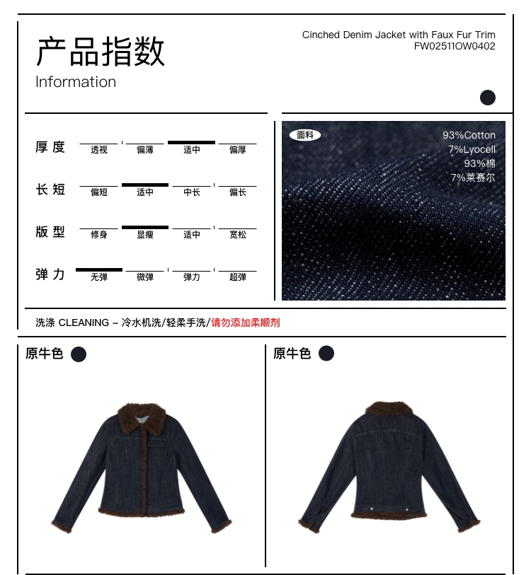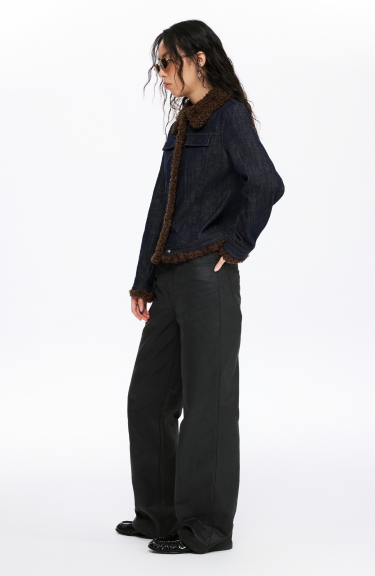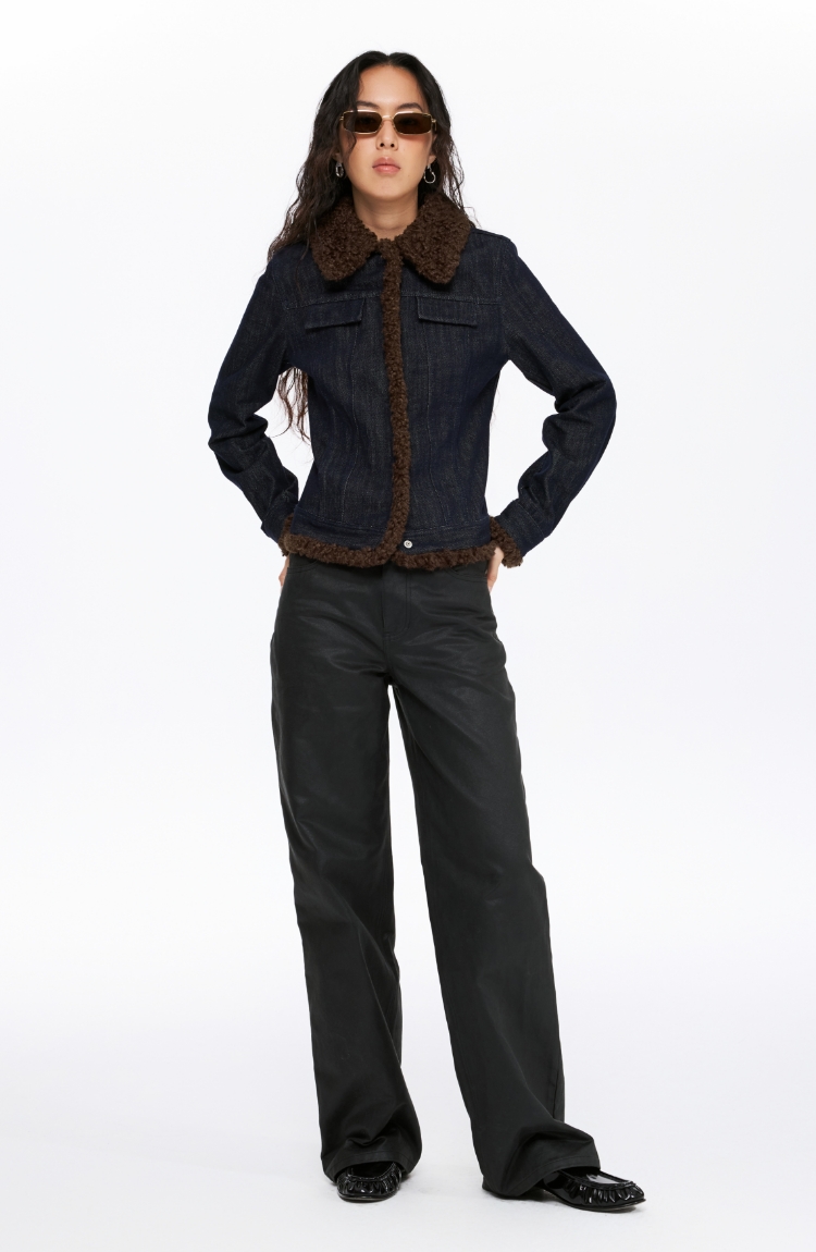 oneup收腰牛仔拼毛外套