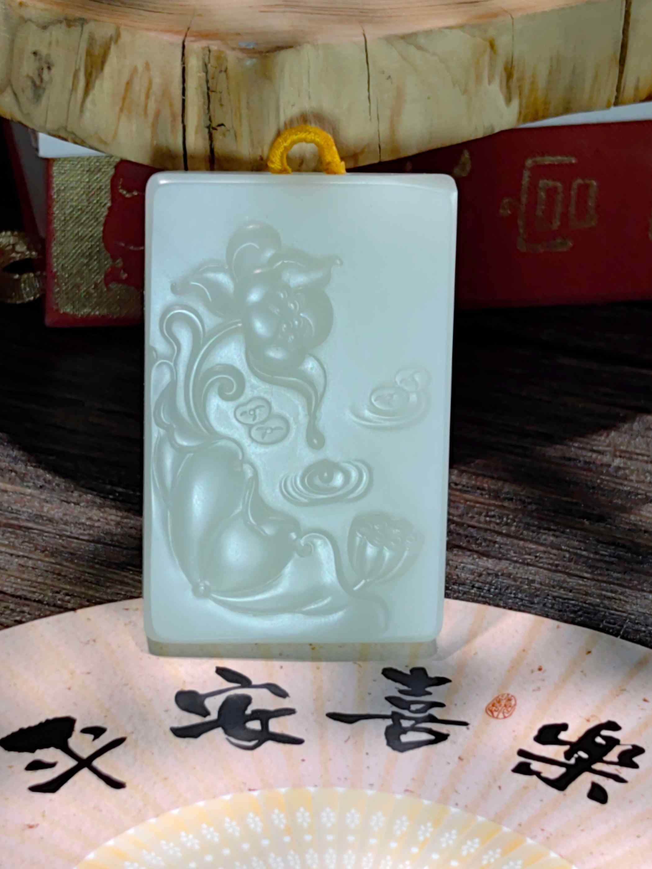 这是一件大方的和田玉牌子项坠,雕工非常细腻,浮萍、莲藕、荷花、莲叶由远及近,诗意又生动,预示着“和美顺遂"。