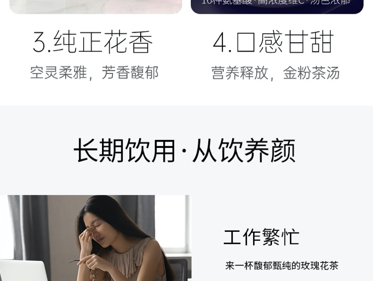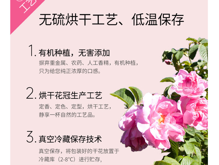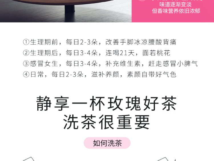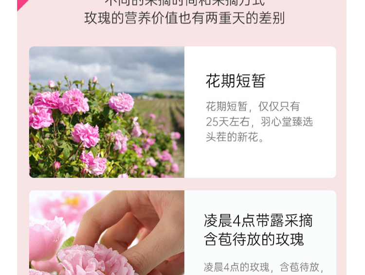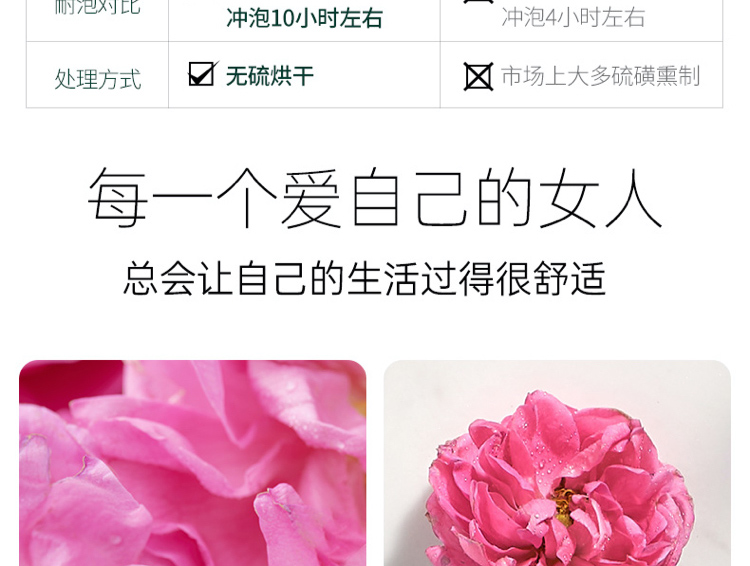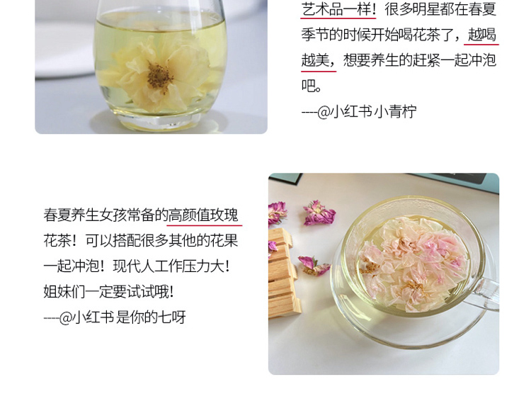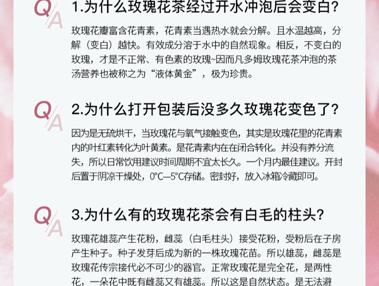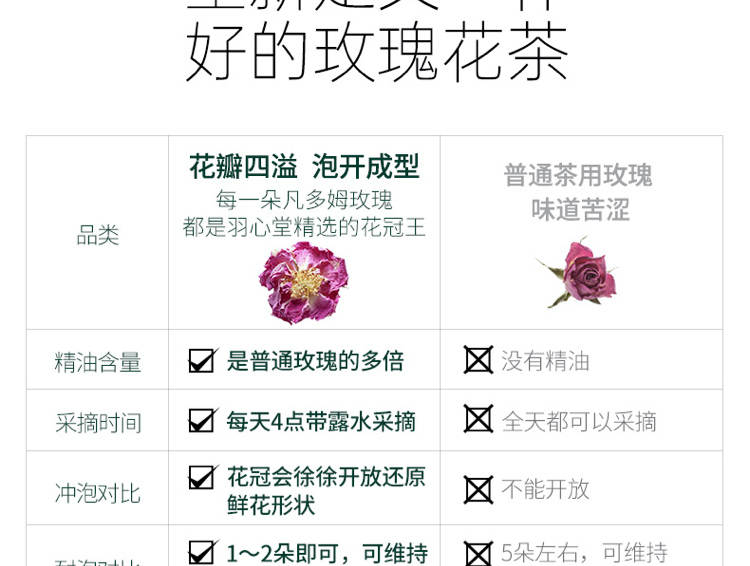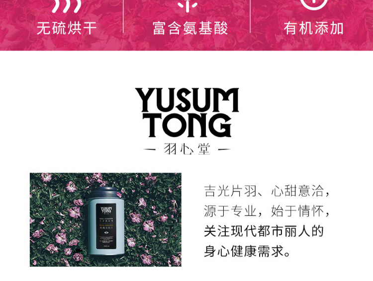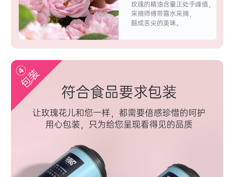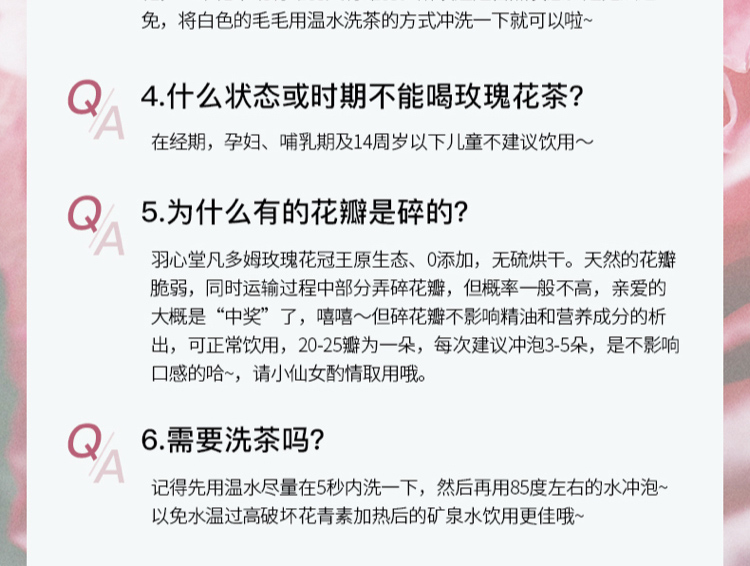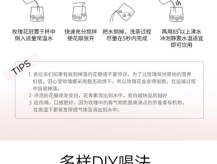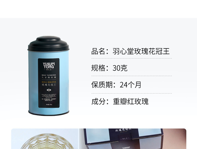 买前必看: 1、羽心堂玫瑰花冠原生态、无添加,无硫烘干。天然花瓣脆弱,运输过程中如遇快递暴力会弄碎花瓣,并不影响玫瑰的口感和营养成分,如您遇到轻微的花瓣碎裂情况,可正常冲泡,如果遇到花瓣碎裂比较严重,可以联系客服为您进行换货处理; 2、开封后请放到密封的容器中保存,避免氧化变色,自带的铁罐不是完全密封的会有空气进入。 |