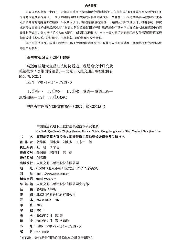 书名:高烈度区超大直径汕头海湾隧道工程勘察设计研究及关键技术
