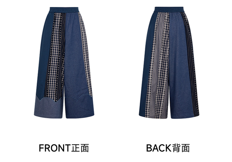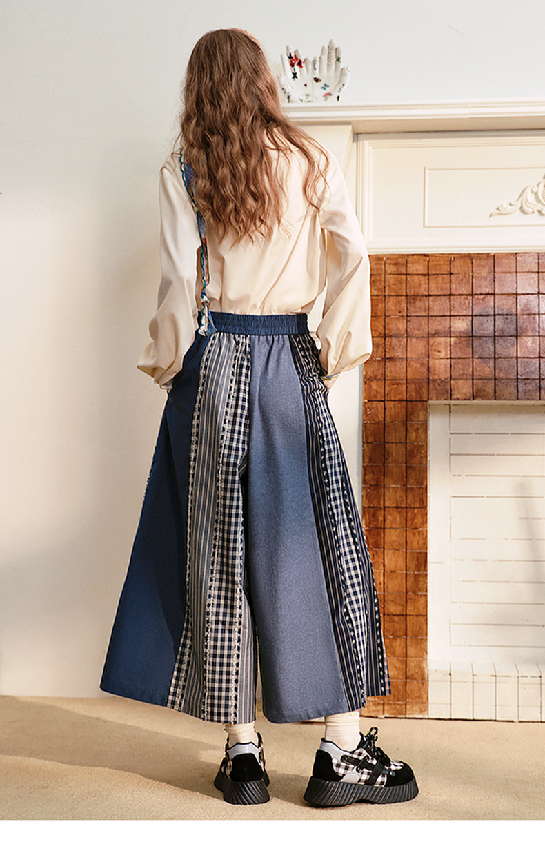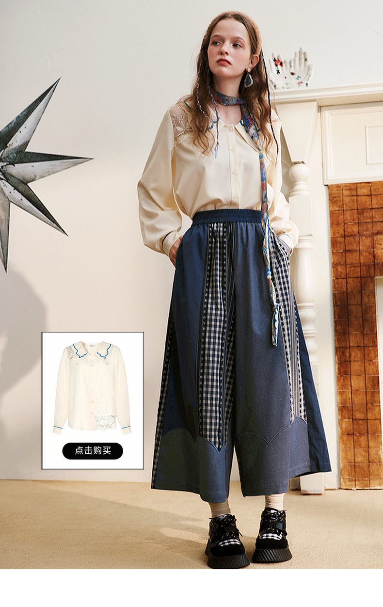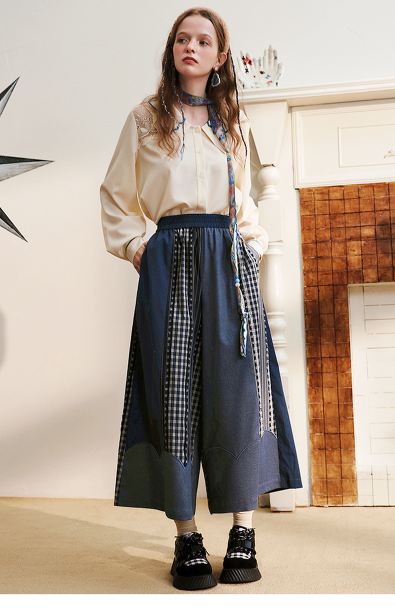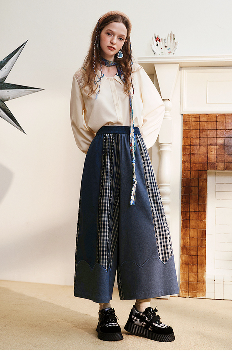 两三事 晚风正好 2024秋季新款时尚格子拼布高腰阔腿裤休闲裤女