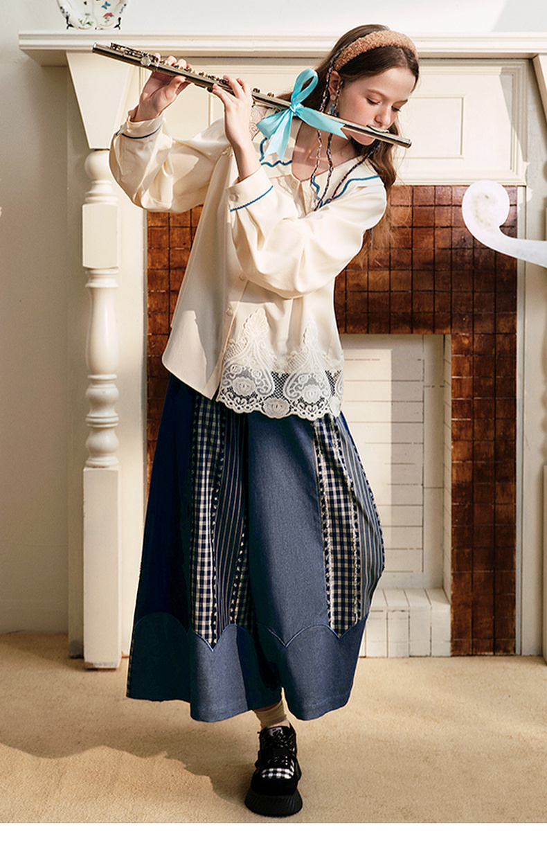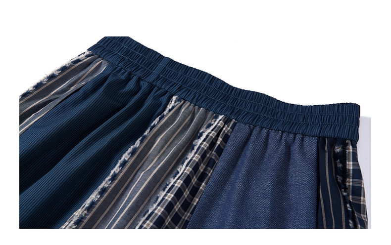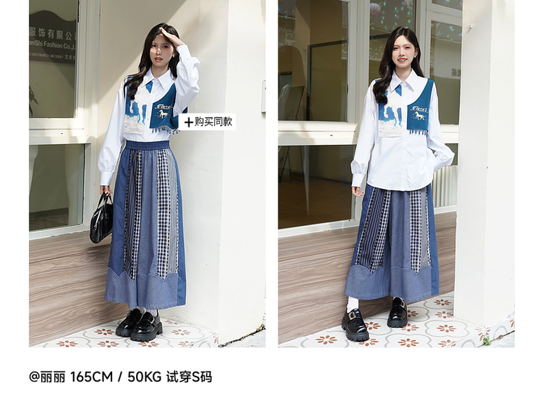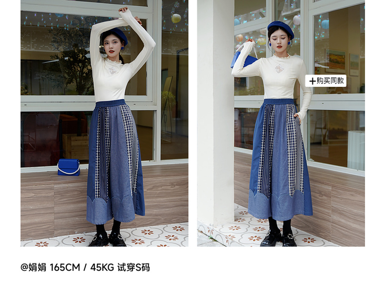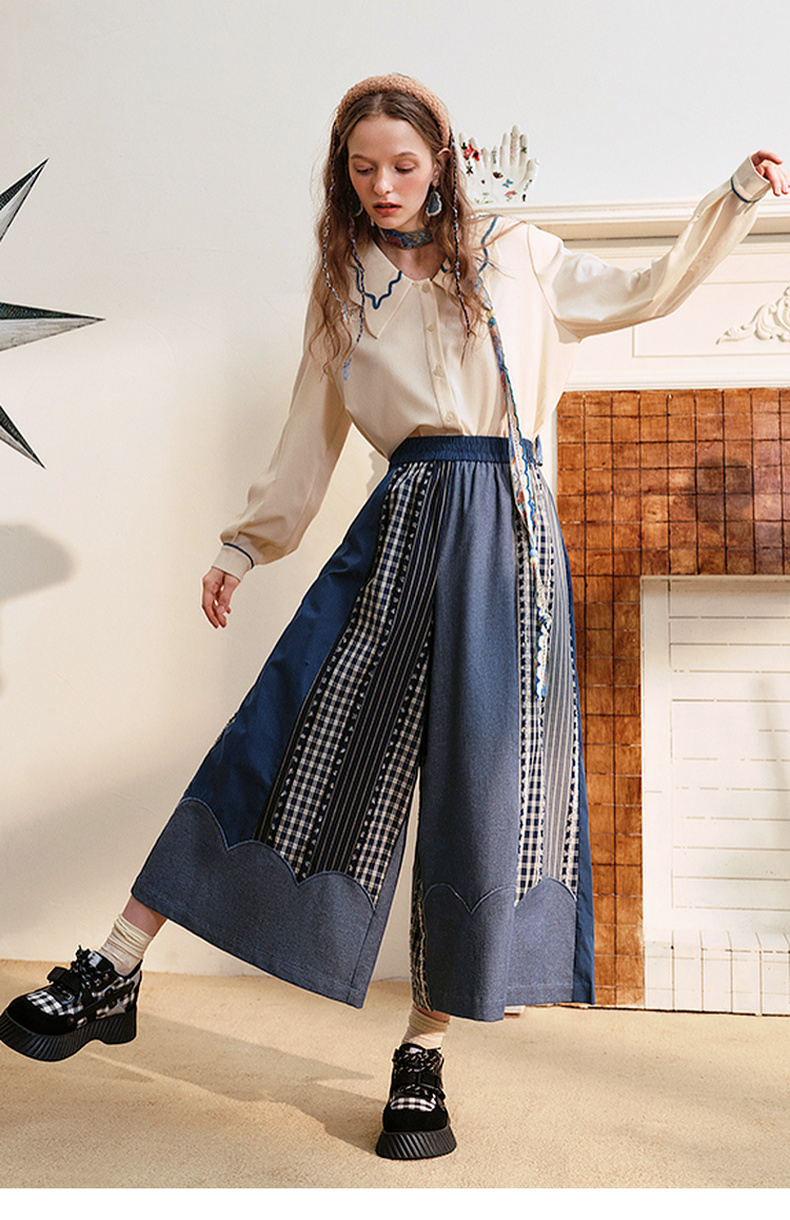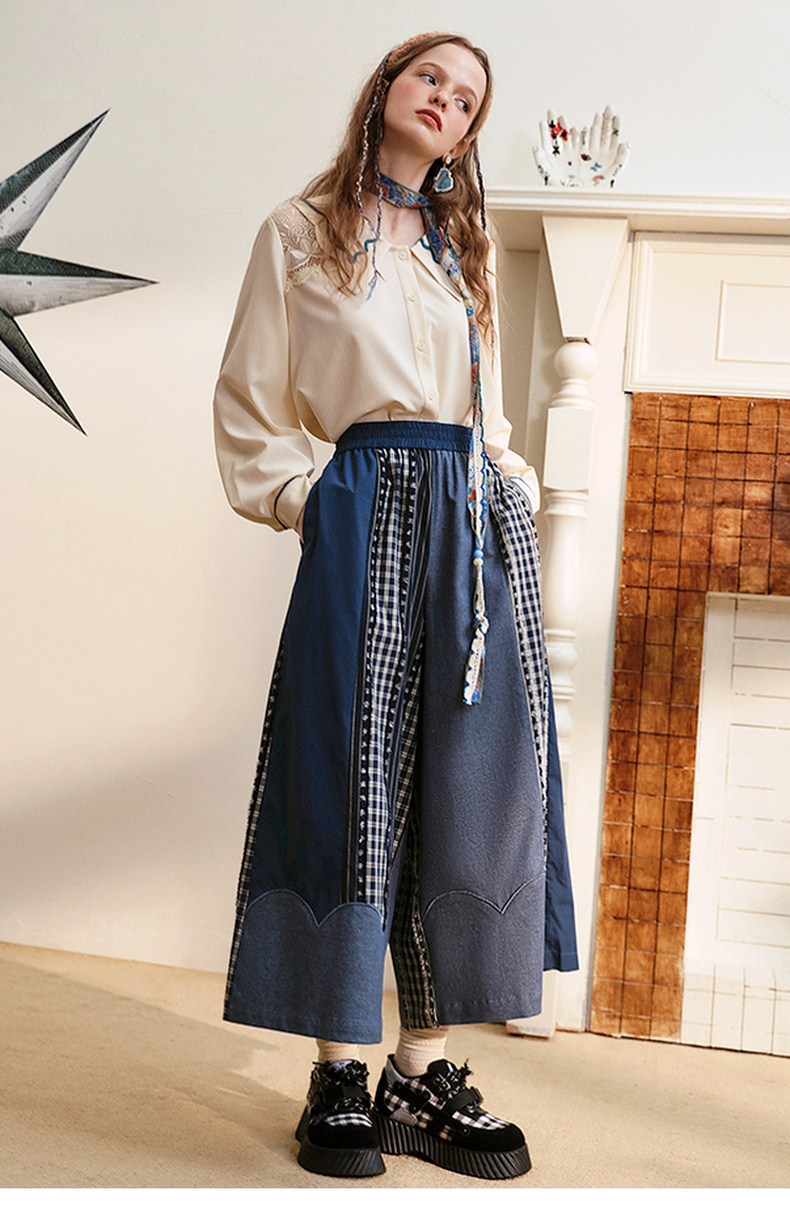 两三事 晚风正好 2024秋季新款时尚格子拼布高腰阔腿裤休闲裤女