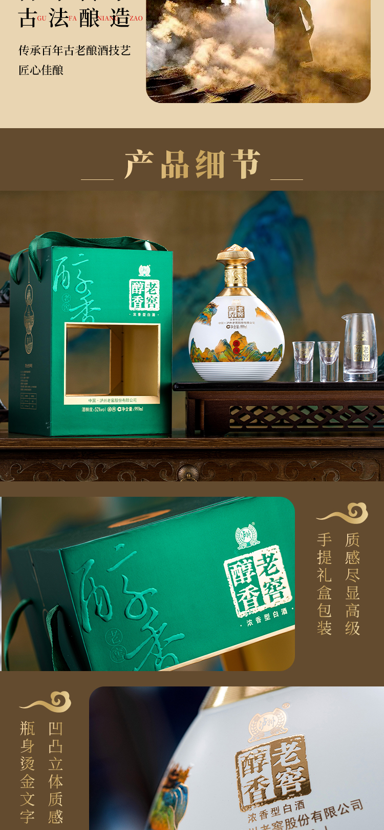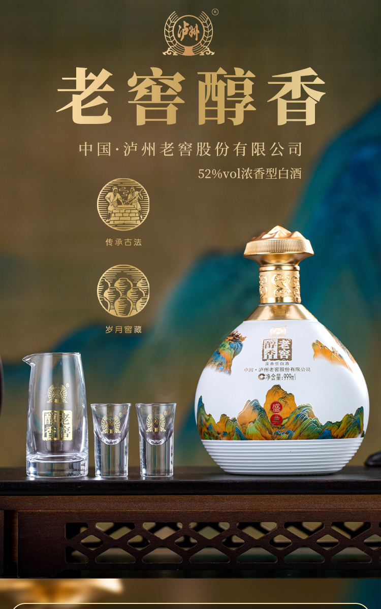 泸州老窖醇香 52度浓香型 白酒礼盒 商务招待 送礼佳品 老窖醇香999ml*2坛 内含2套酒具