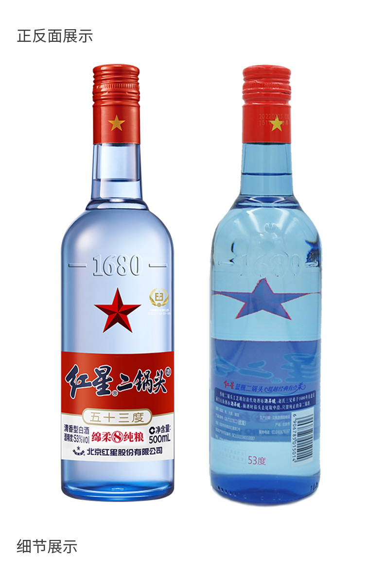 红星二锅头八年陈酿蓝瓶二锅头53度整箱白酒500ml*12瓶