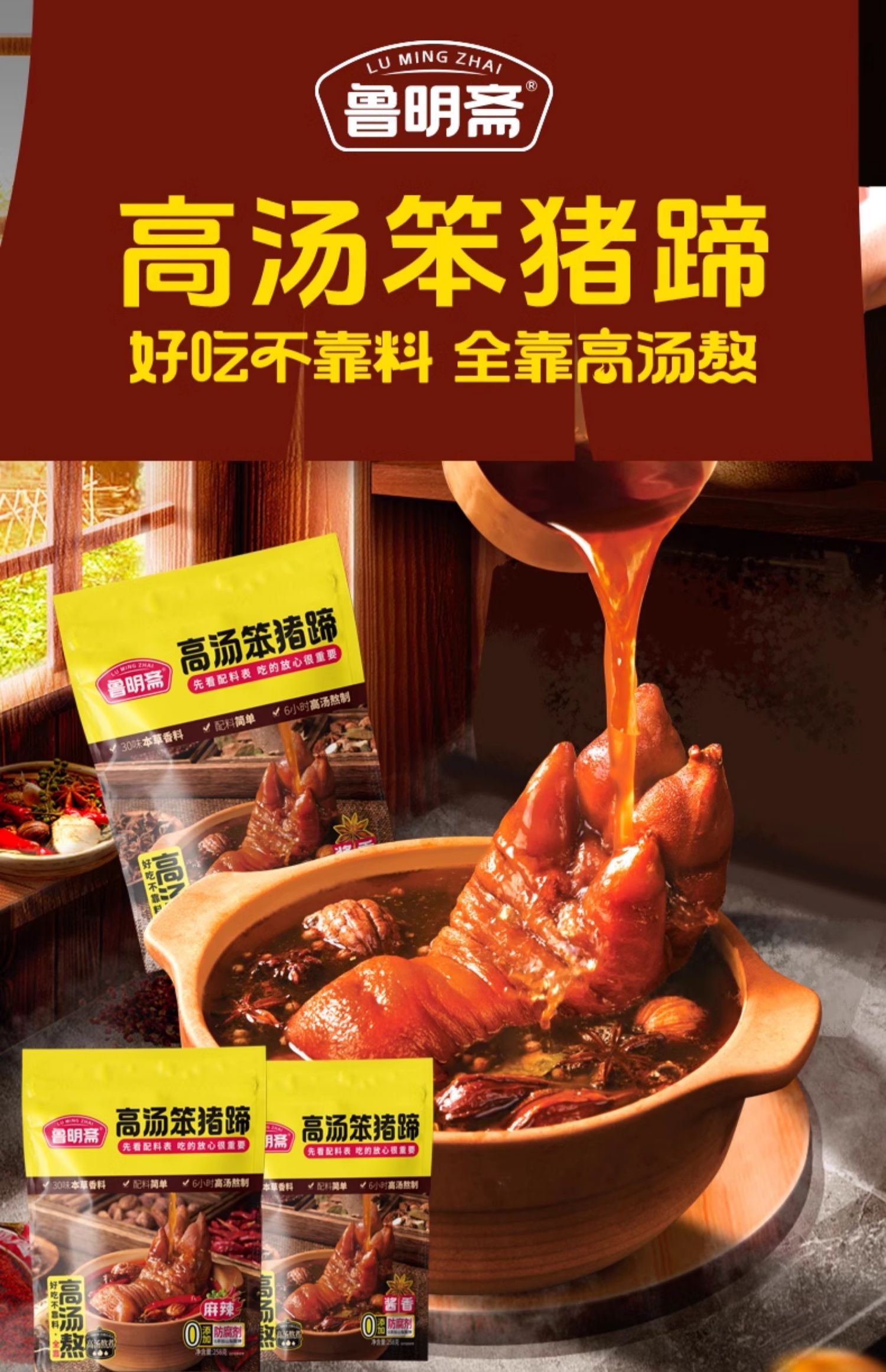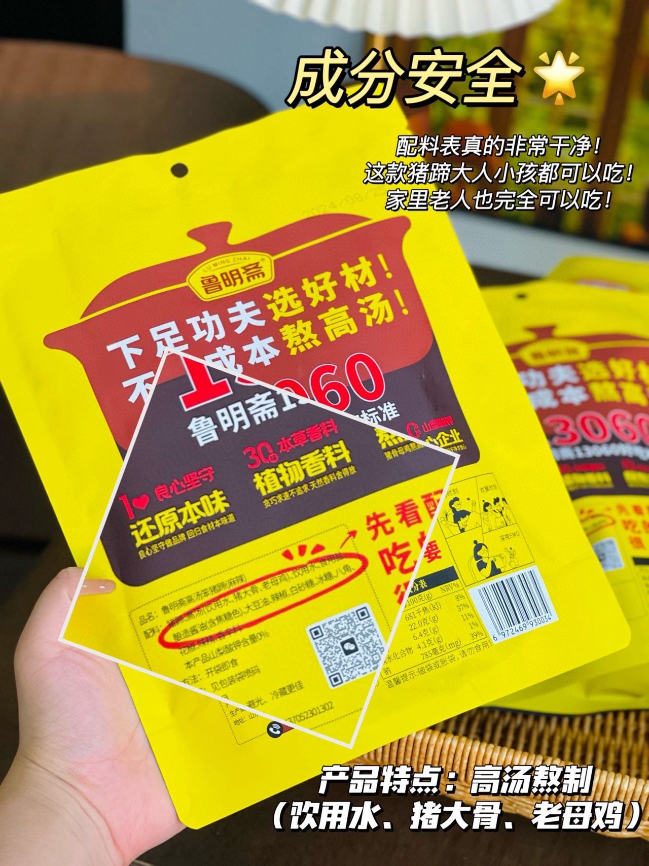 【地道风味丨鲁明斋 高汤笨猪蹄258g*1/3袋】由饮用水、猪大骨、老母鸡和30味本草香料熬制而成,口感浓郁醇厚软嫩爆汁,每一个都是独立包装,便于携带,开袋即食,加热口感更佳