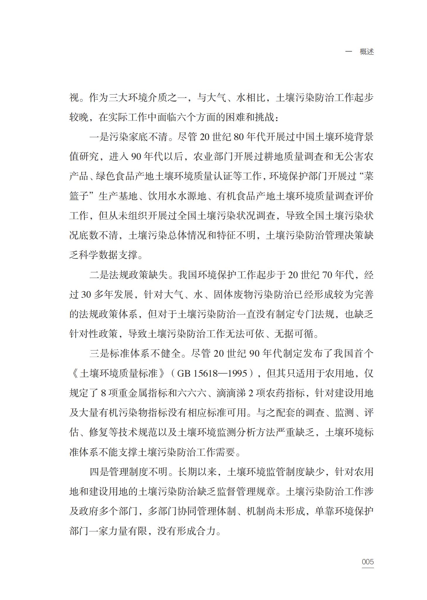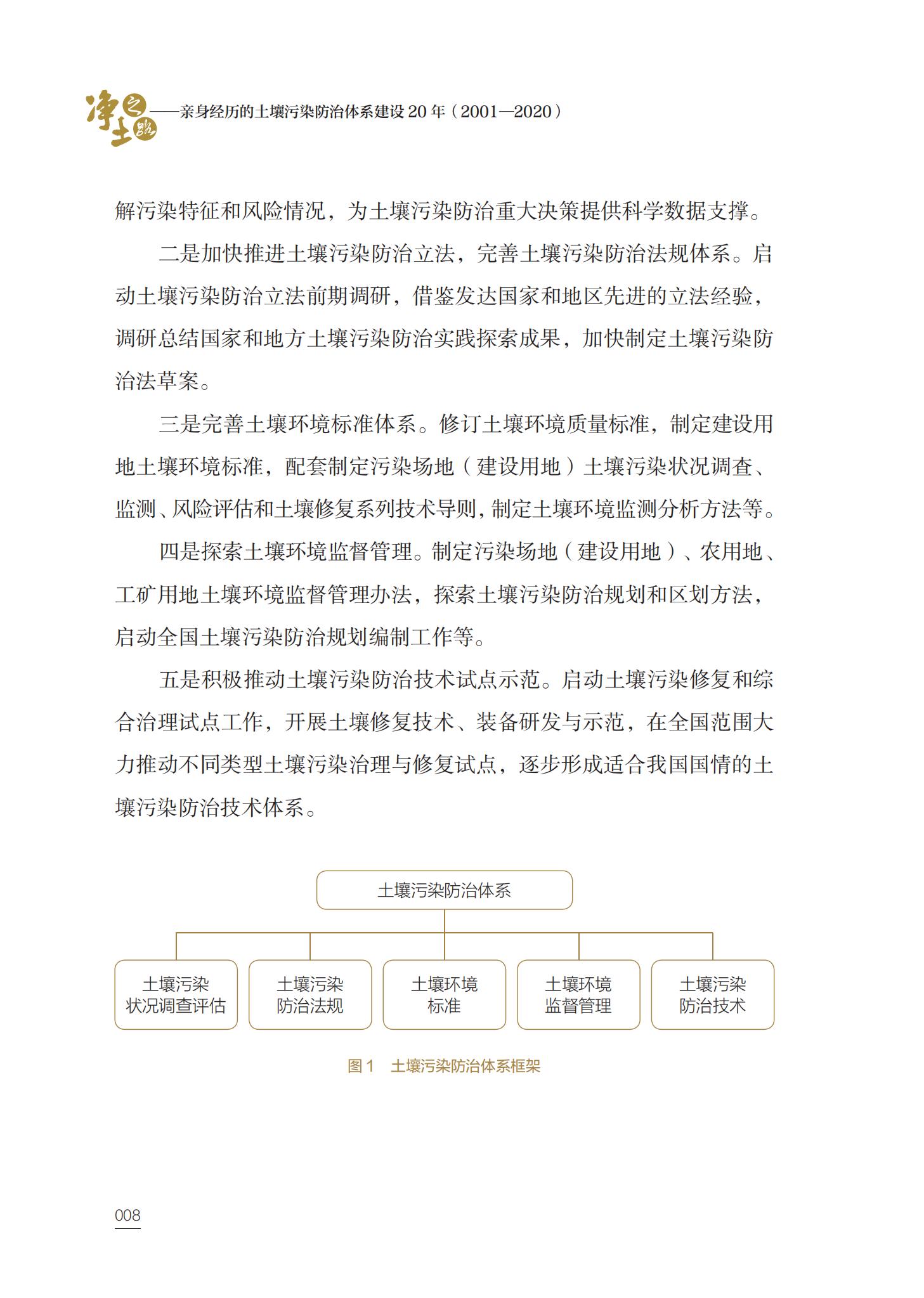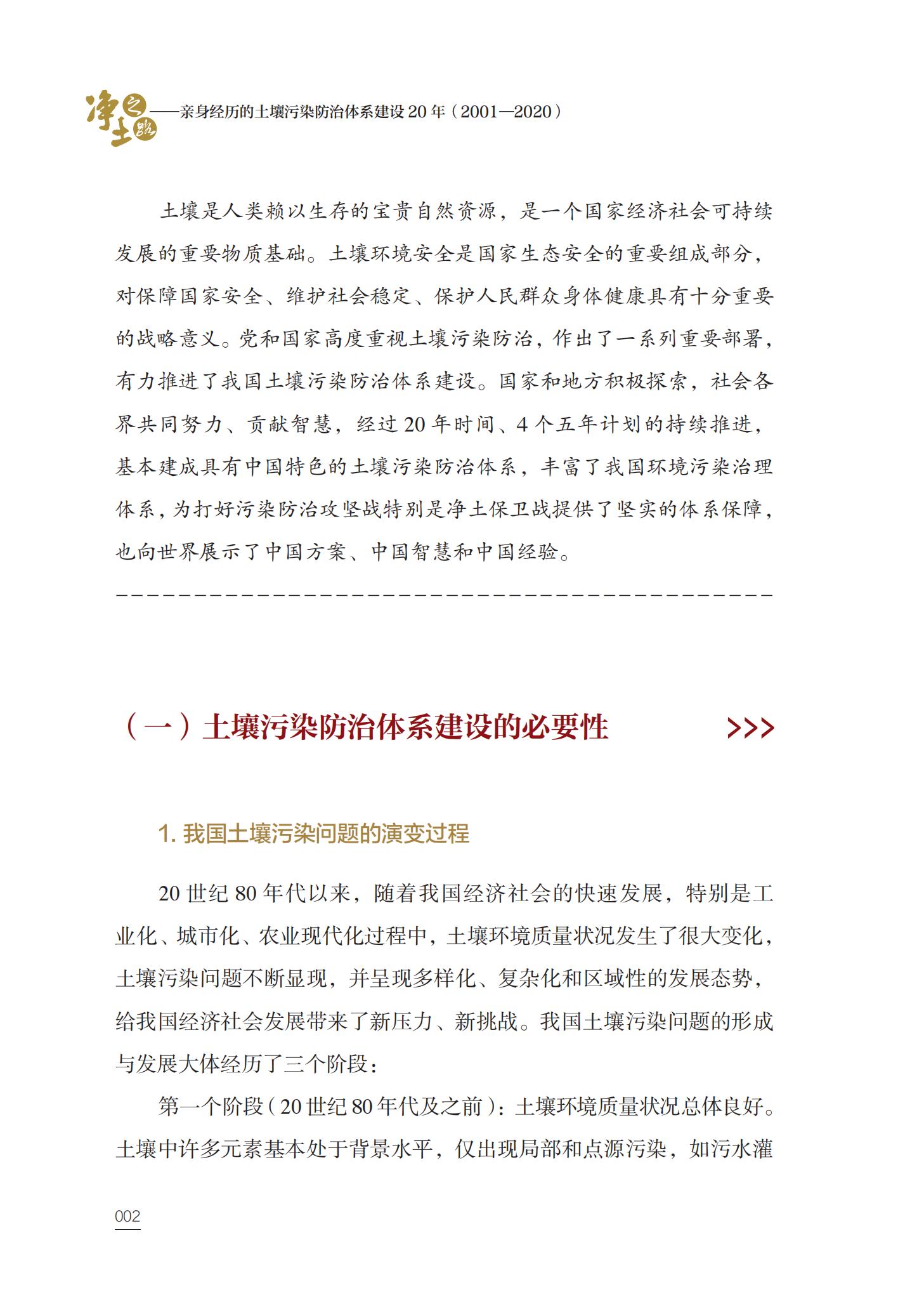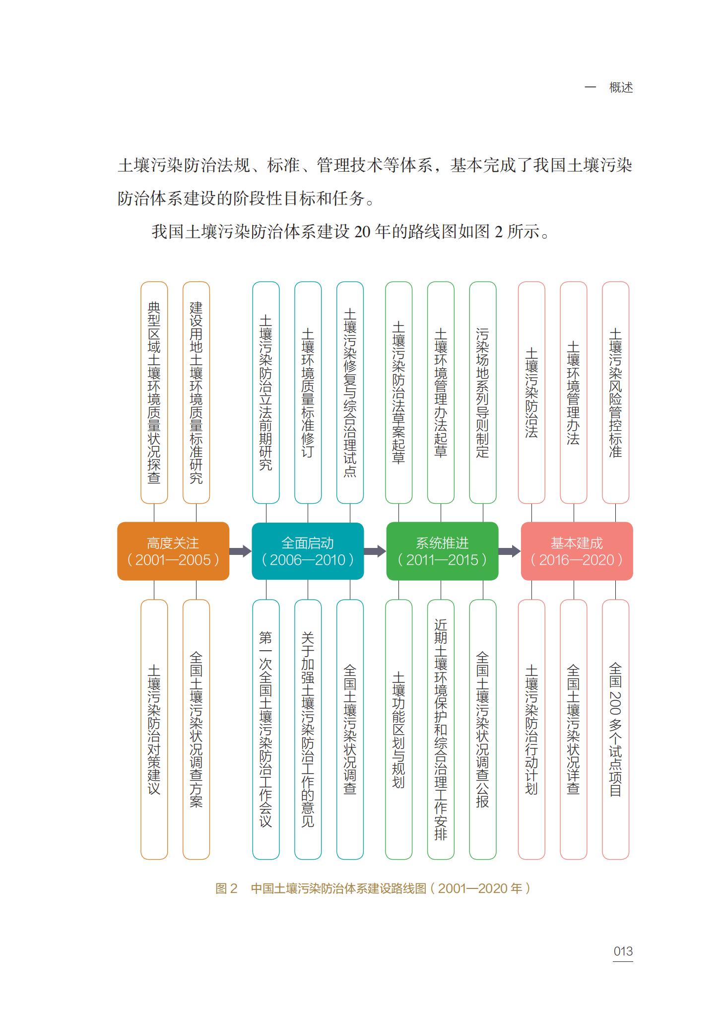 土壤污染防治体系建设是一项系统工程,涉及土壤污染调查、法规、政策、标准、管理和技术等方方面面。我国土壤污染防治工作起步较晚,直至 2000 年左右土壤污染防治体系仍几乎为空白。从 2000 年开始至 2020 年,整整用了20年的时间,历经了高度关注、全面启动、系统推进、基本建成四个阶段,我国基本形成了土壤污染防治法规、标准、管理技术等体系,基本摸清了我国土壤污染状况,基本遏制住土壤污染恶化态势,基本控制住土壤污染风险,基本建成了国家土壤污染防治体系,全面提升了土壤污染治理能力。