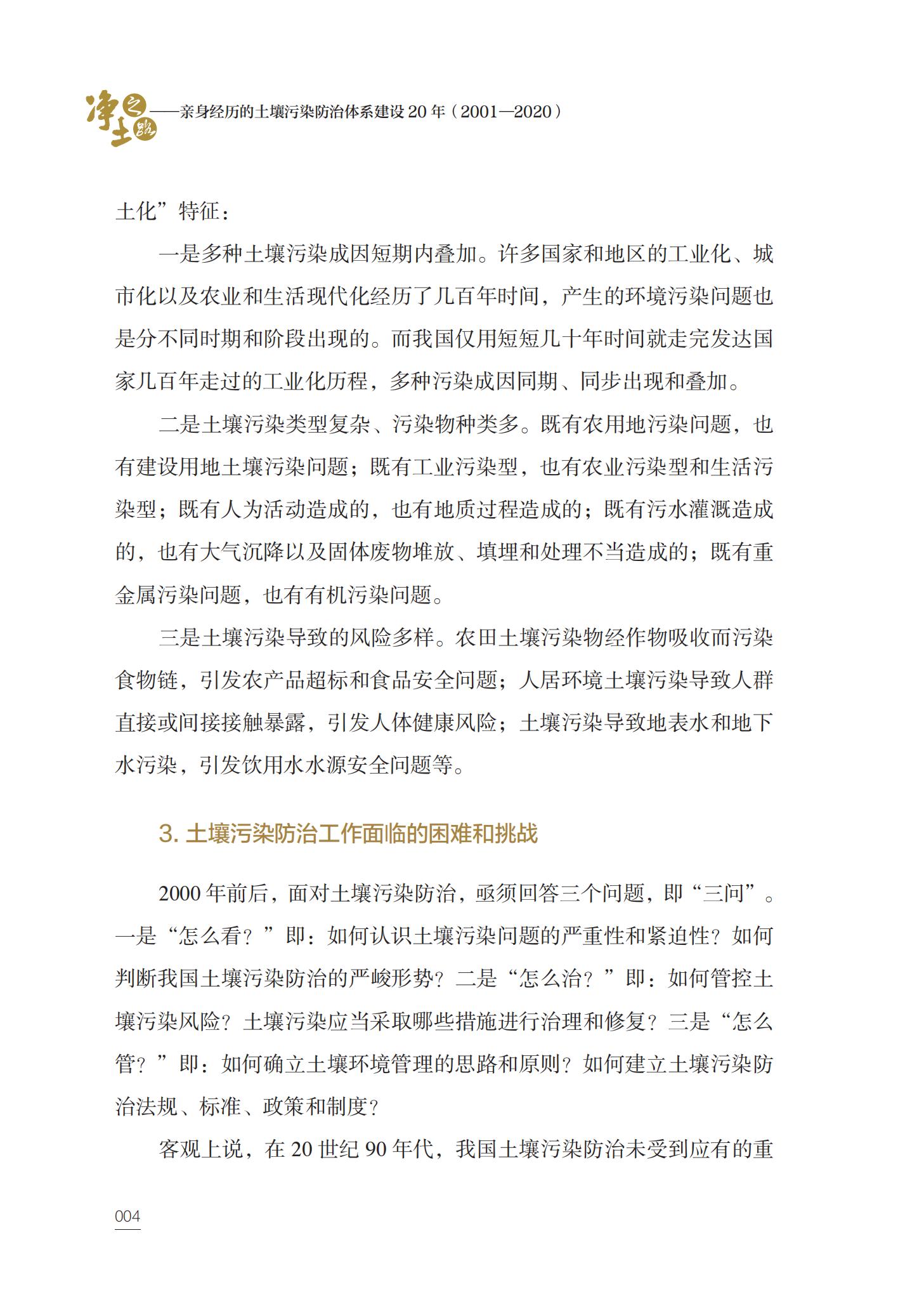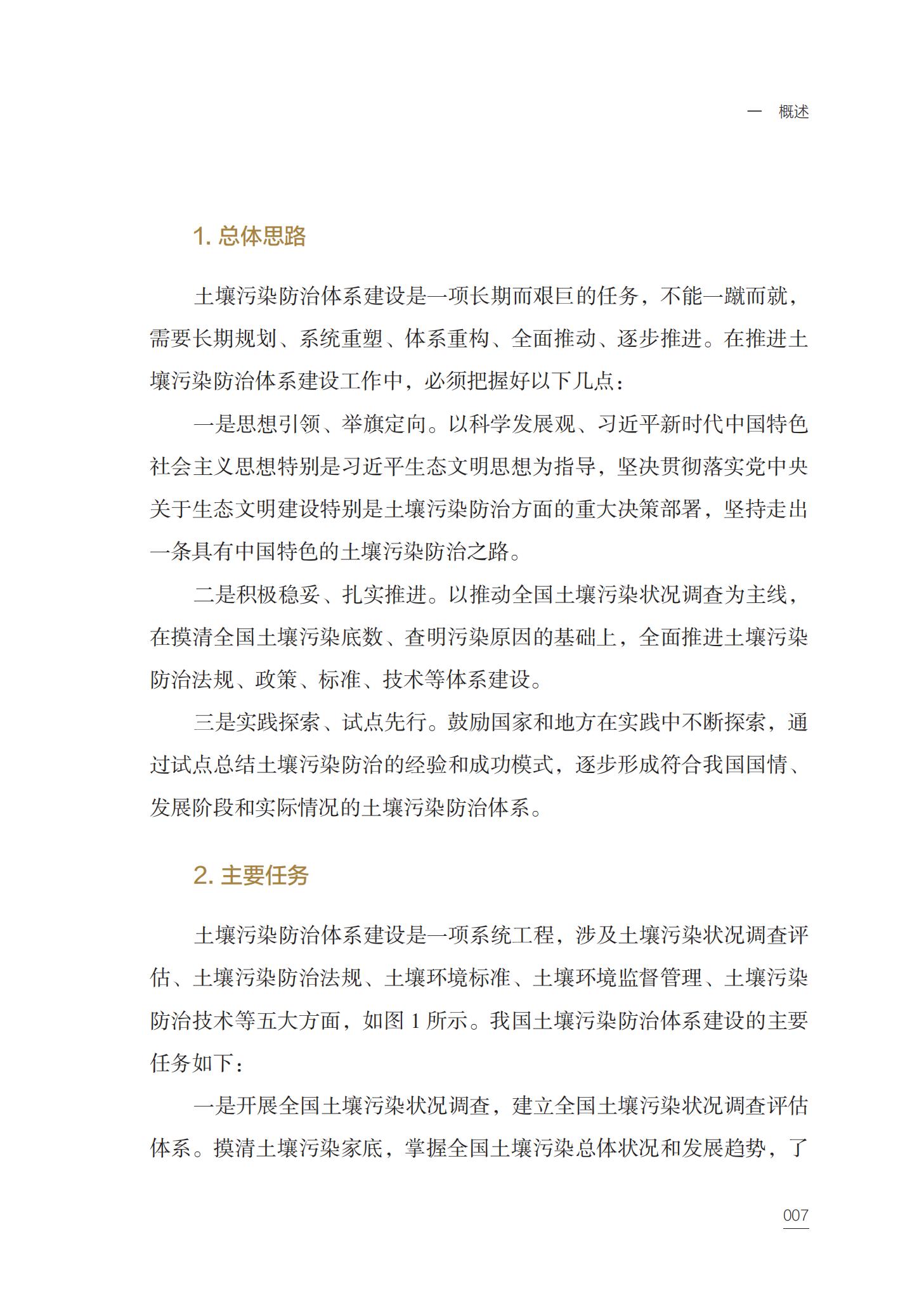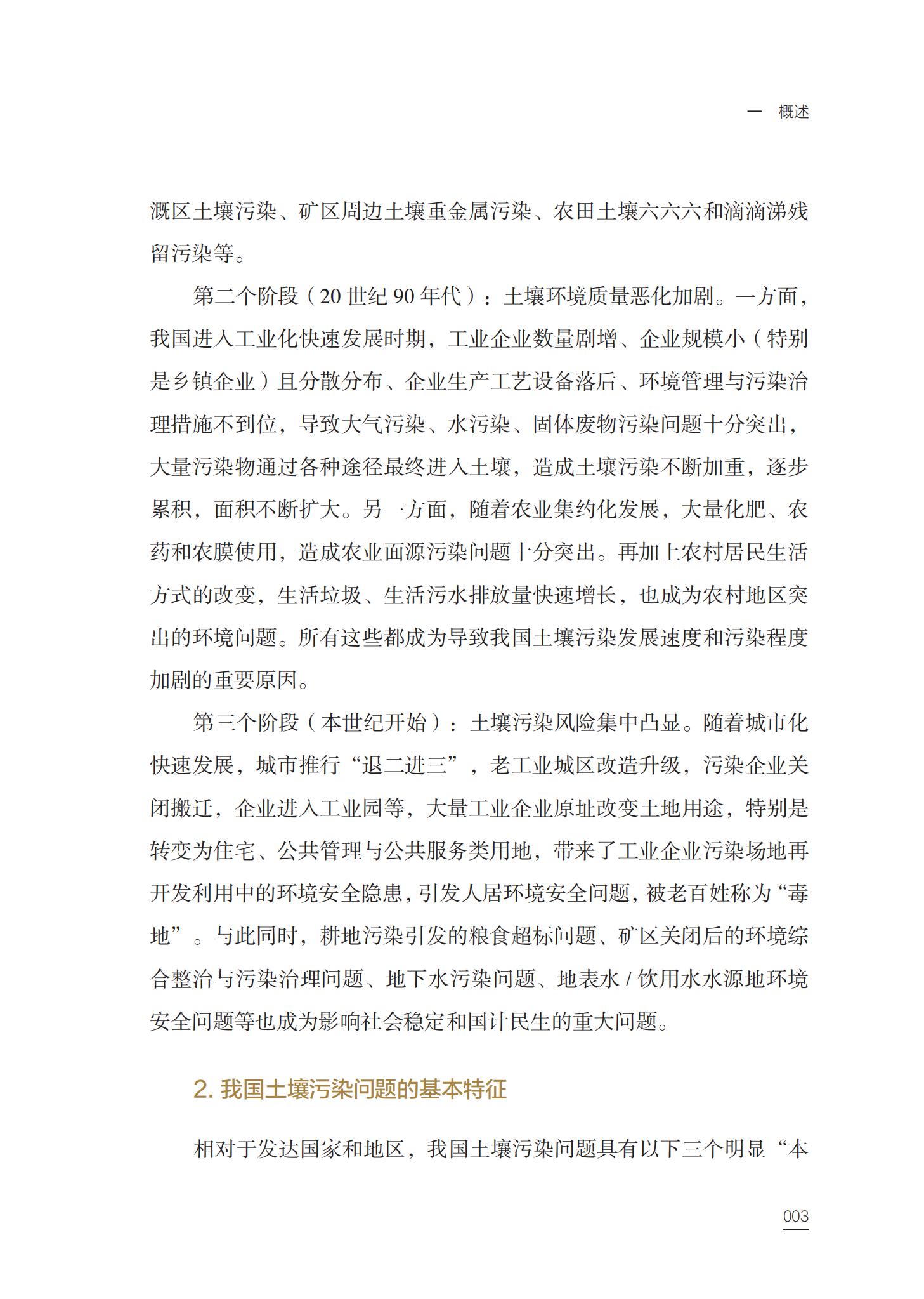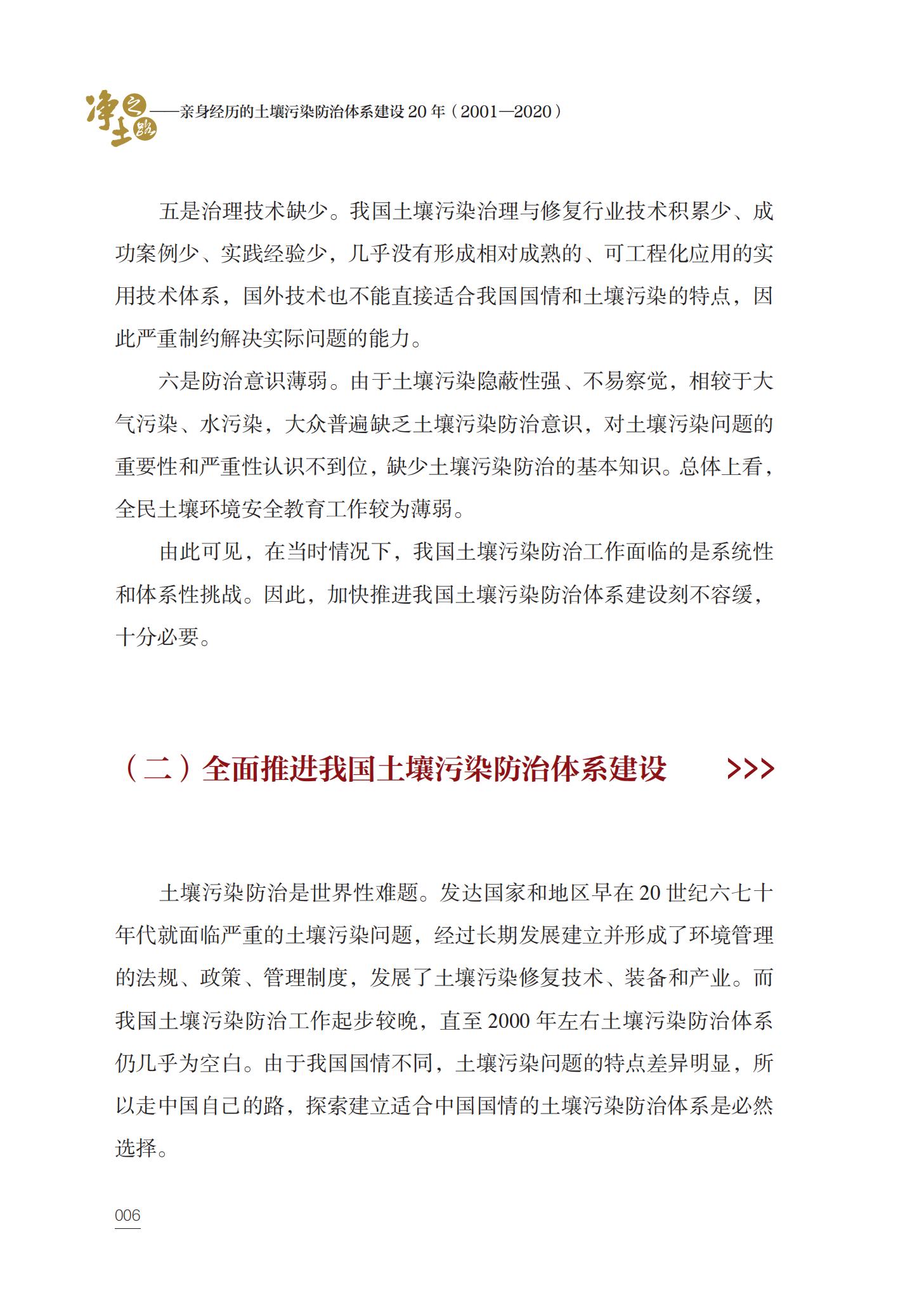 土壤污染防治体系建设是一项系统工程,涉及土壤污染调查、法规、政策、标准、管理和技术等方方面面。我国土壤污染防治工作起步较晚,直至 2000 年左右土壤污染防治体系仍几乎为空白。从 2000 年开始至 2020 年,整整用了20年的时间,历经了高度关注、全面启动、系统推进、基本建成四个阶段,我国基本形成了土壤污染防治法规、标准、管理技术等体系,基本摸清了我国土壤污染状况,基本遏制住土壤污染恶化态势,基本控制住土壤污染风险,基本建成了国家土壤污染防治体系,全面提升了土壤污染治理能力。