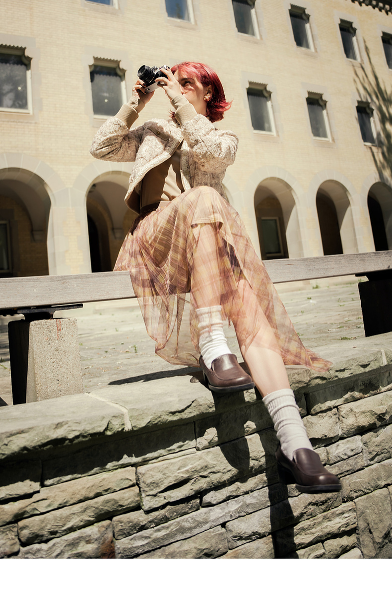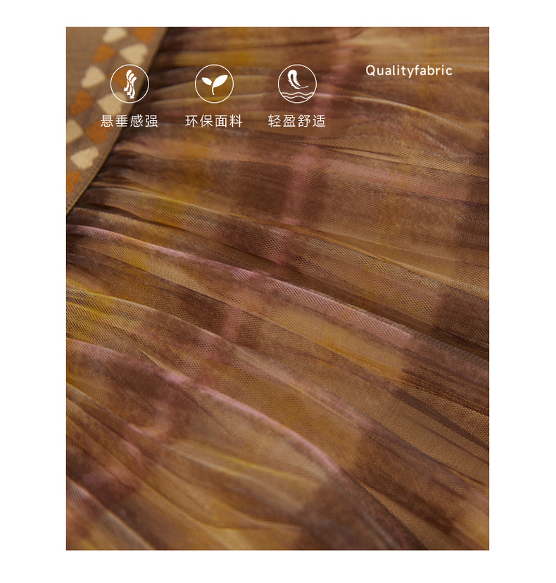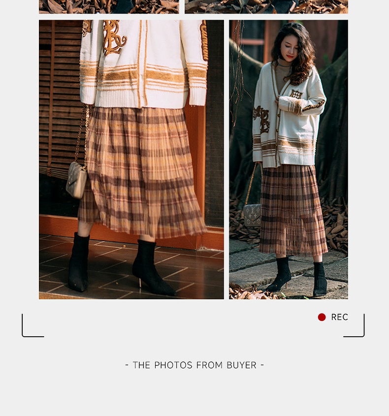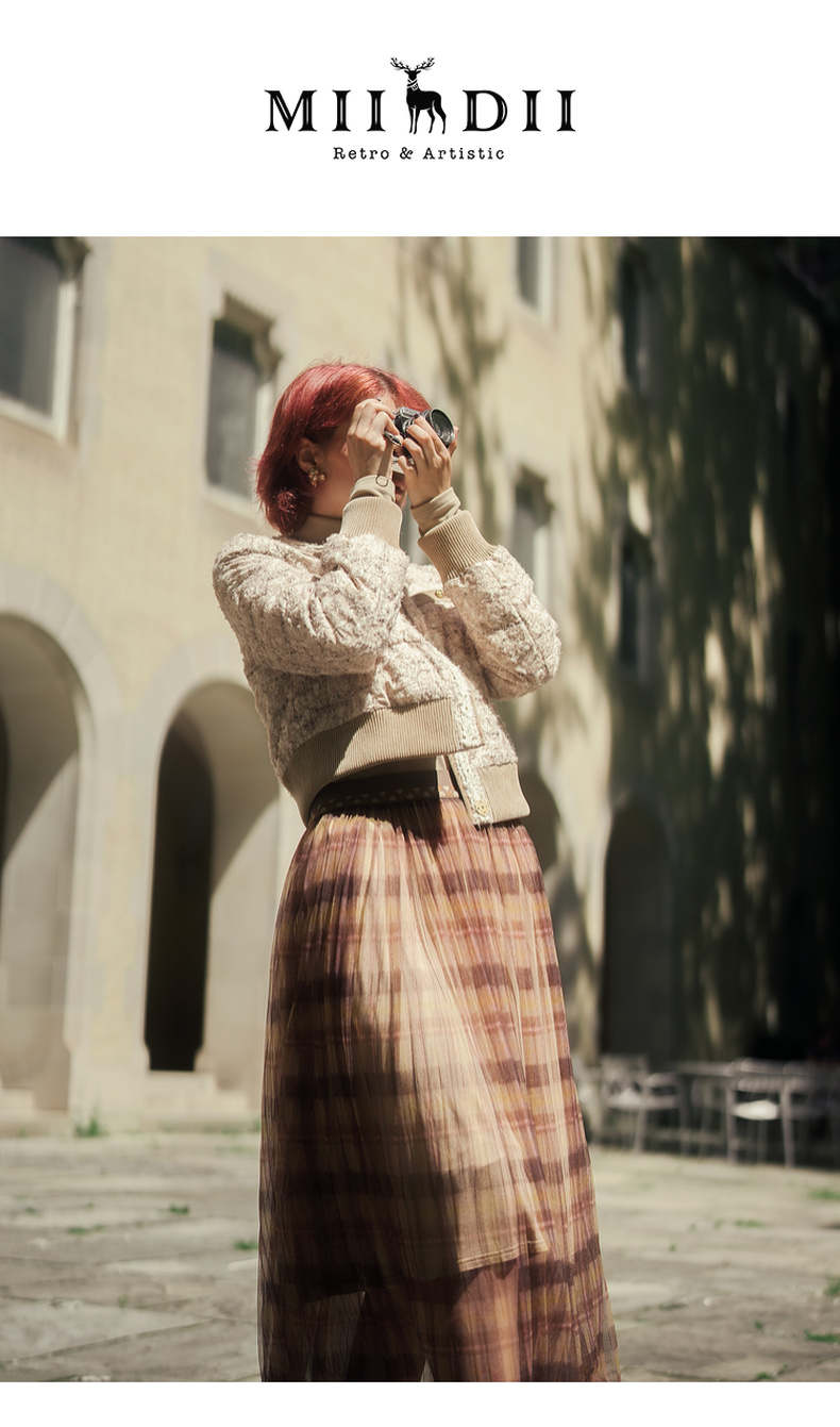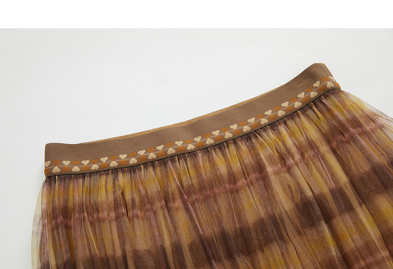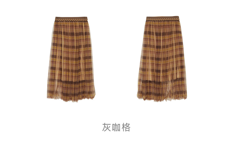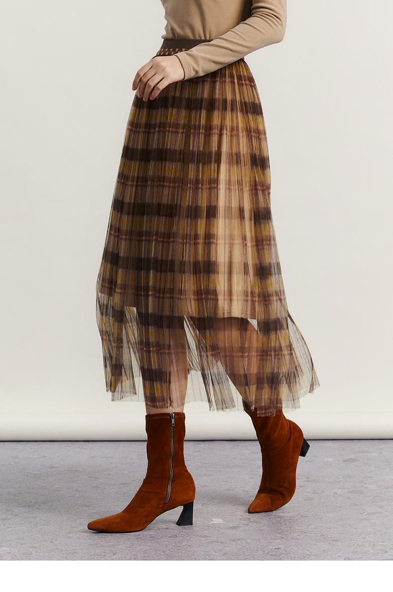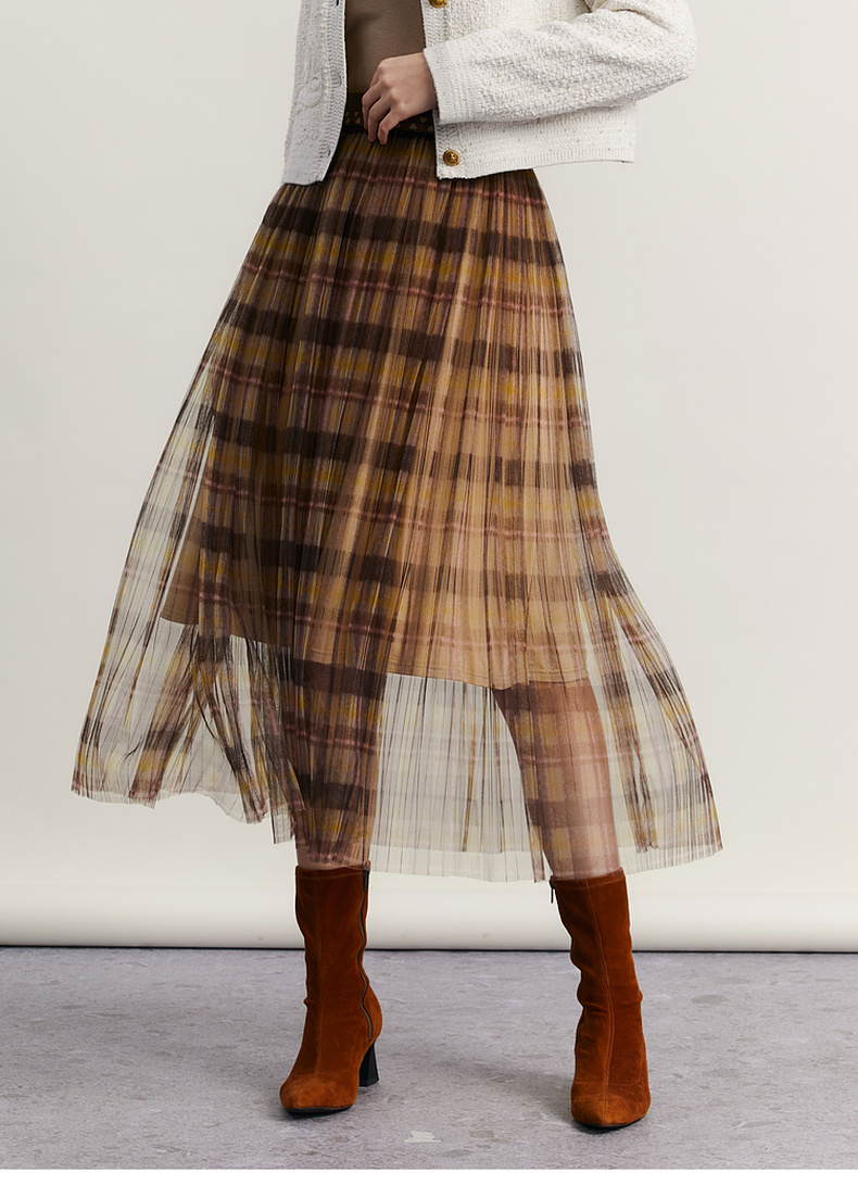 谜底格子半身裙女2023冬季新品复古浪漫网纱拼接中长裙234MB1569