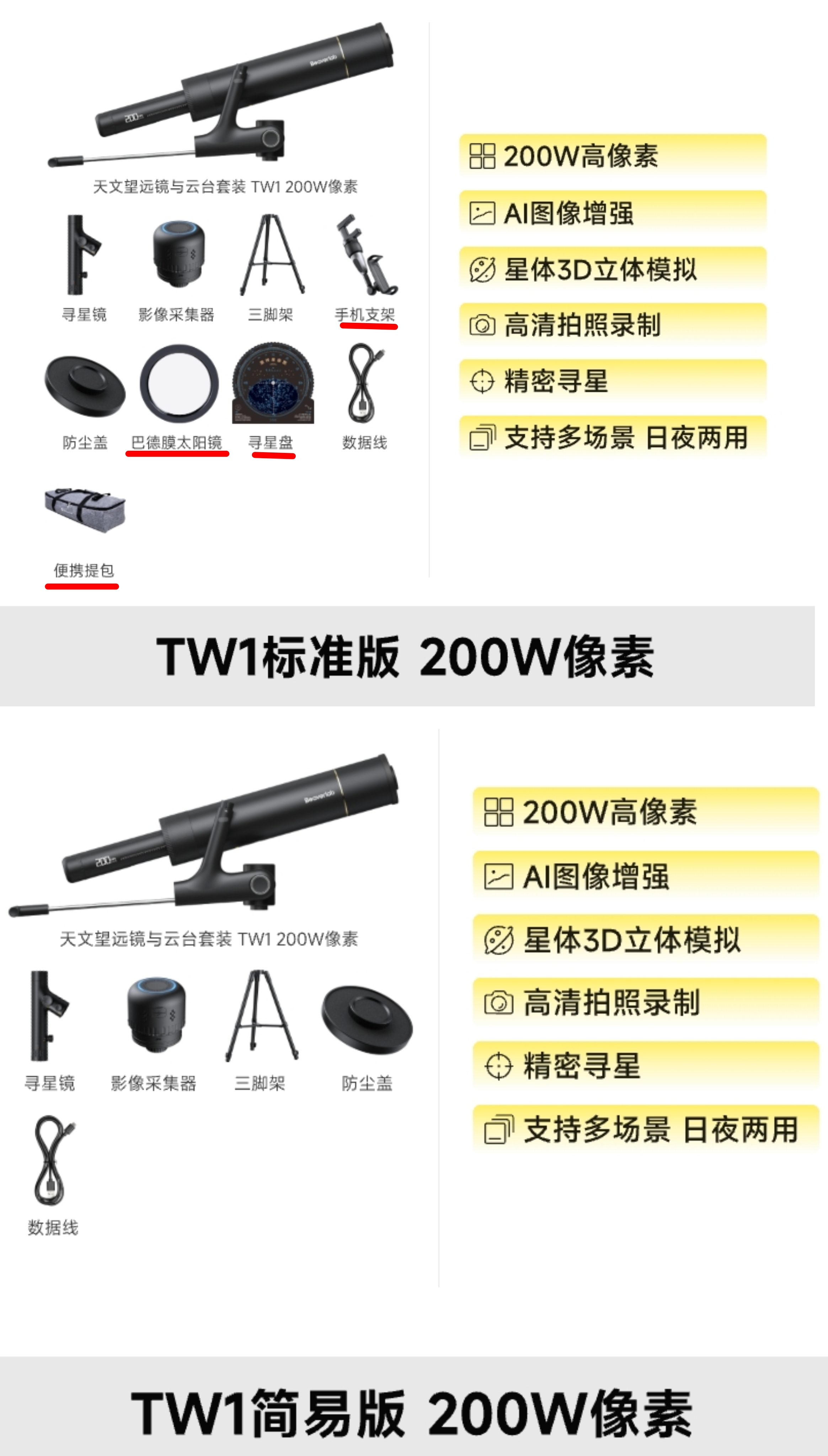 本次开团的TW1天文望远镜在标准版的基础上减去了手机支架/巴德膜太阳镜/寻星盘/和便携提包。