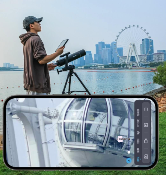 它的内部配置了WiFi组模,自研APP只需连接手机、平板电脑,台式电脑等智能设备,就可以通过望远镜自带的WiFi热点在我们的智能显示屏上传输观看。