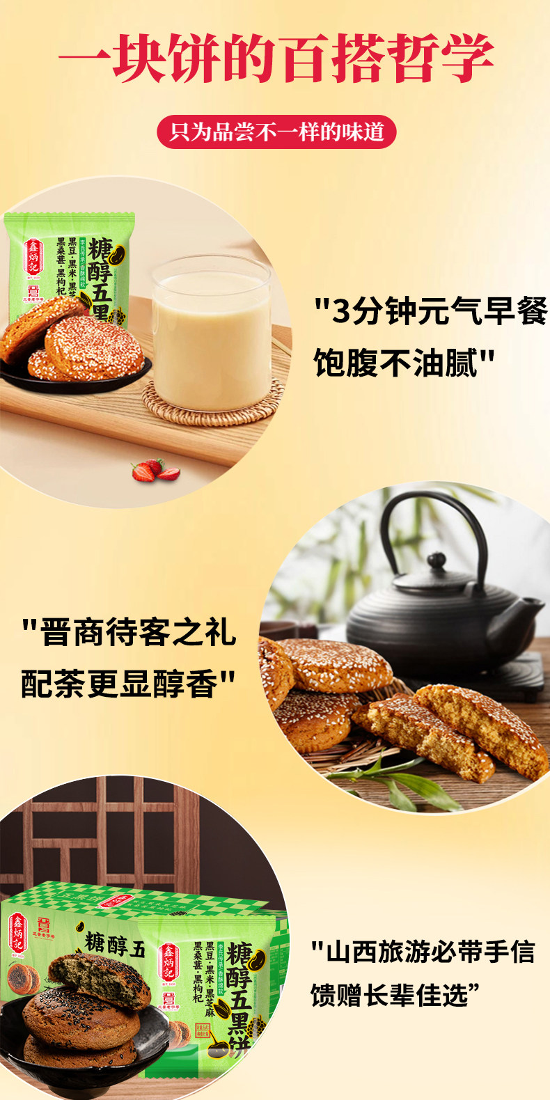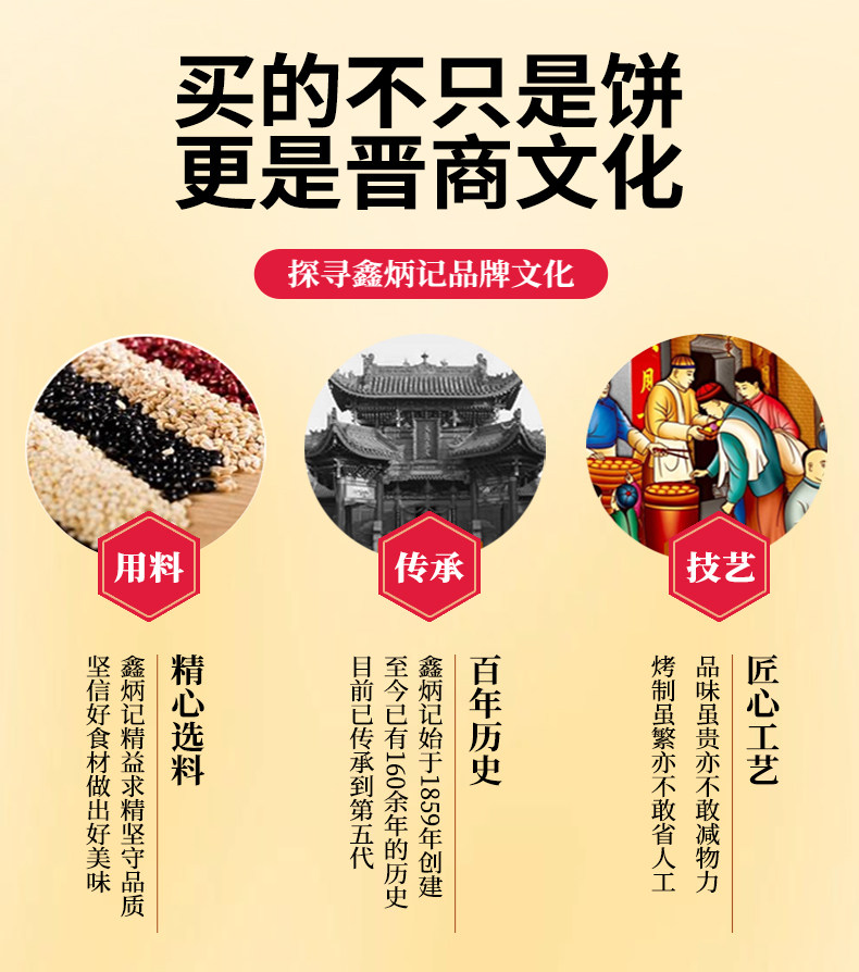 - 鑫炳记始于1859年,历经五代传承,传承百年工艺,从选取原料到烘烤出炉,都严格遵守祖传古方,让百年太谷饼焕发新的魅力。
