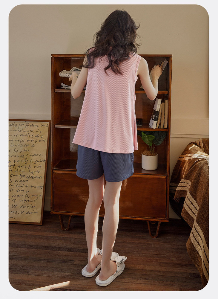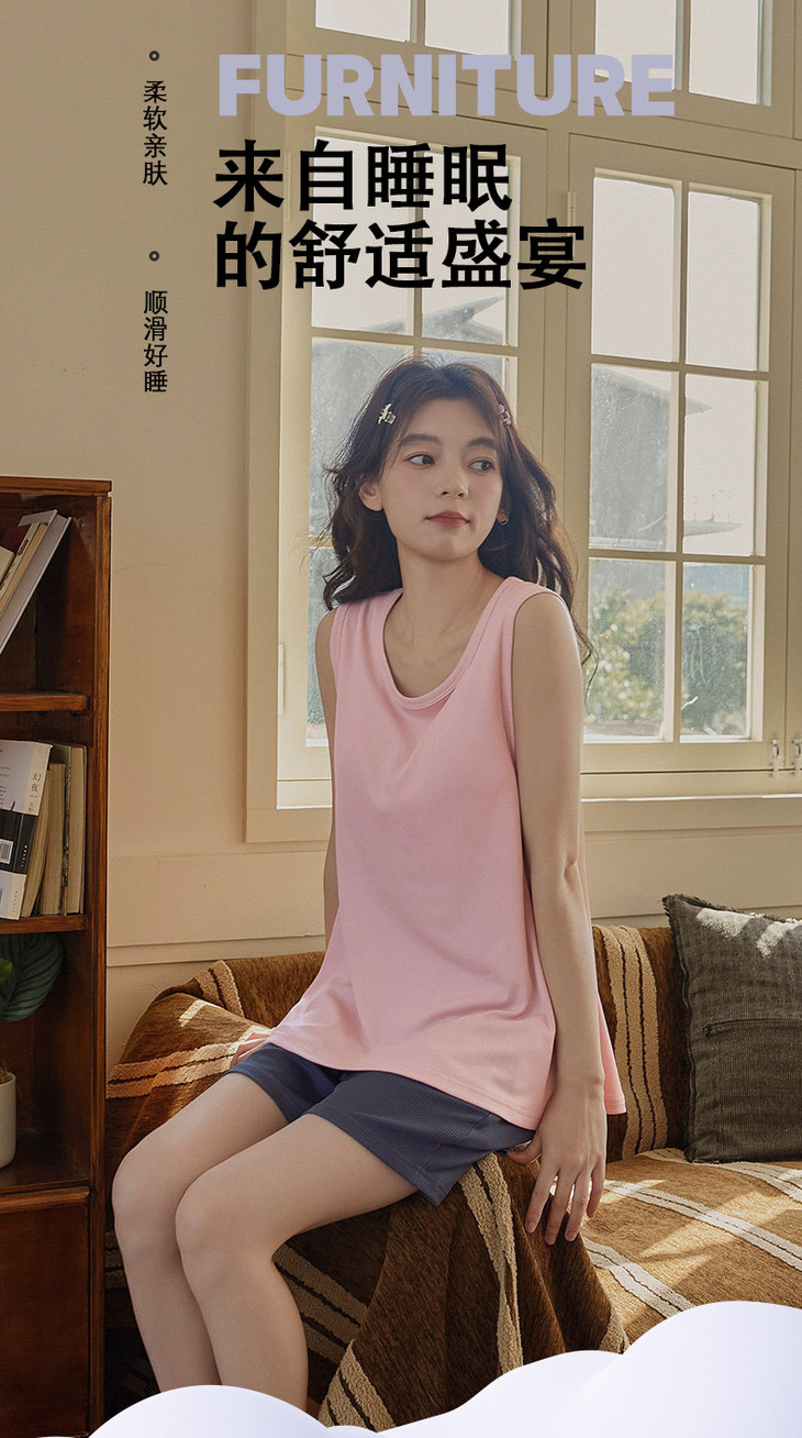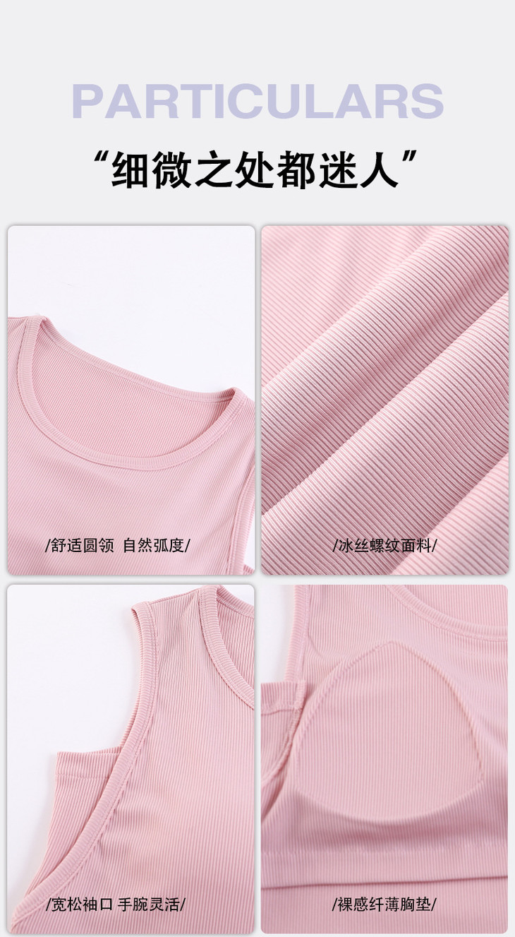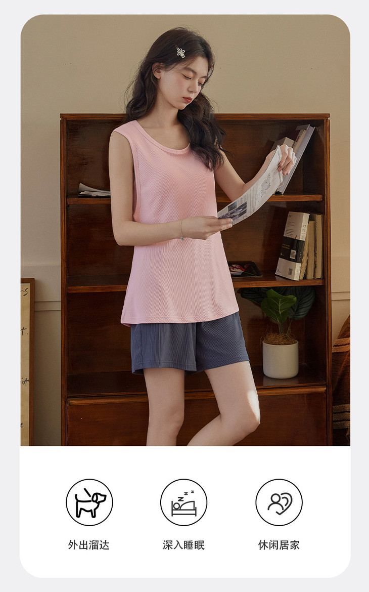 夏季新款冰丝螺纹睡衣女士简约纯色背心带胸垫家居服凉爽套装