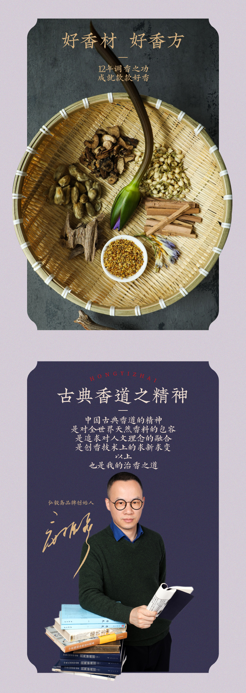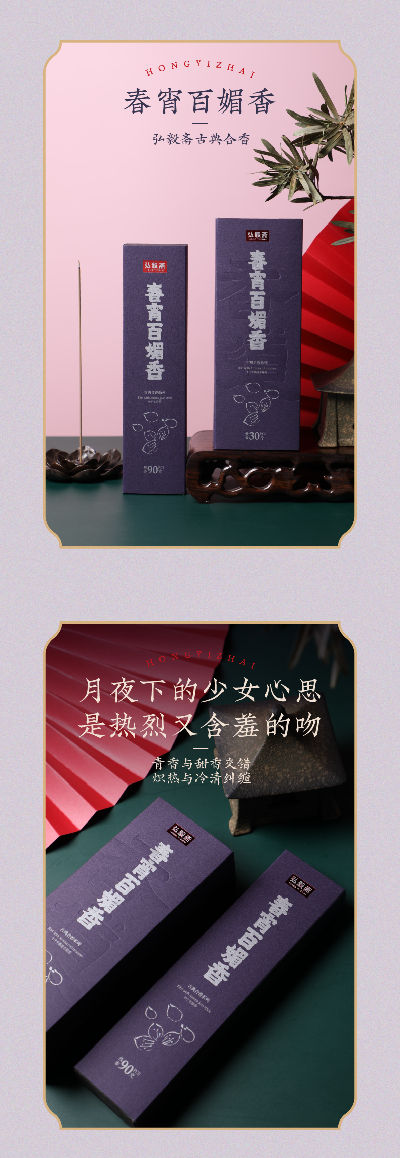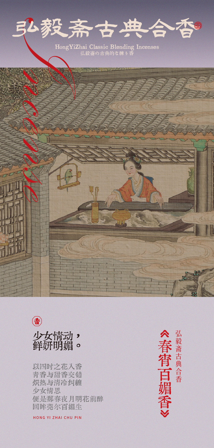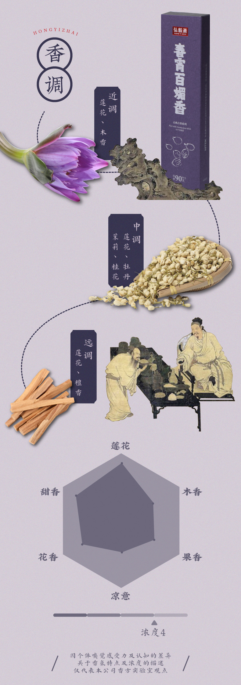 脱胎于香学集大成著作明代周嘉胄所撰《香乘》——法和众妙卷之春宵百媚香方;取百花香,但以莲花为主调,以余花修饰并圆润莲花香气,使得百花香气更具识别度,弃用苏合香油,不用膏脂气息干扰花香,代之以甜润的树脂香,增强香氛的扩散力;