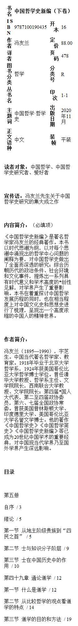 中国哲学史新编(下卷)冯友兰 著 商务印书馆
