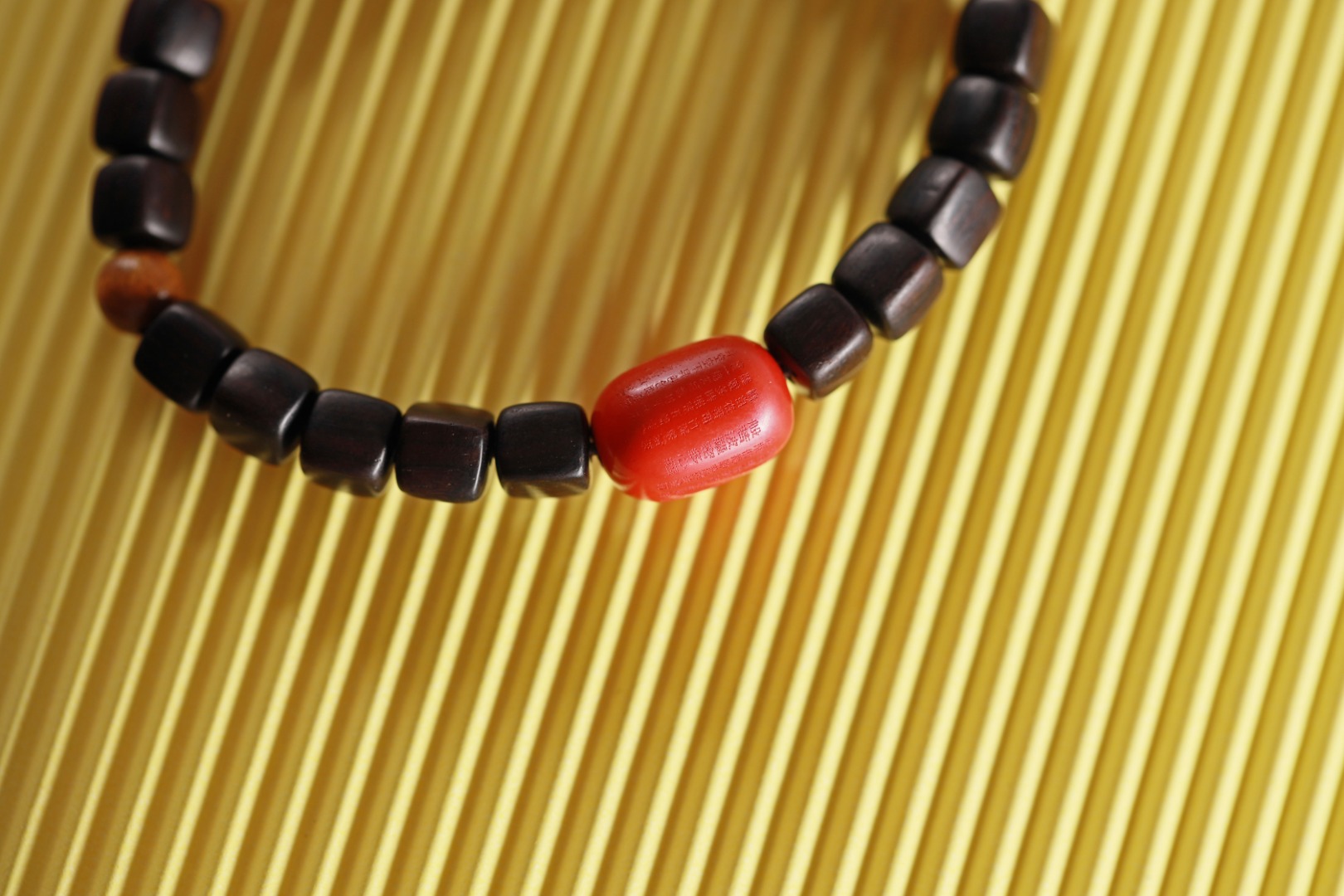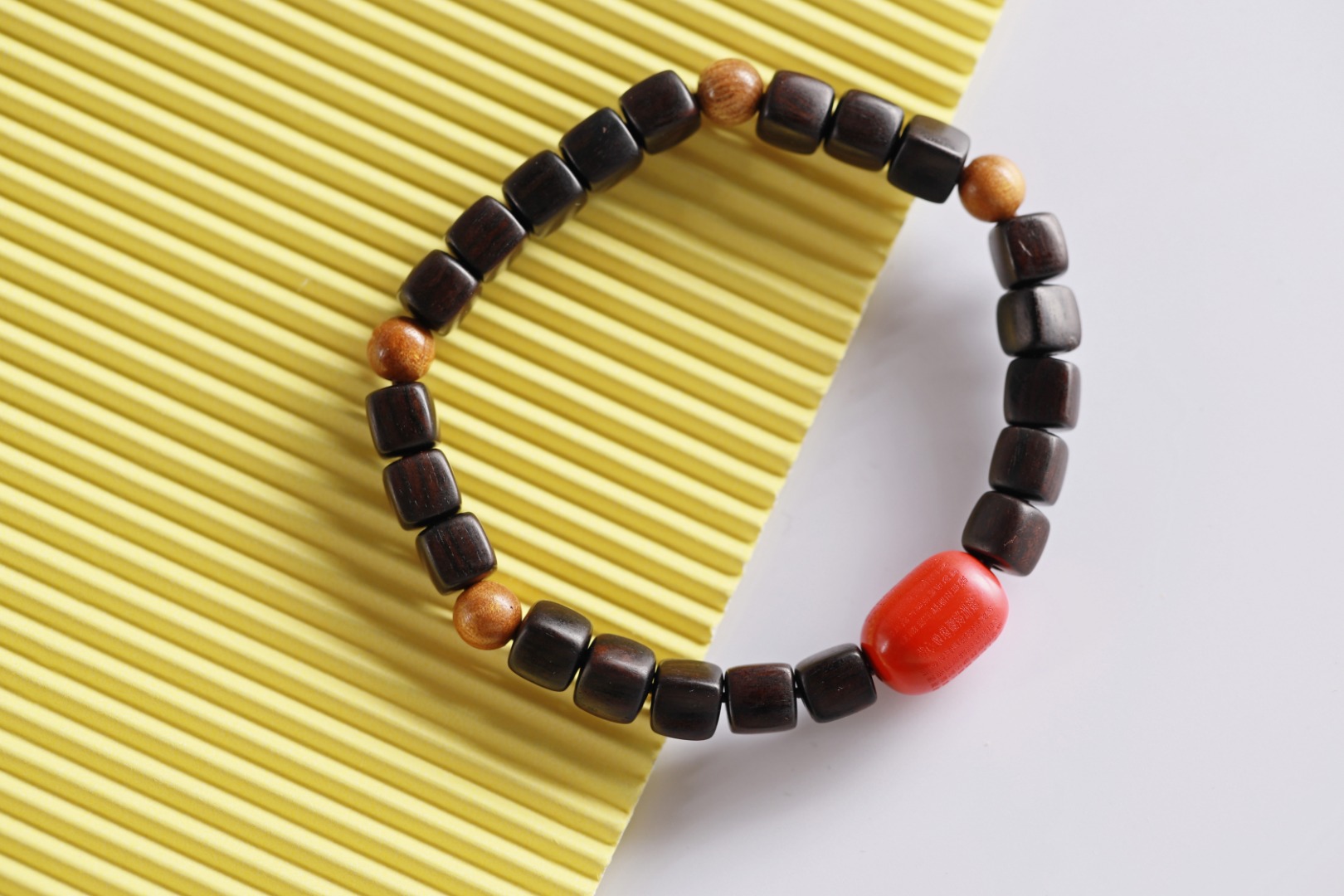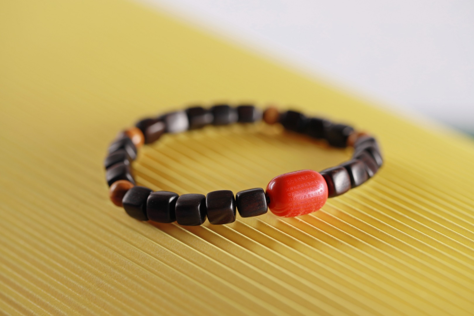 紫光檀是产于热带雨林地区,生长期非常缓慢,木料极其珍贵,材质细腻,密度大,棕眼小而稀少,硬度大。小方块又叫四方来财珠寓意四方来财,幸运星,吉祥又幸运,搭配的朱砂心经,护佑平安,辟邪化煞,趋吉避祸