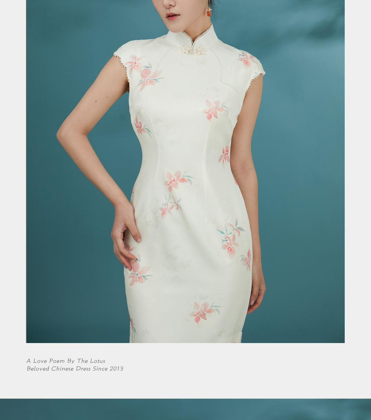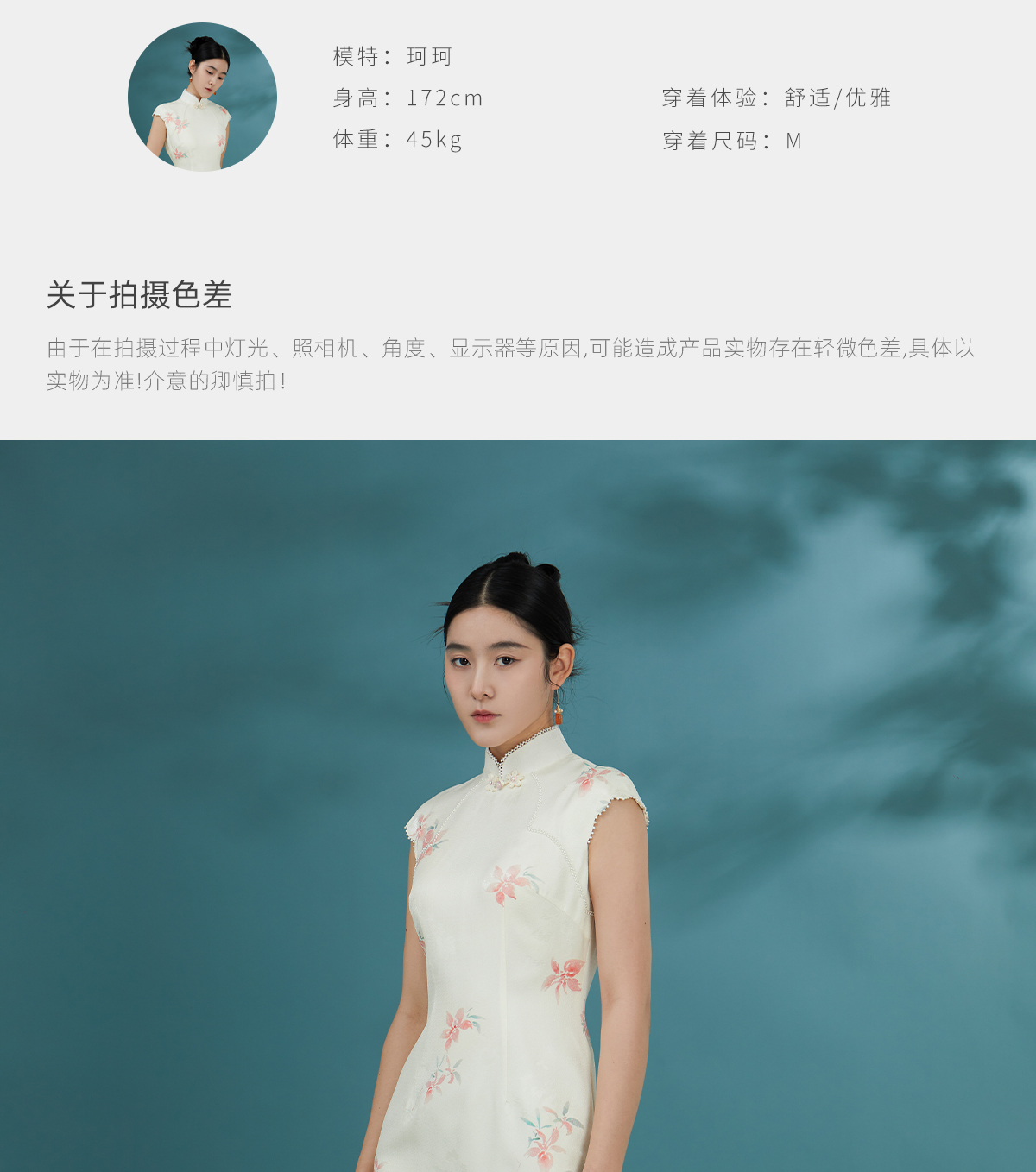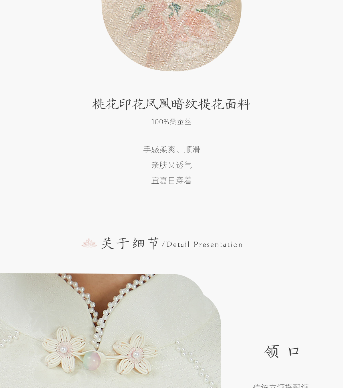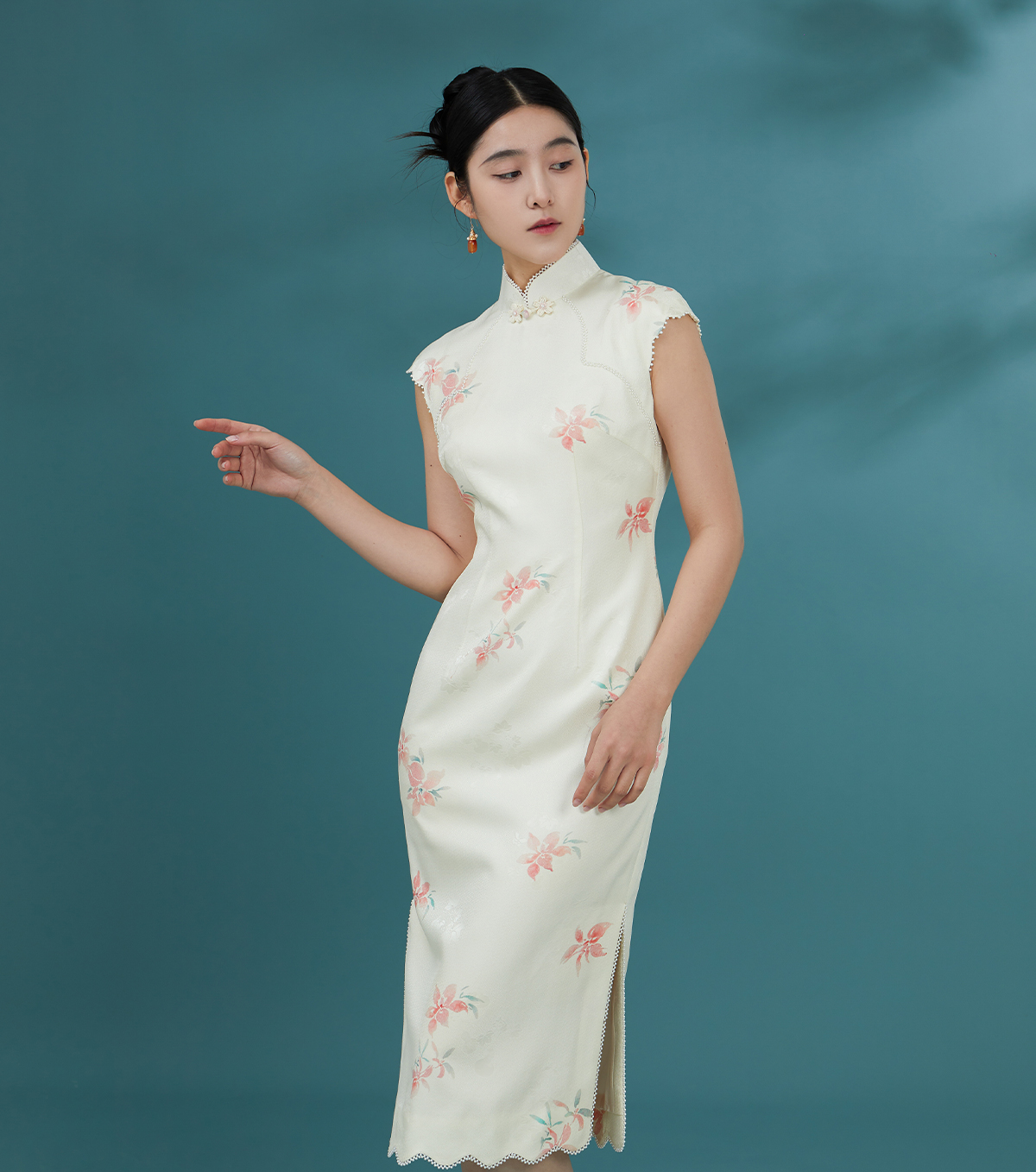 荷言HEYEN 云岫 桃花印花真丝立领旗袍缠线花朵盘扣高级定制