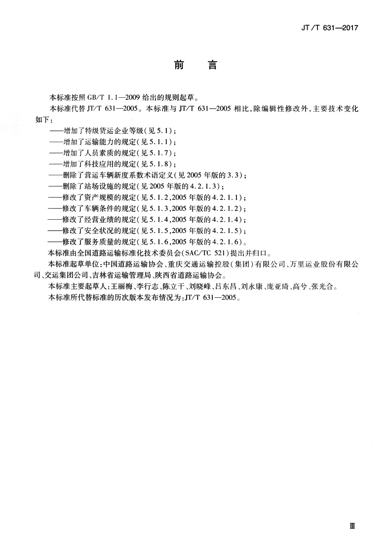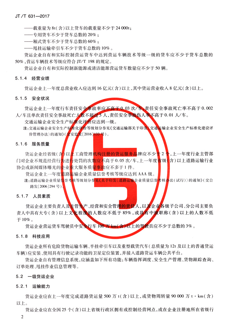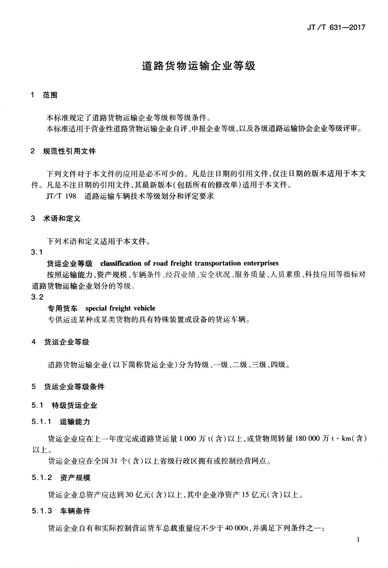 | 道路货物运输企业等级 JT/T 631—2017 | ||
