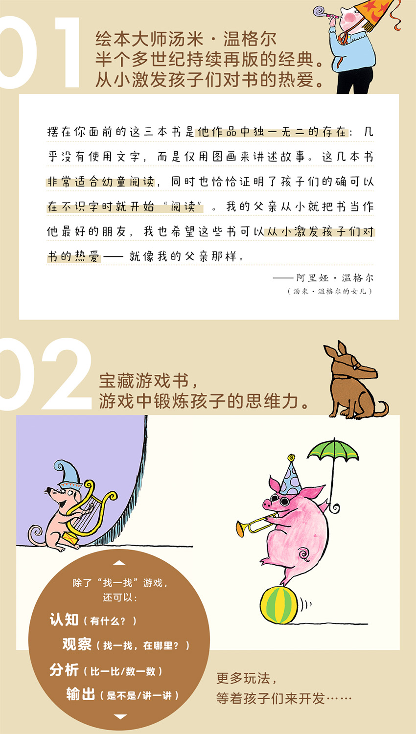 绘本大师汤米·温格尔以其独特的视角和画风,把绘本变成充满惊喜的游戏,在让小朋友在惊喜不已的“找一找”游戏中,引导小读者去认知、观察、分析和分享,在享受“找到”的乐趣的同时更锻炼了孩子的思维能力。而这一幅幅图,更是给小读者们提供了一个个入口,让孩子们可以体验想象和创造的乐趣。