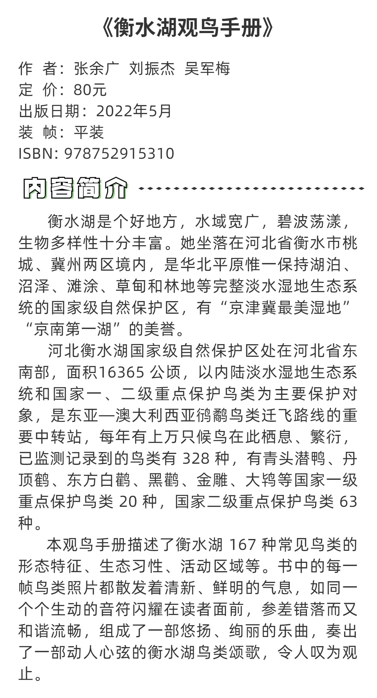 衡水湖观鸟手册(精) 张余广//刘振杰//吴军梅 1531 中国林业出版社