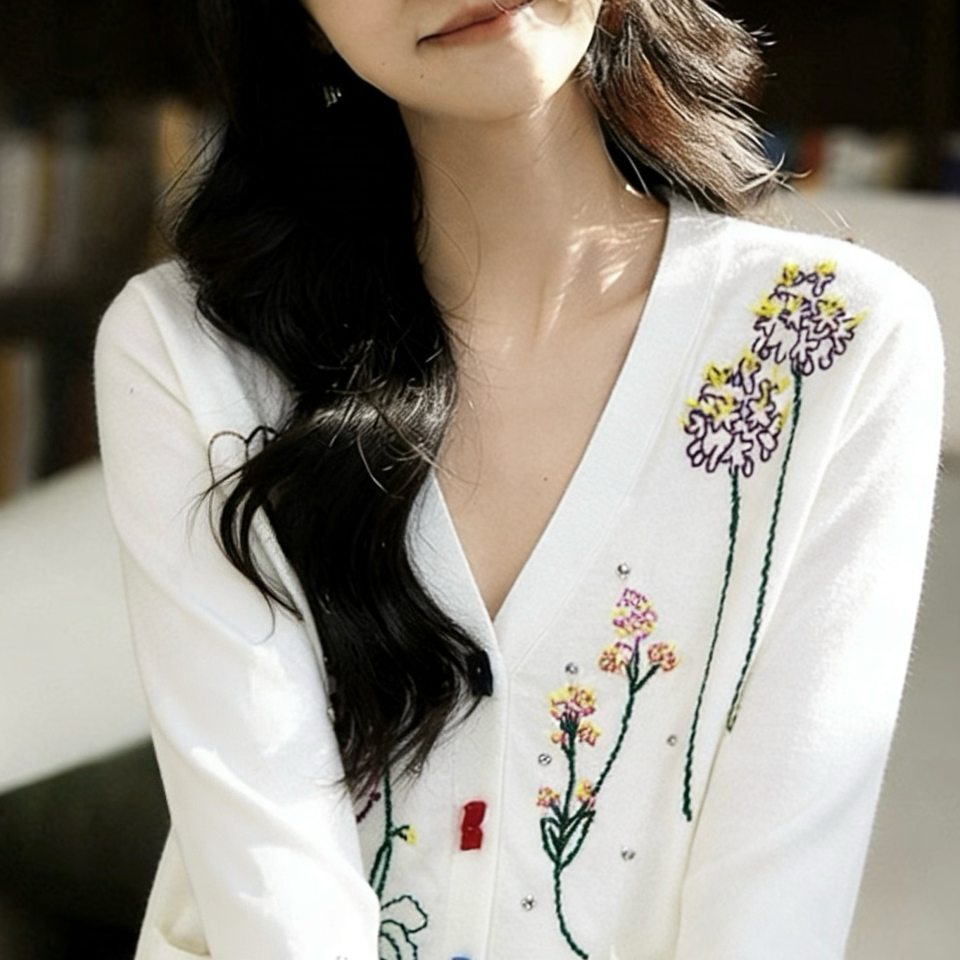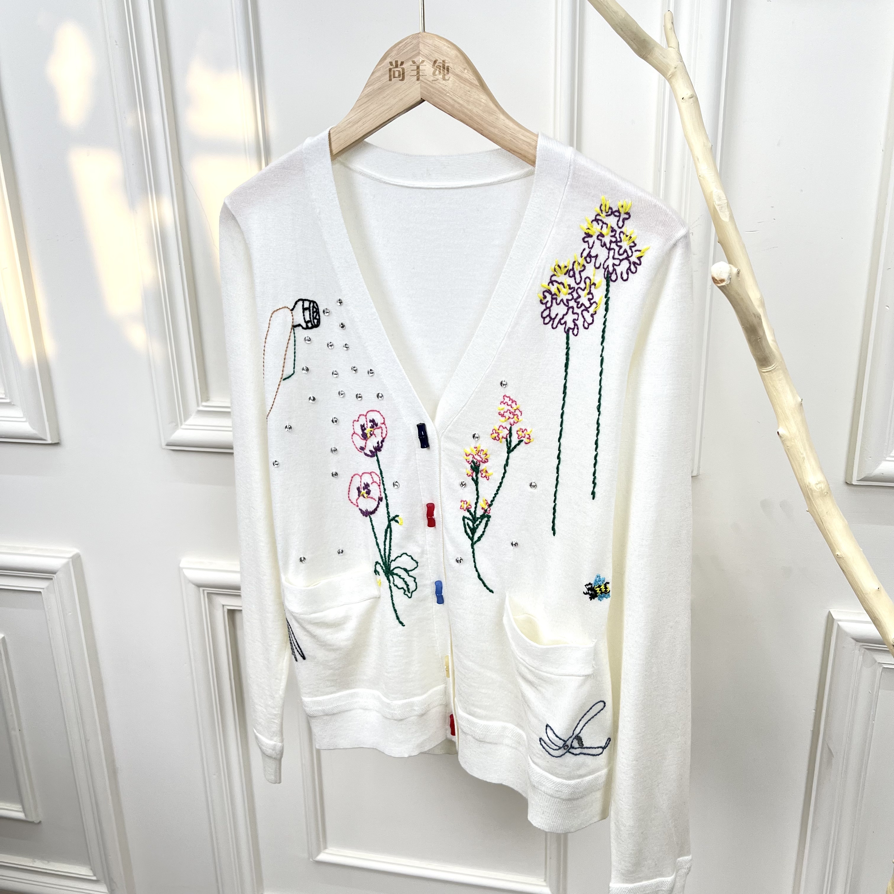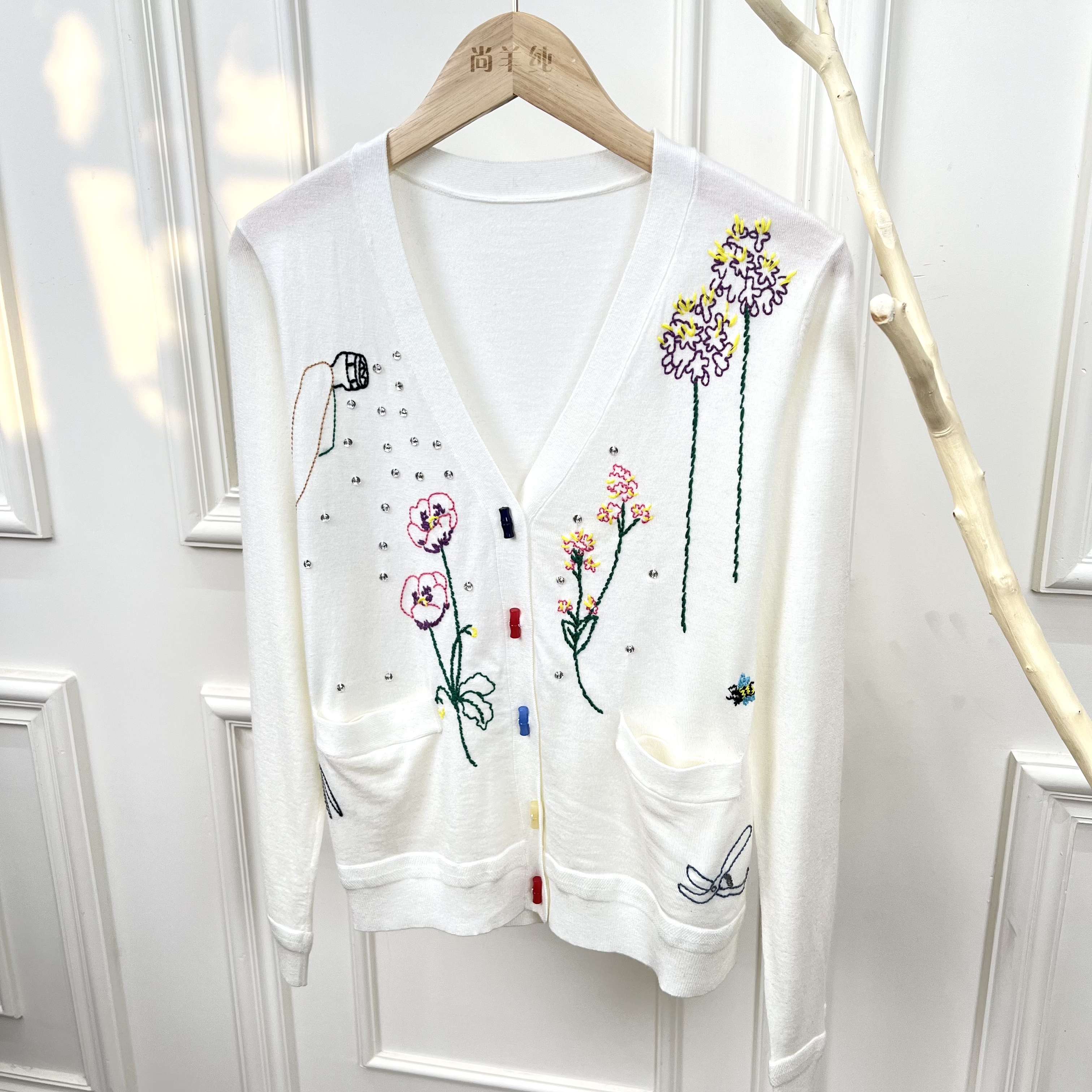 闲趣时光~V领重工彩绘立体刺绣提花6A级白厂丝 羊 毛开衫女
