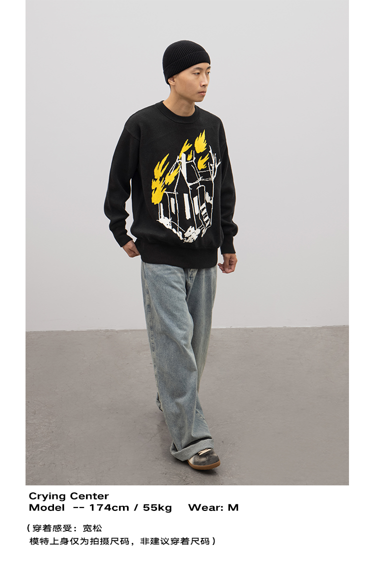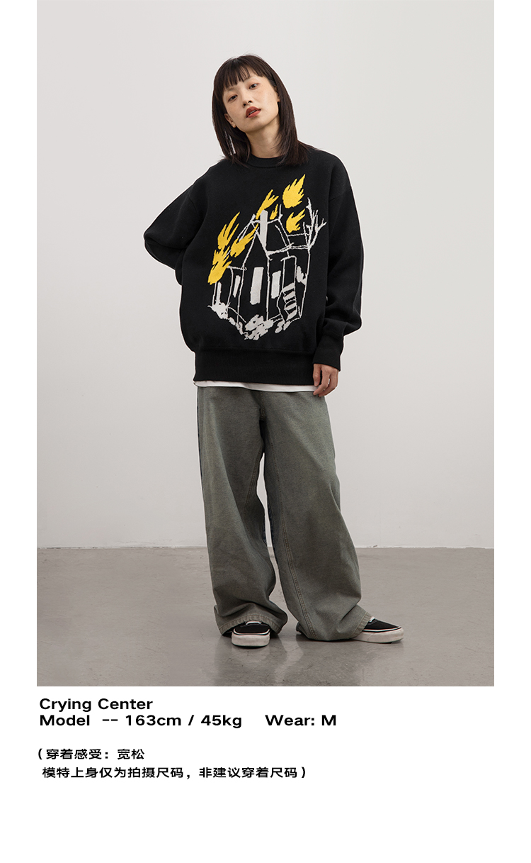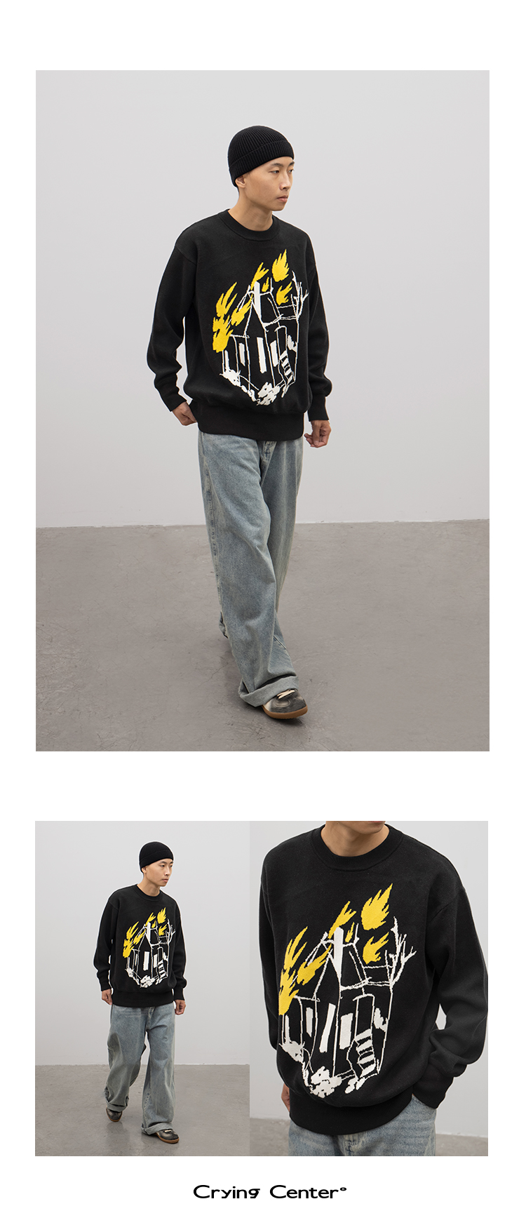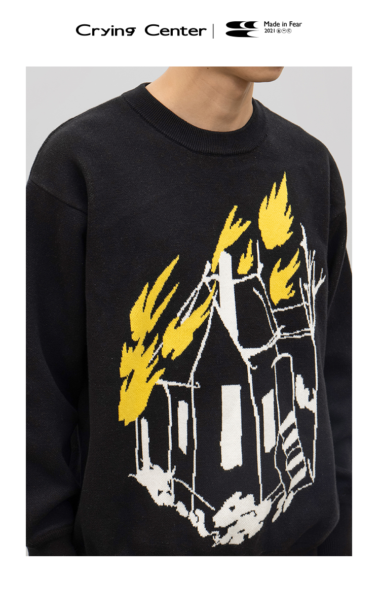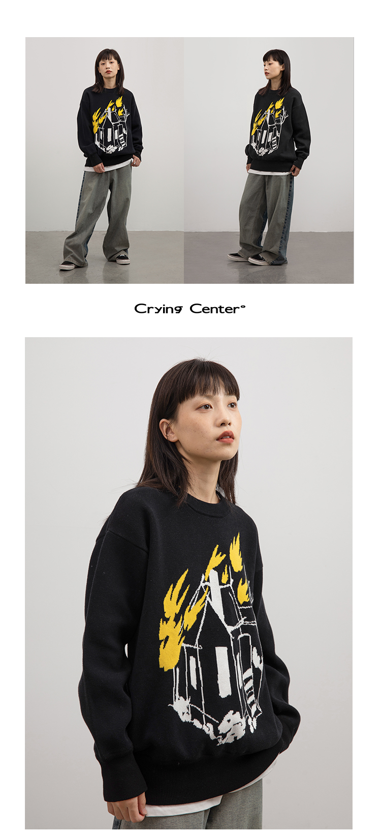 CryingCenter 火焰房子酷酷黑色毛衣宽松百搭个性男女 哭喊中心