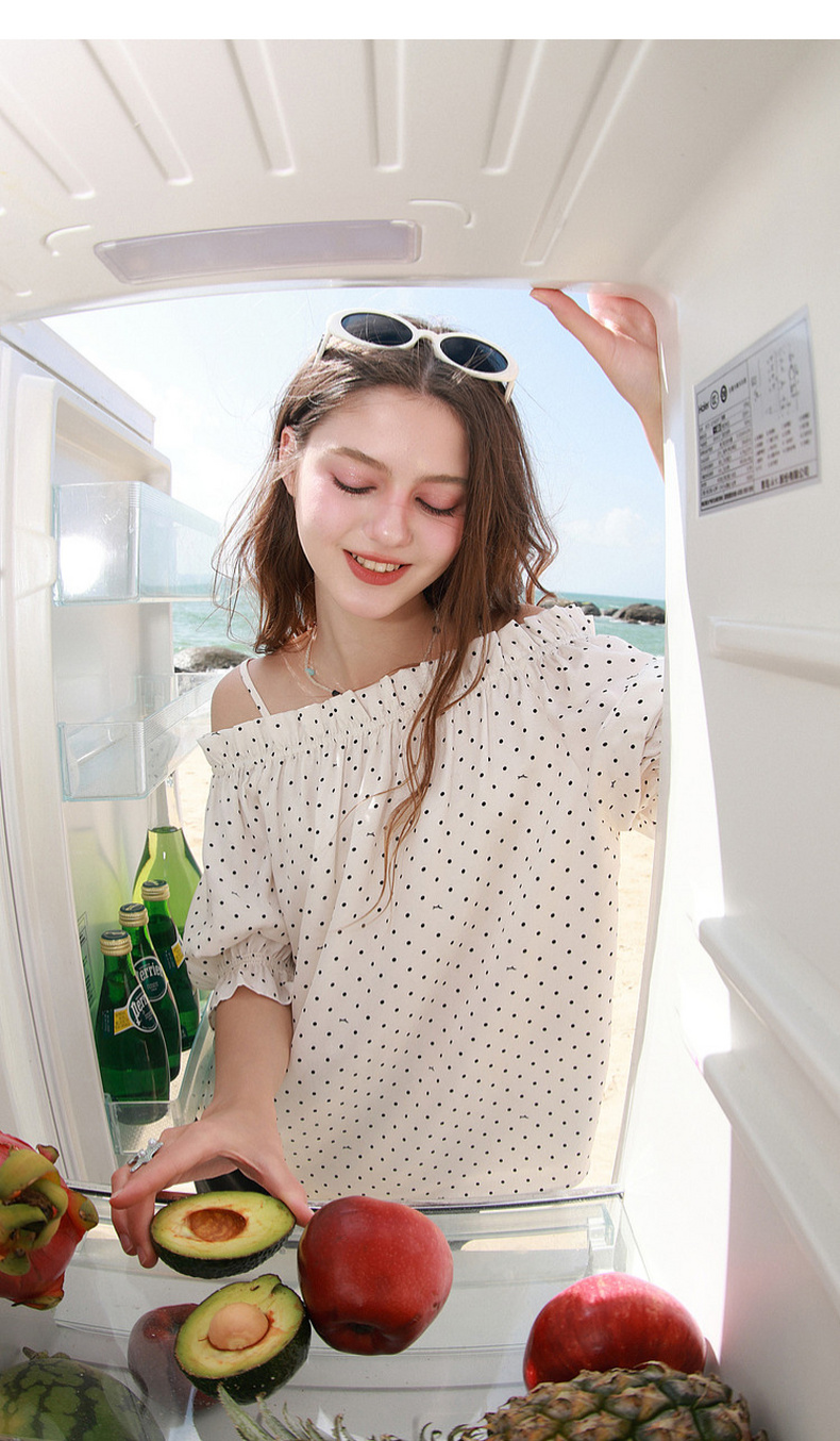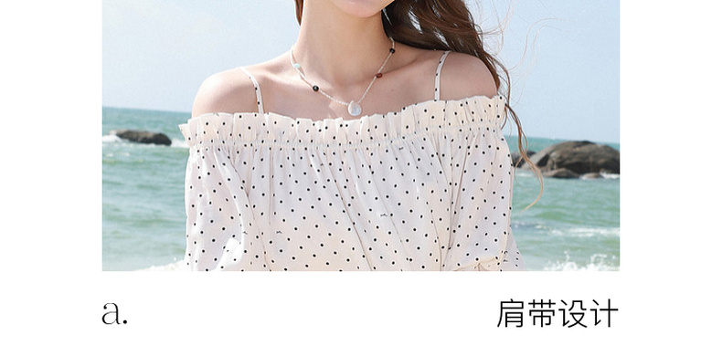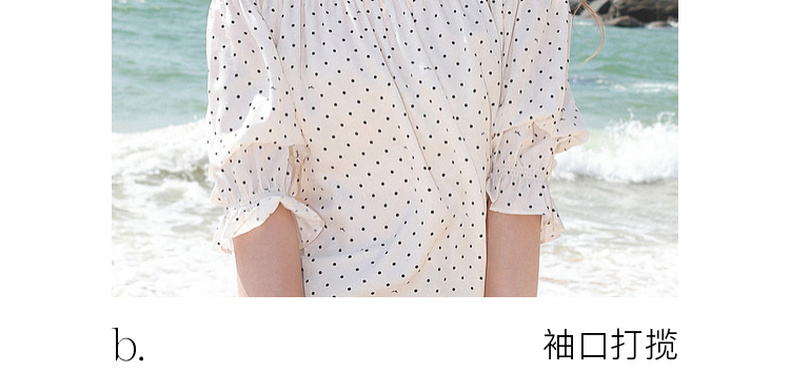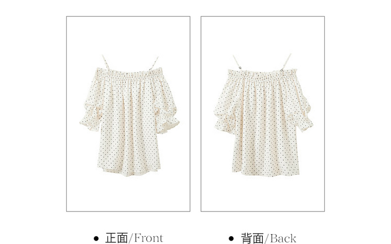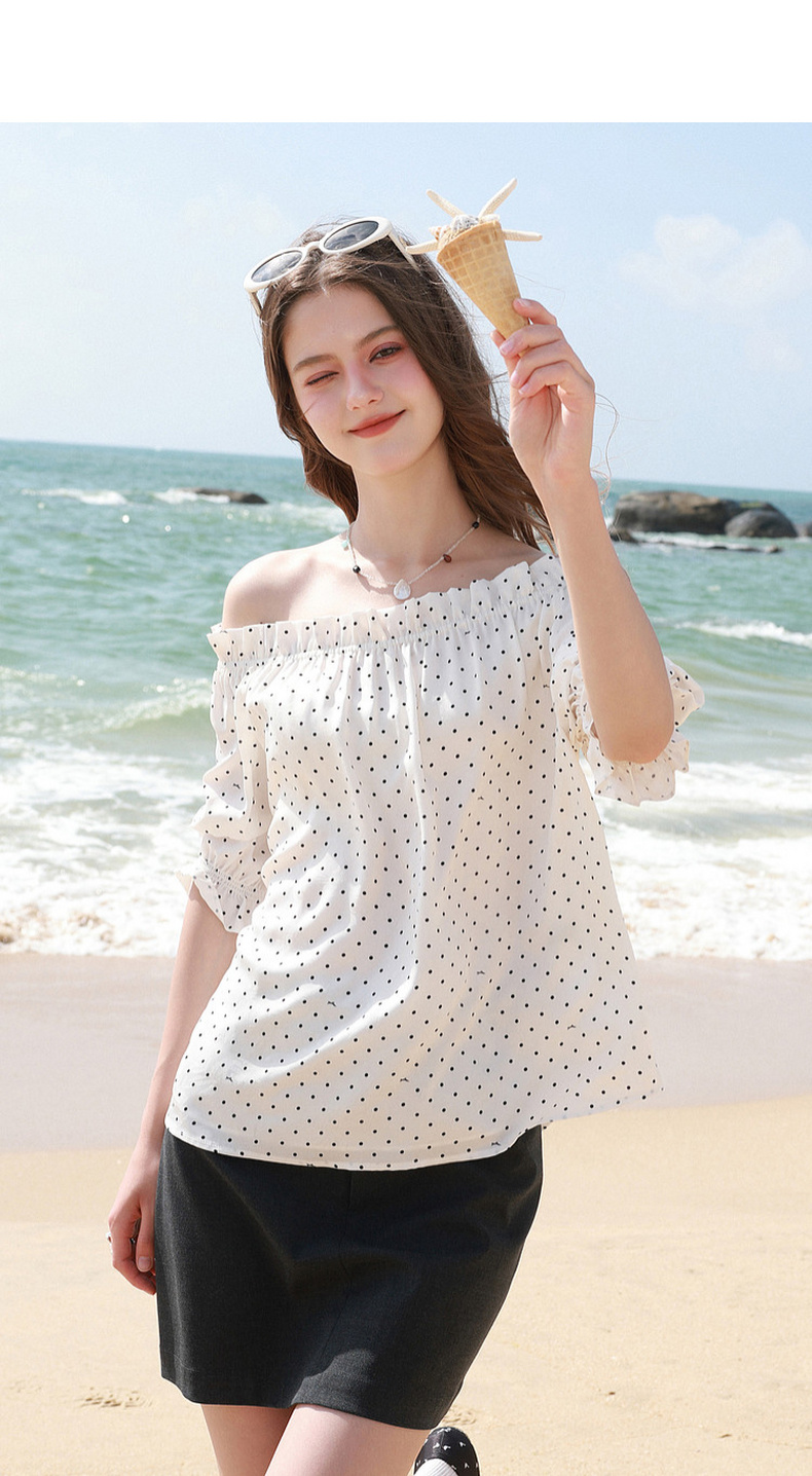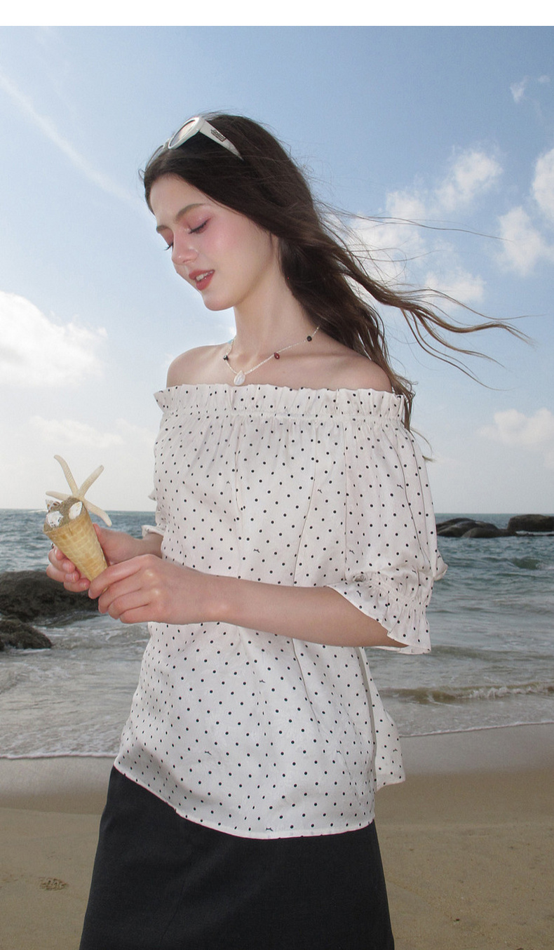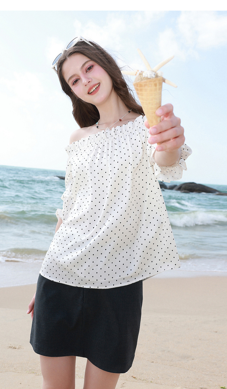 三彩独醒2026夏季新款波点小衫一字领七分袖上衣度假风F