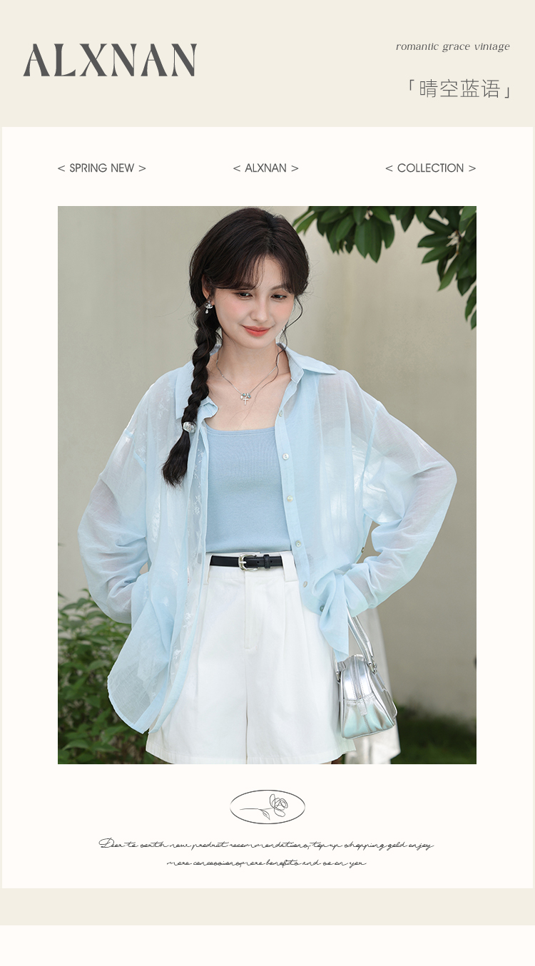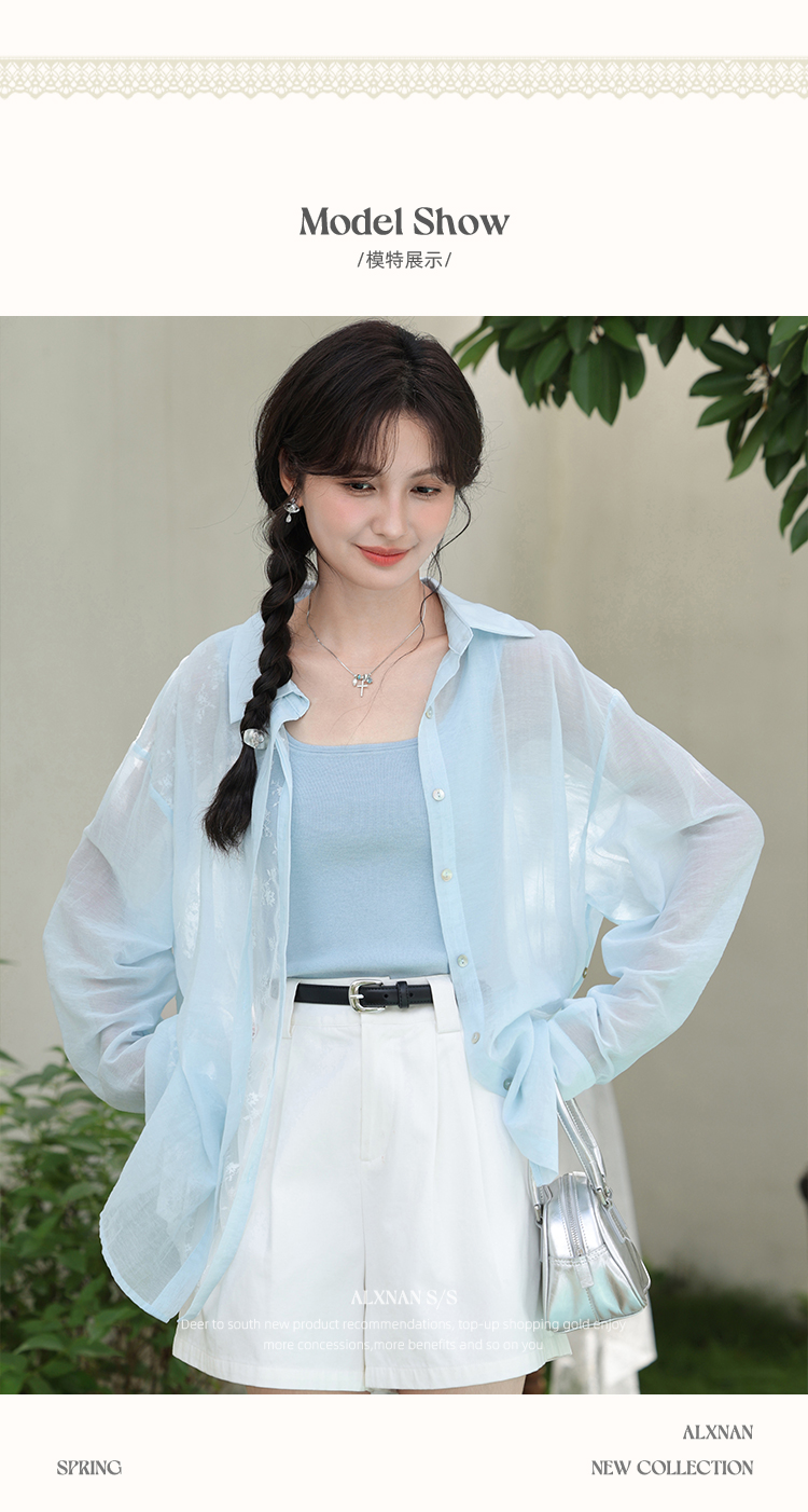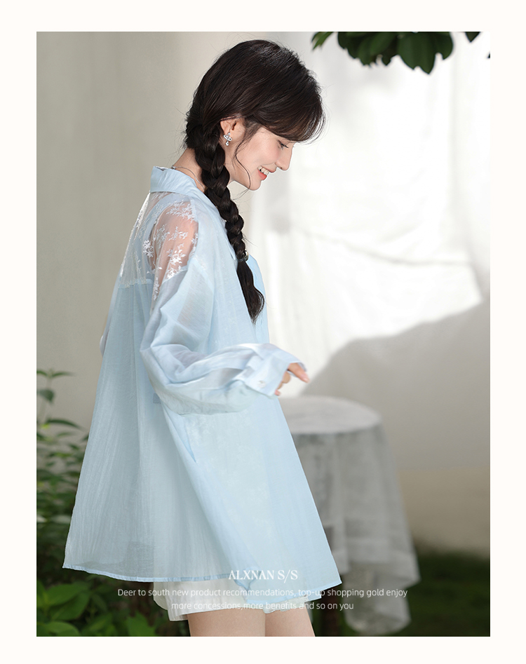 【6折秒杀】鹿向南「晴空蓝语」蓝色轻薄防晒衬衫女夏新款长袖polo领宽松开衫L56306