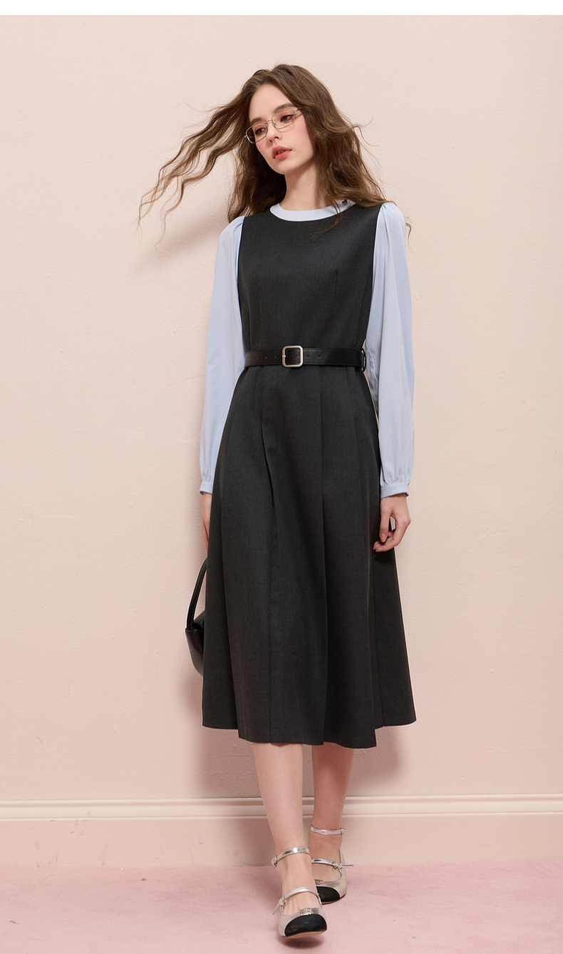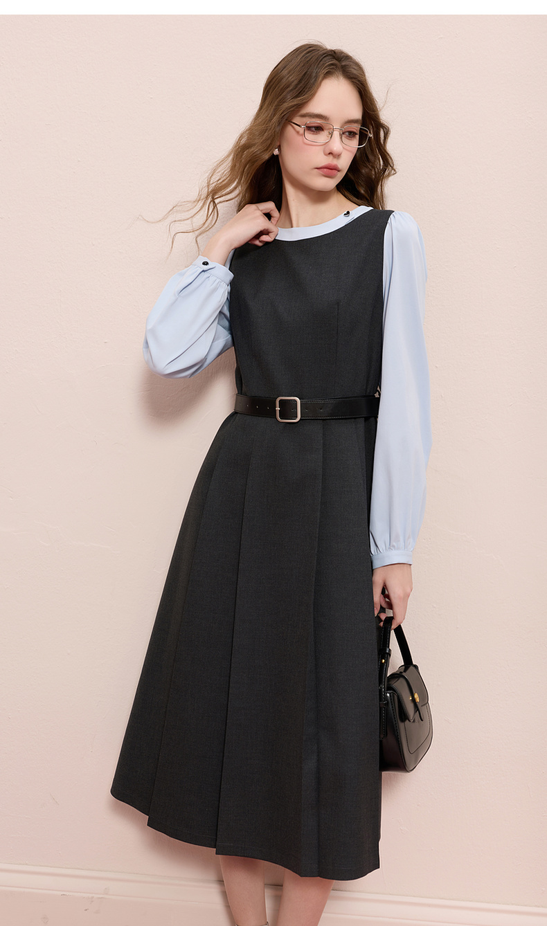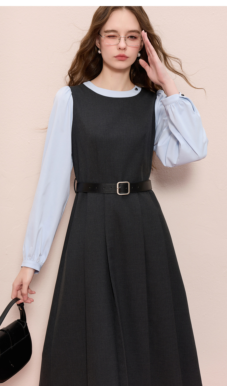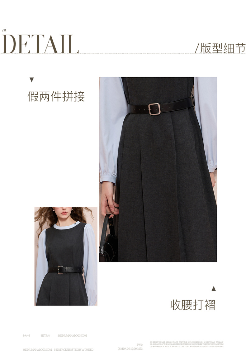 三彩2025冬季新款假两件连衣裙圆领收腰A字裙中长裙M