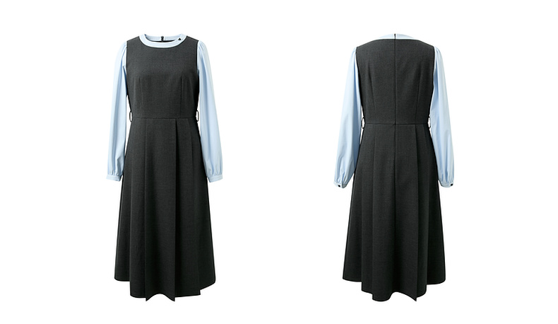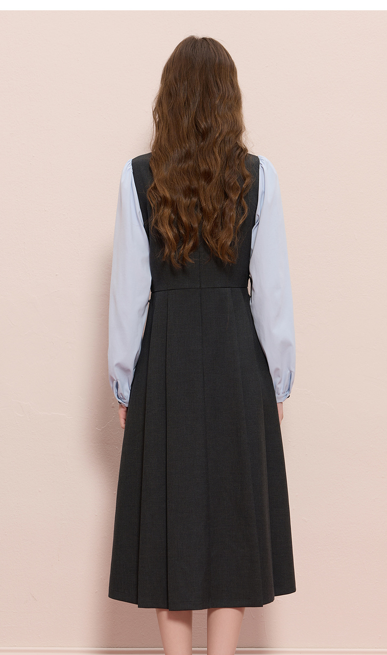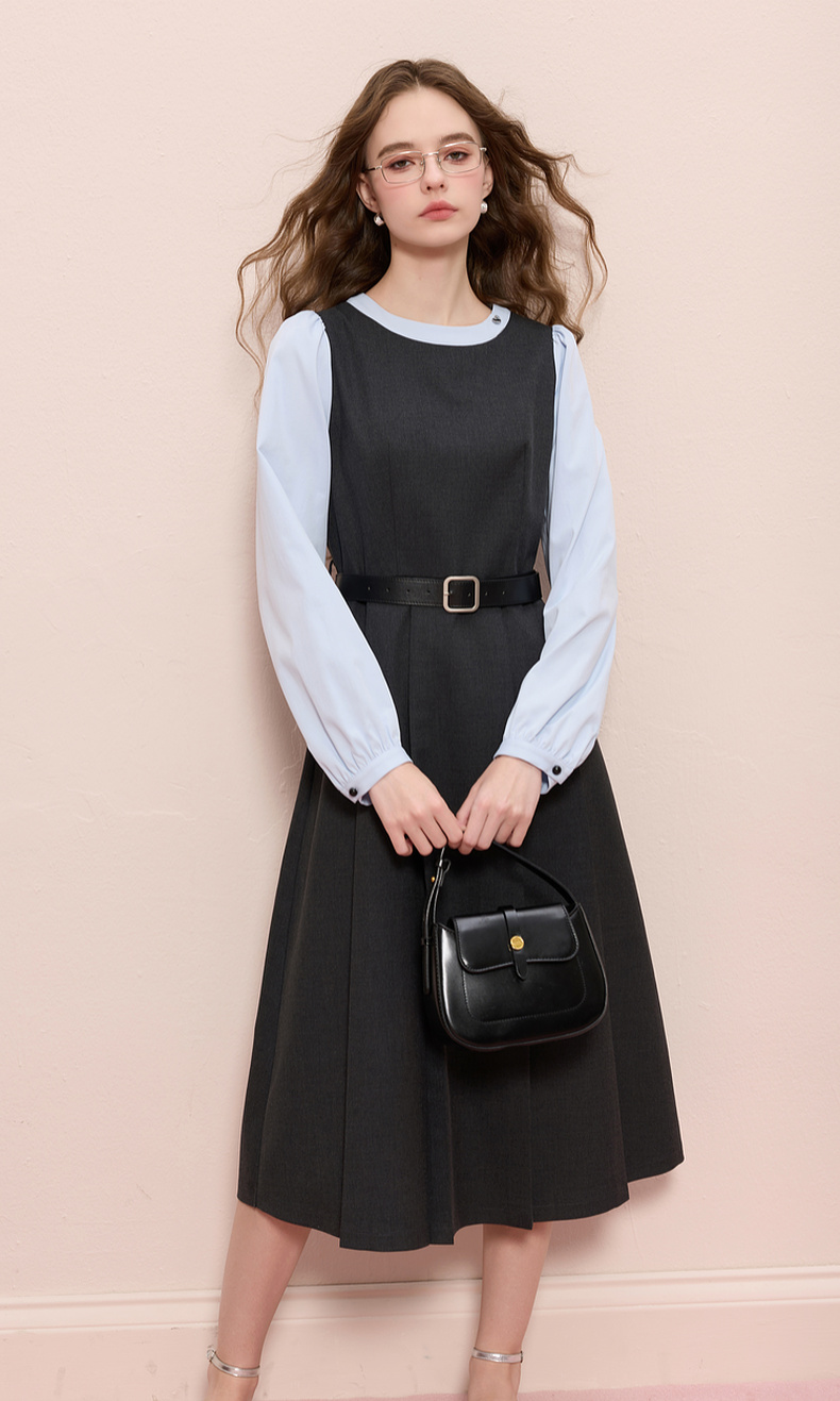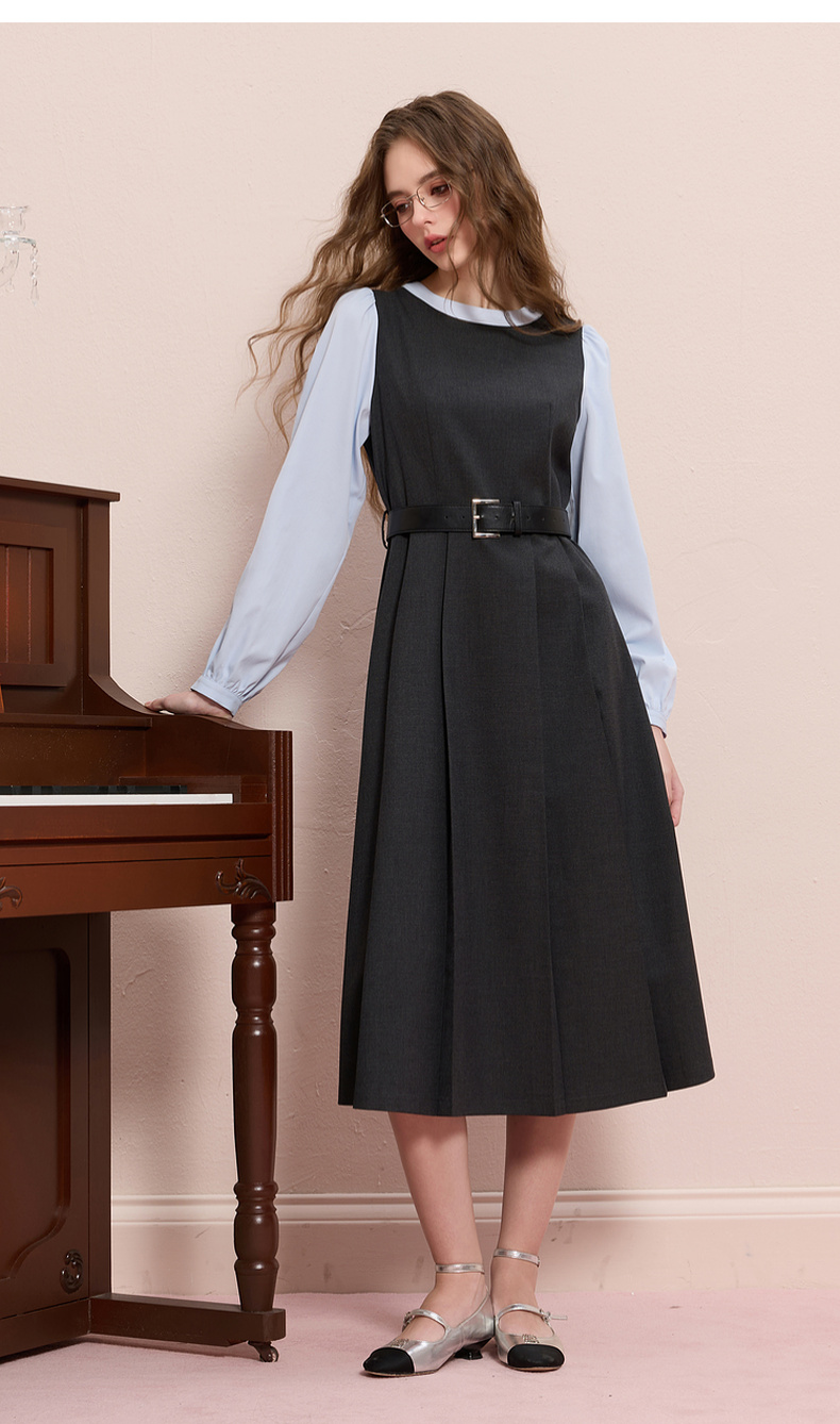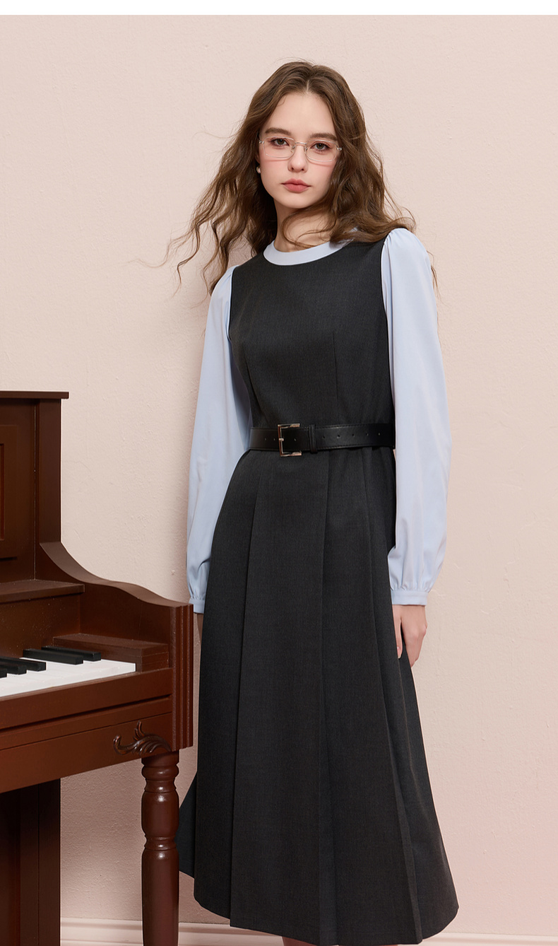 三彩2025冬季新款假两件连衣裙圆领收腰A字裙中长裙M