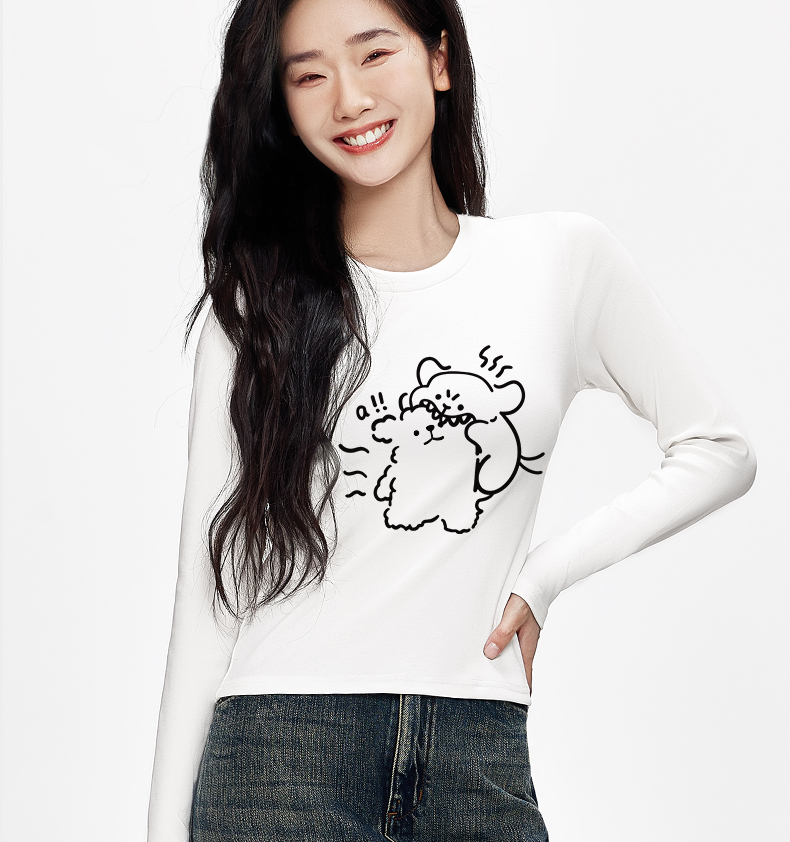 「棉的美学」萌趣小狗长袖打底印花T恤女慵懒休闲风日常百搭上衣