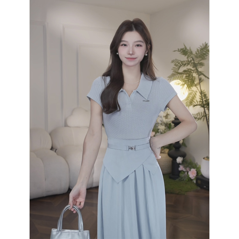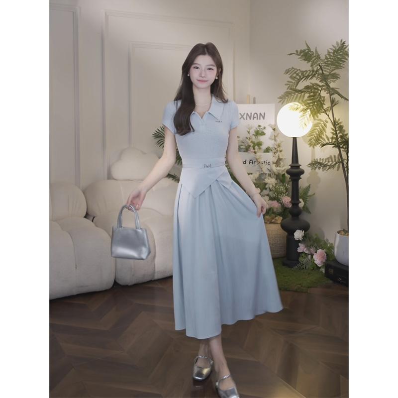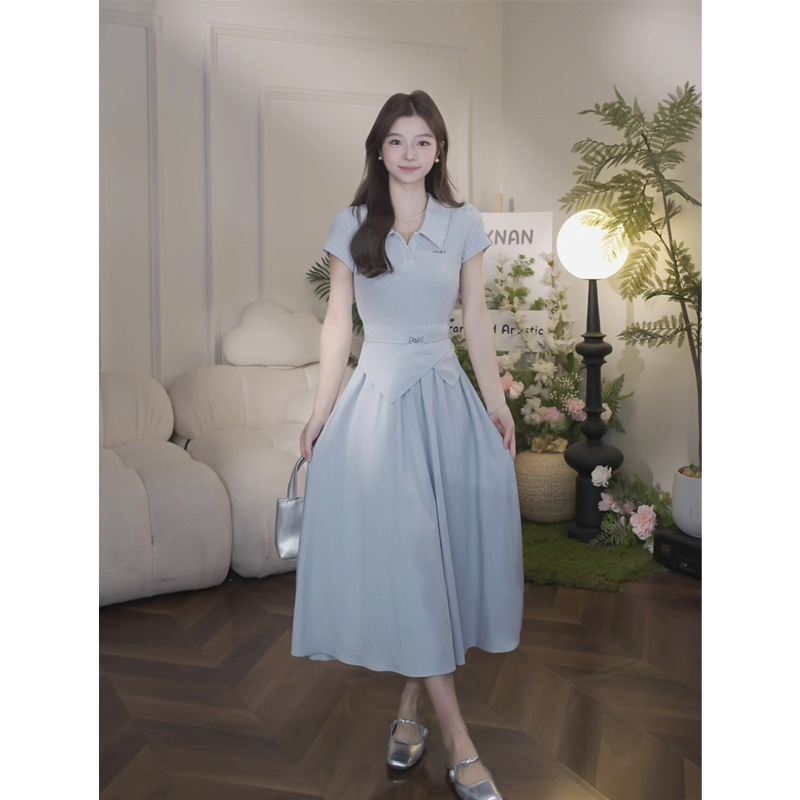 鹿向南「怦然心动」夏季气质假两件女连衣裙设计感高腰正肩长裙子