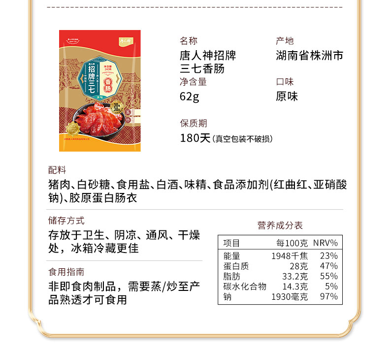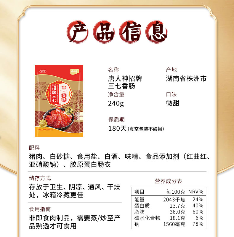 【广式腊肠】唐人神 招牌三七香肠 240g*2包