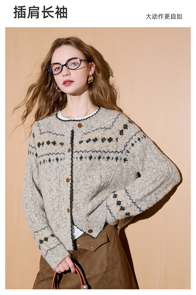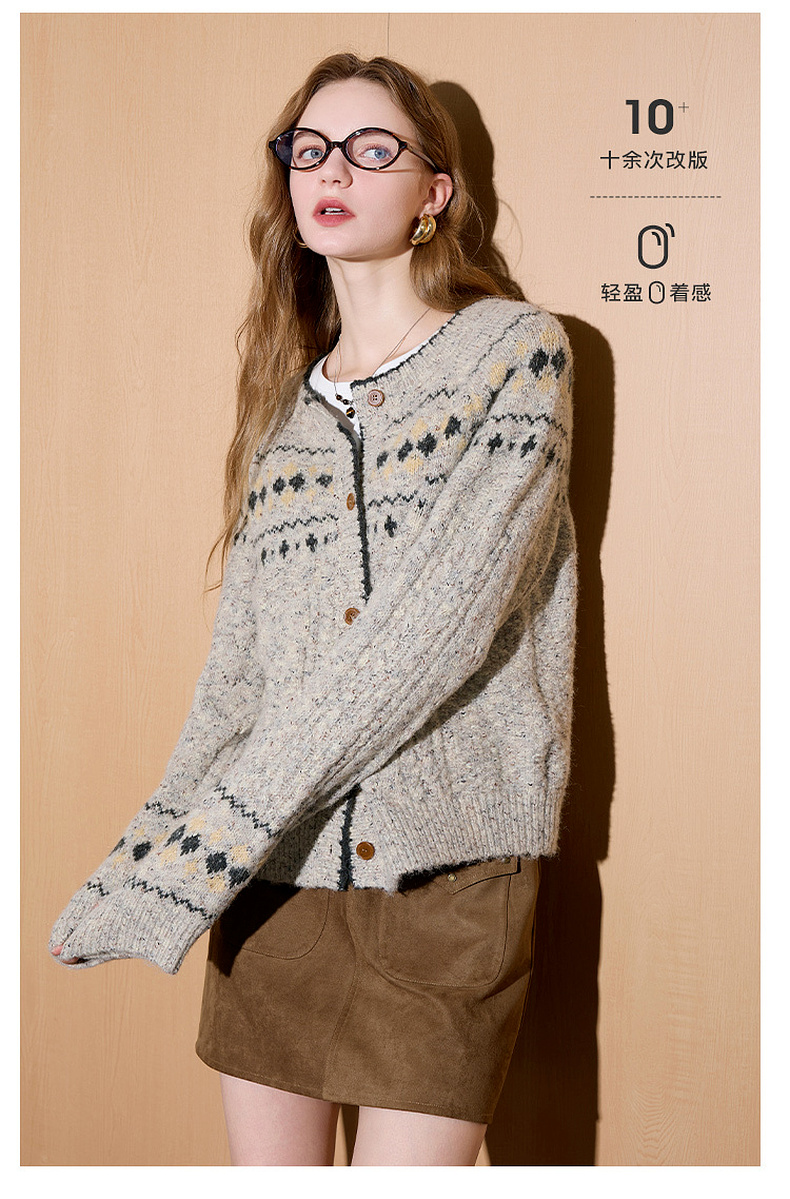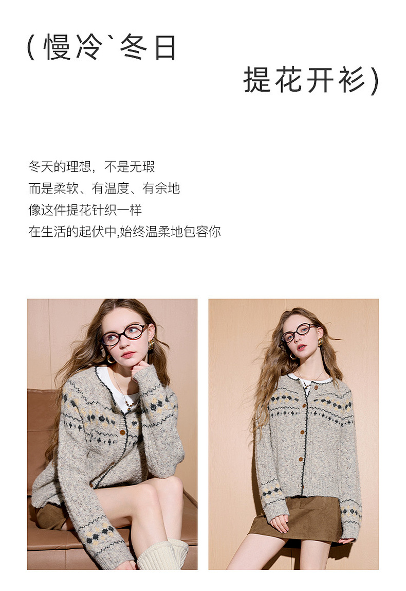 三彩2026春季新款宽松慵懒提花针织衫长袖单排扣开衫复古外套M