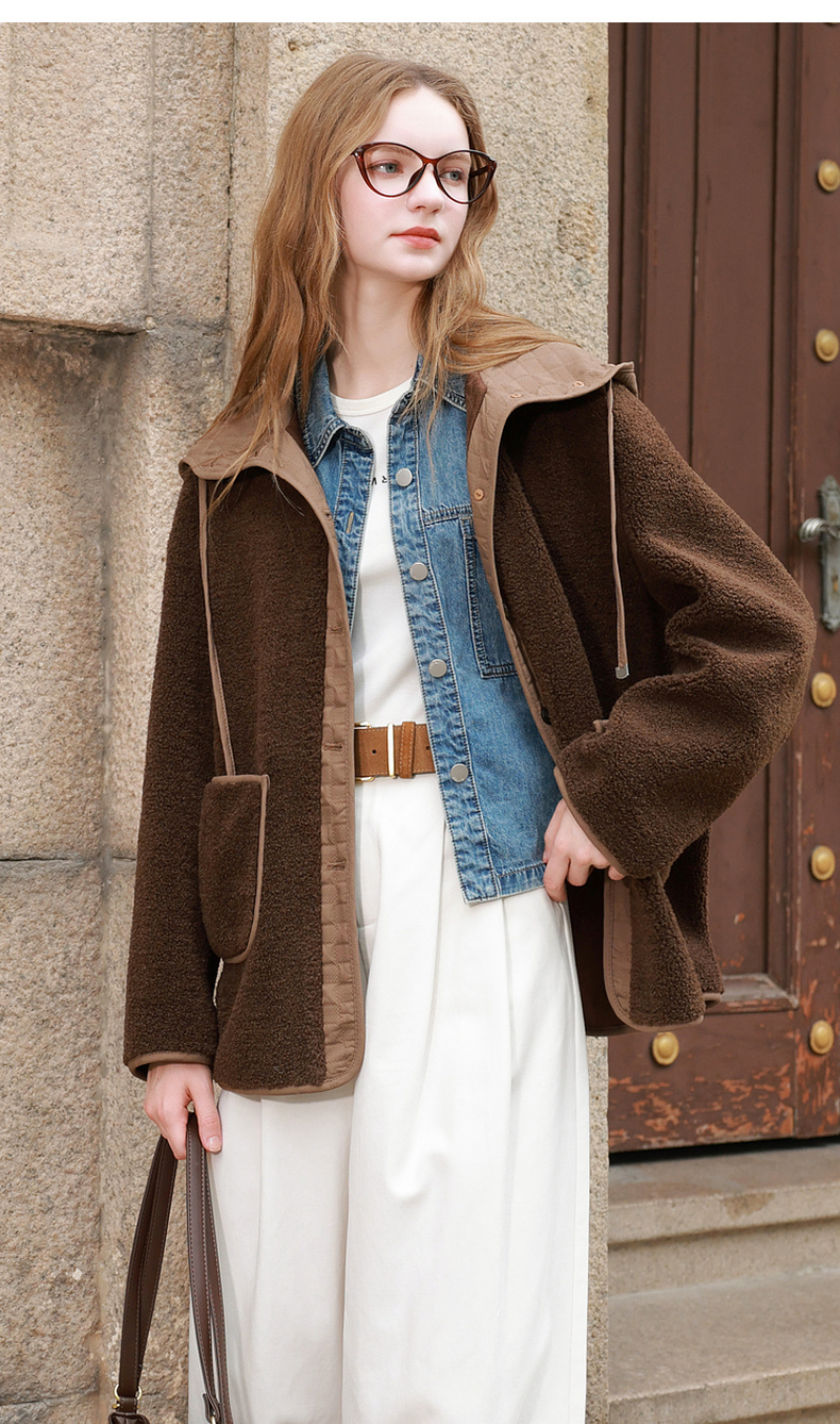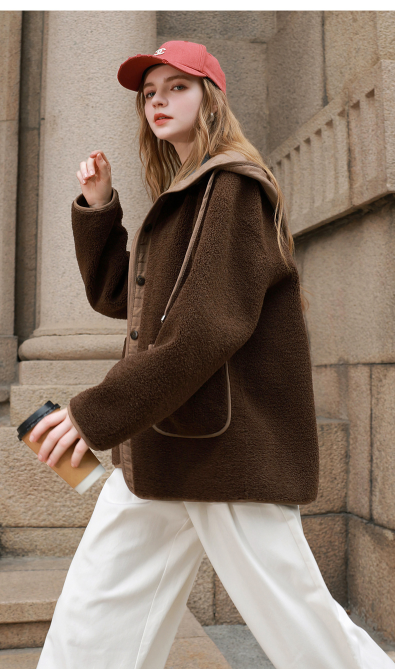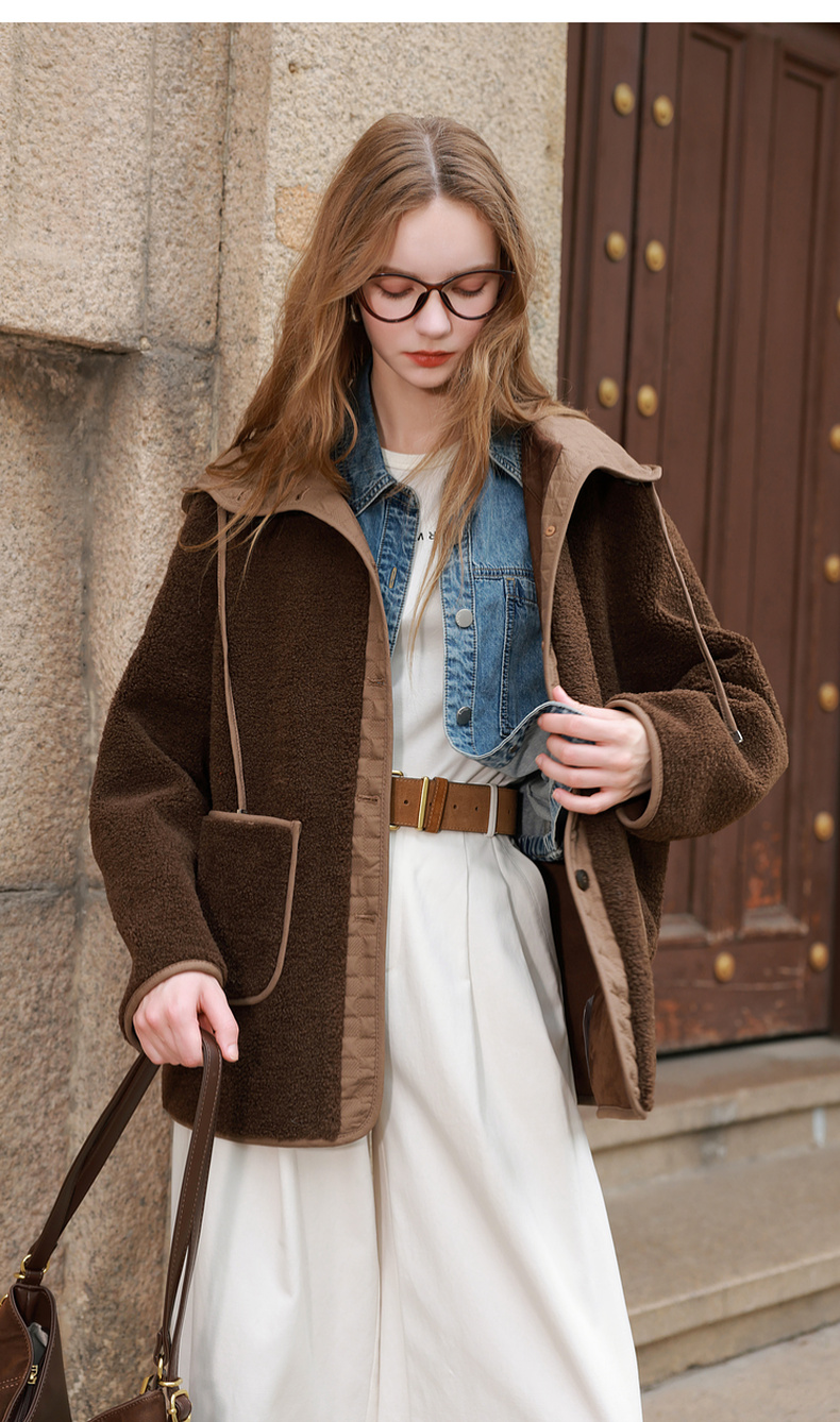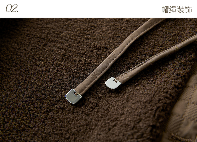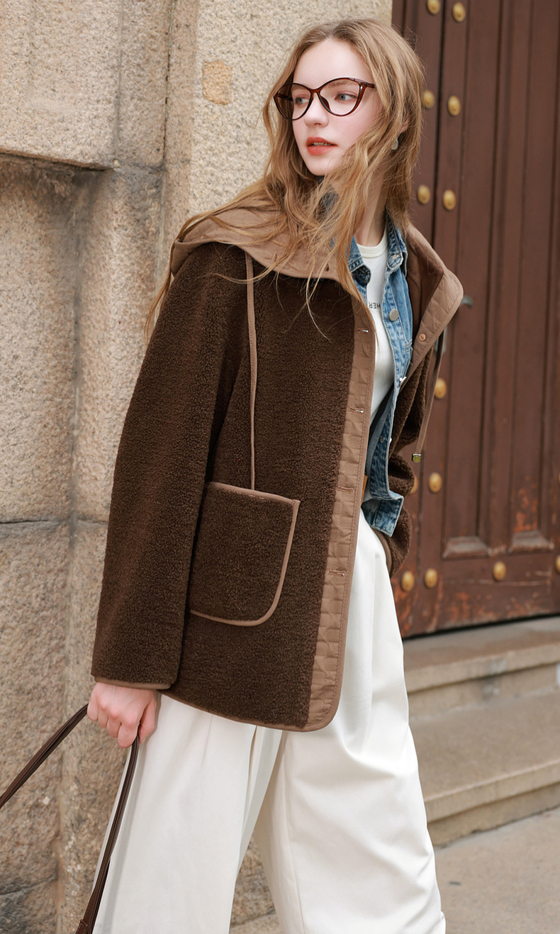 三彩2025冬季新款环保皮草连帽拼接毛毛外套宽松保暖M